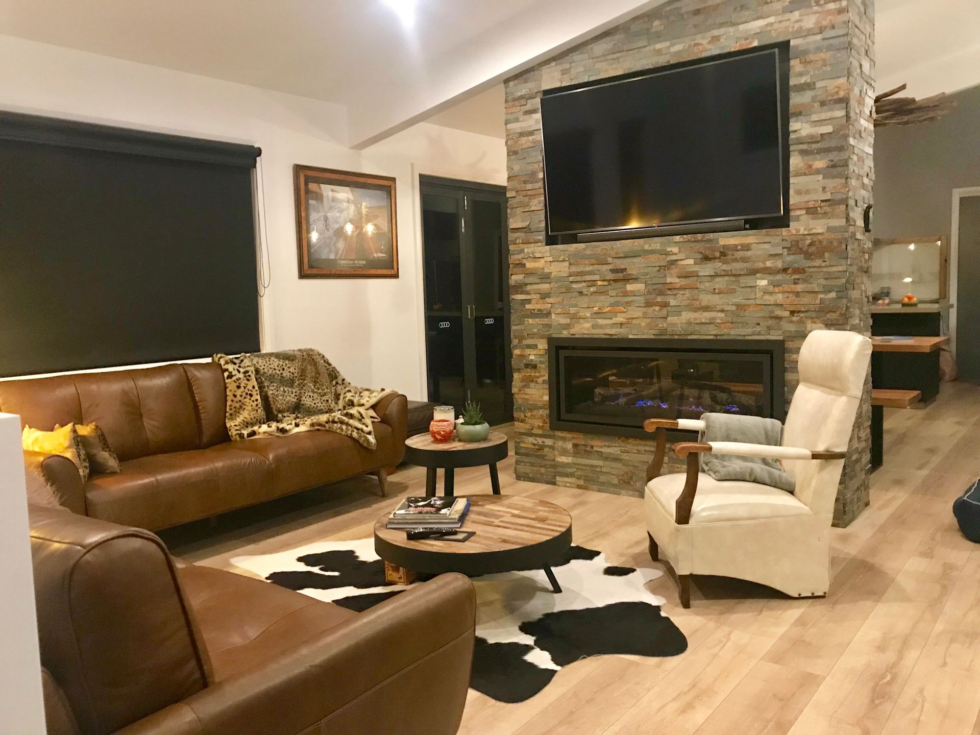 The home is divided into two separate levels, the upper level boasts full kitchen with new 900mm freestanding gas stove, convection microwave, dishwasher, coffee machine, a dining room with seating for 8 people, large bi-folding doors out to a West facing 8m x 2.5m deck overlooking a gully of Moonah Trees and Webber BBQ, a super stylish lounge room with new Italian leather sofas, reverse cycle air conditioning plus a gorgeous double sided gas log fireplace.