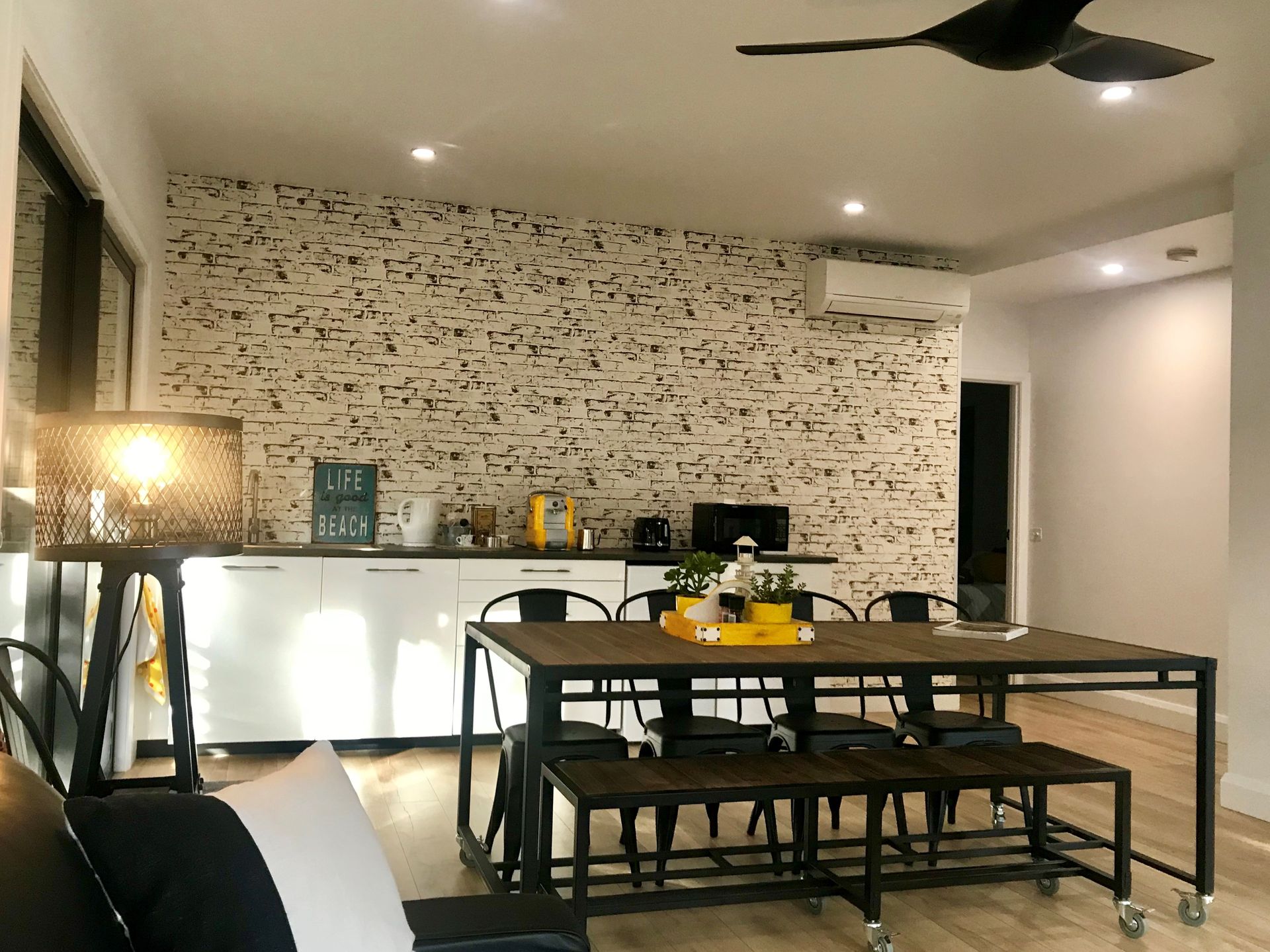 The living area has another Smart TV and DVD player (we have over 100 DVD’s to choose from), leather lounge with plenty of seating, dining table with seating for 8, kitchenette/wetbar, with microwave, fridge, dishwasher, another coffee machine, kettle and toaster, plus all the plates, cups, glasses and cutlery you need. NO cooking facilities.