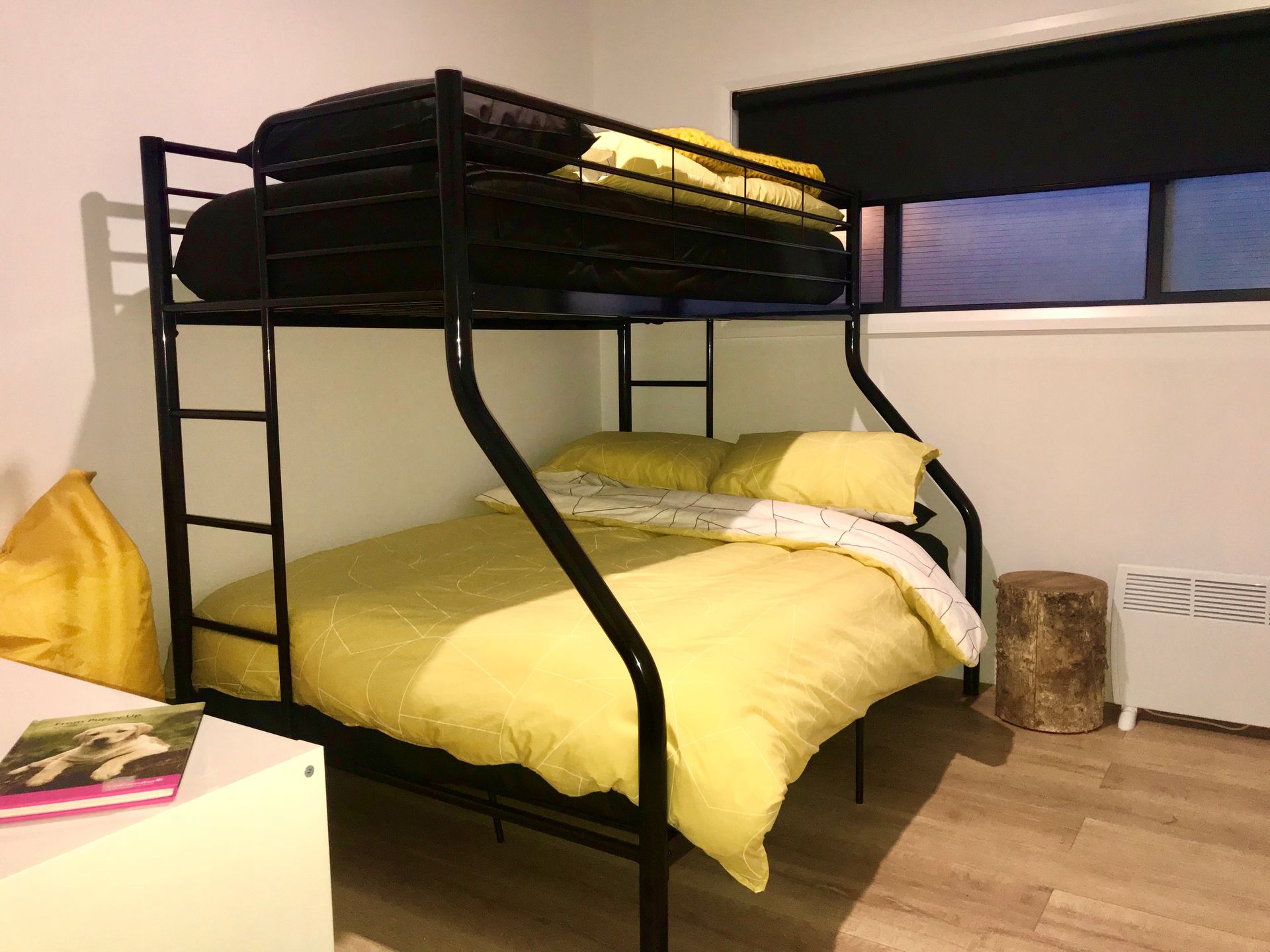Then there is a bedroom with a new Queen size bed, robe, quiet DC ceiling fan and view through the trees. Another bedroom has a bunk bed with double mattress below and single above, perfect for the kids or for parents with a young child.