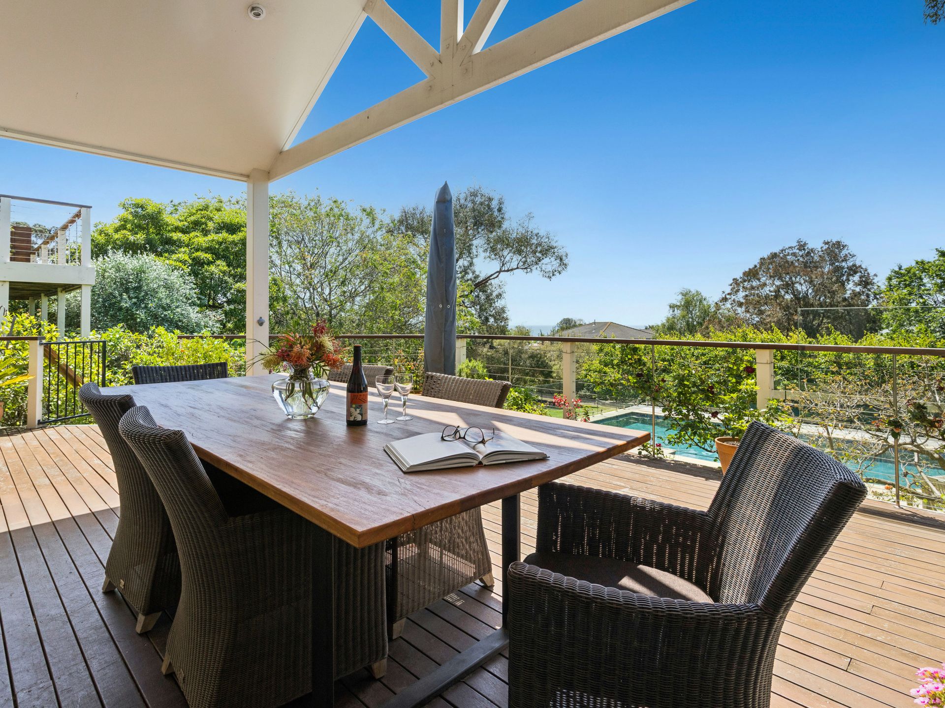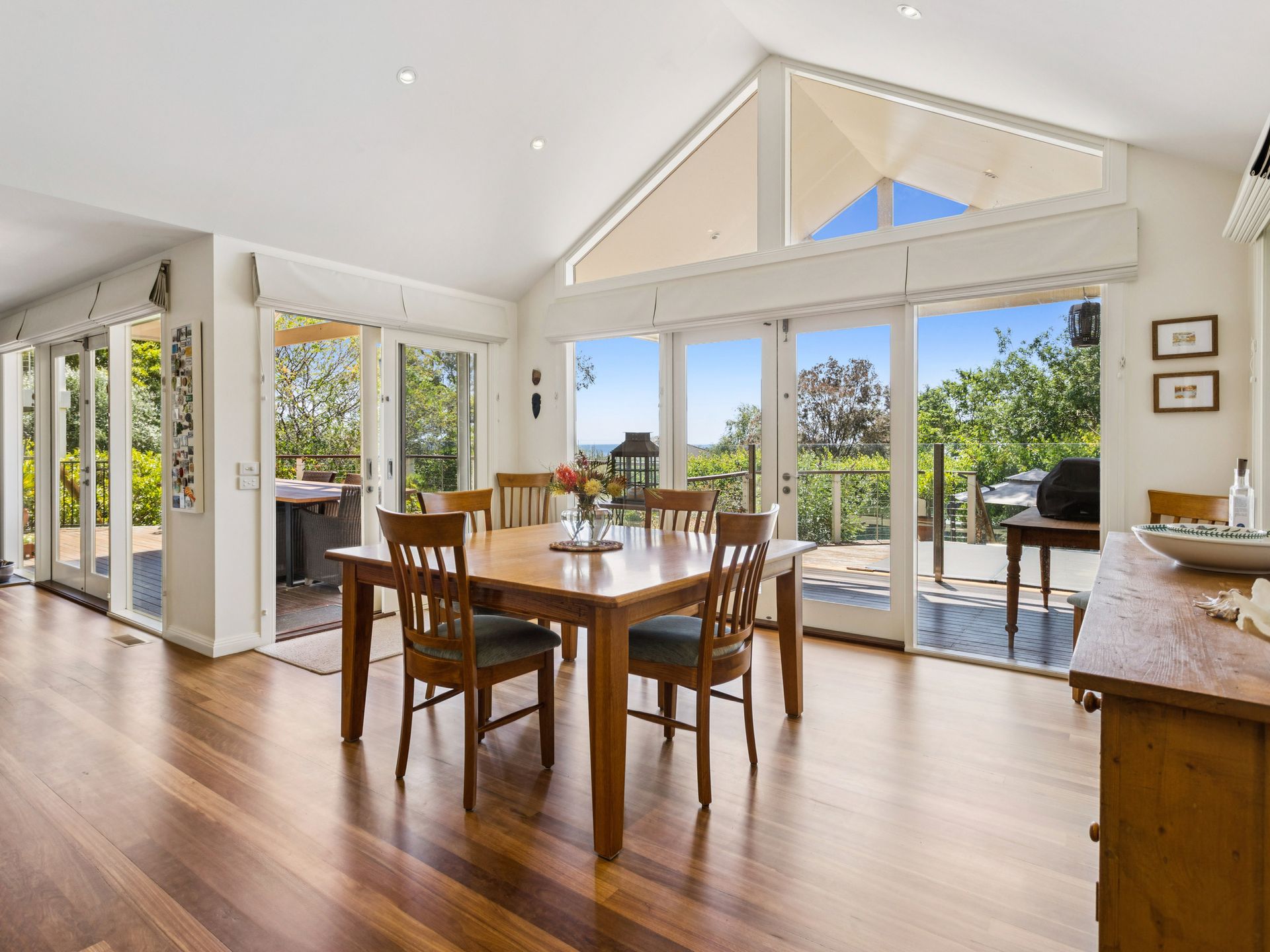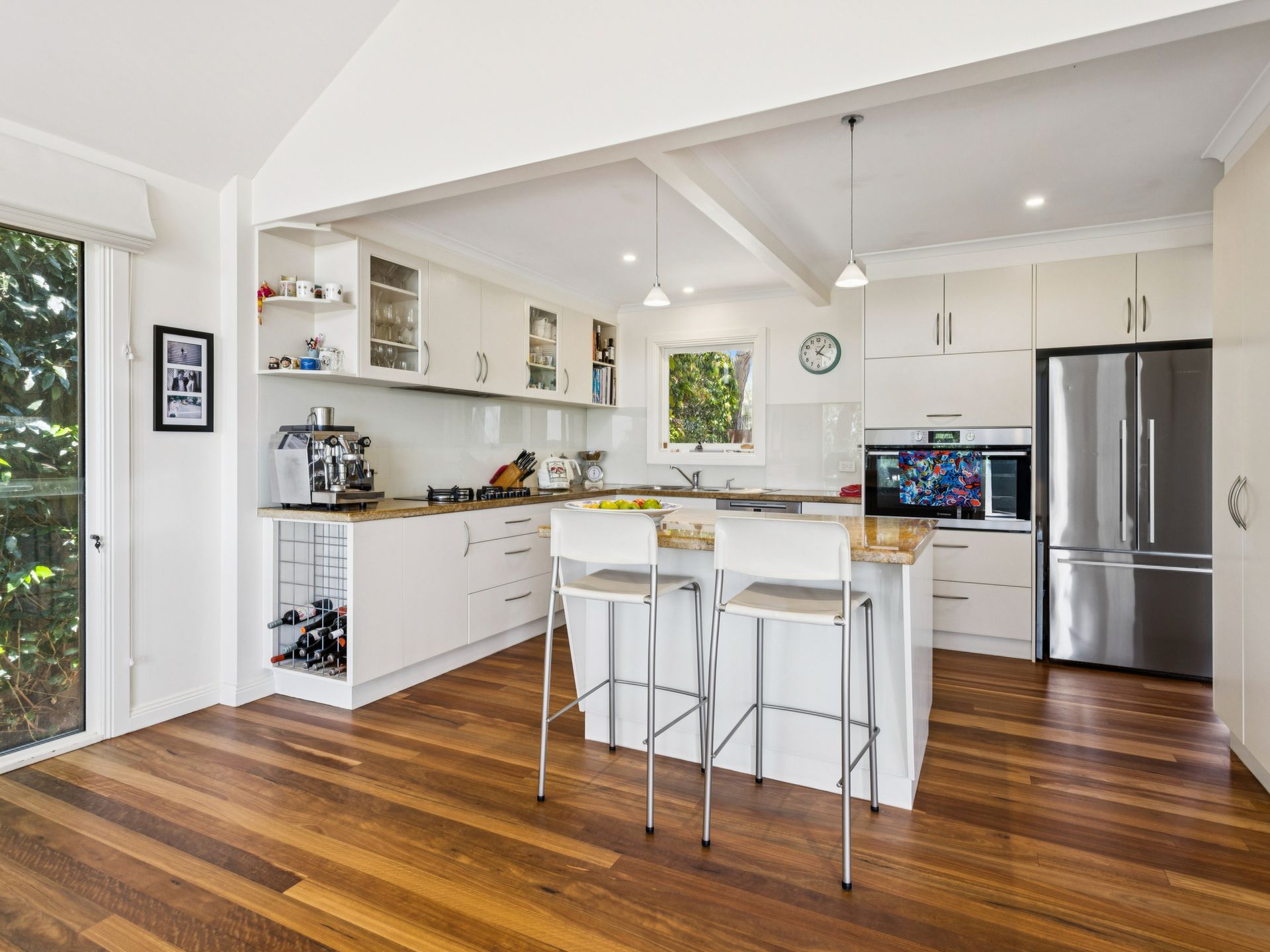 The fully equipped chef’s kitchen includes modern appliances and a coffee machine, while outside, the Bbq and alfresco dining area pair perfectly with serene bay glimpses and long summer evenings.