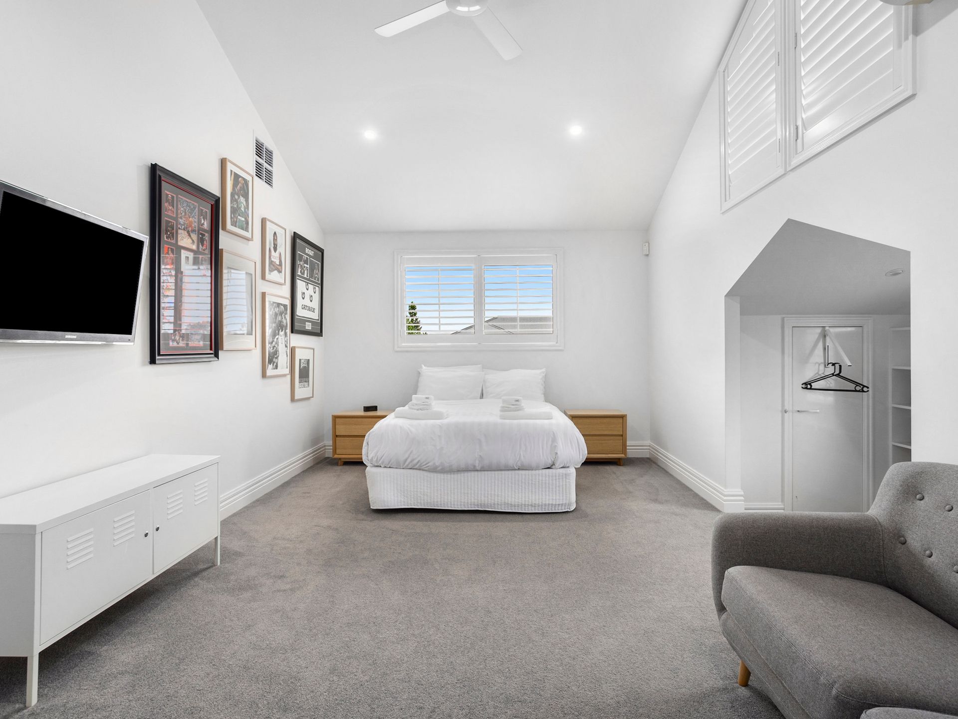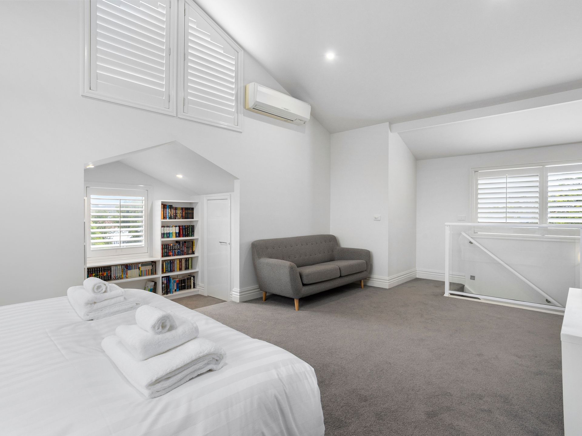 The long carpeted staircase leads you up to the extra large attic inspired playroom/bedroom which has a split system air conditioner and ceiling fan. This room has a queen bed.