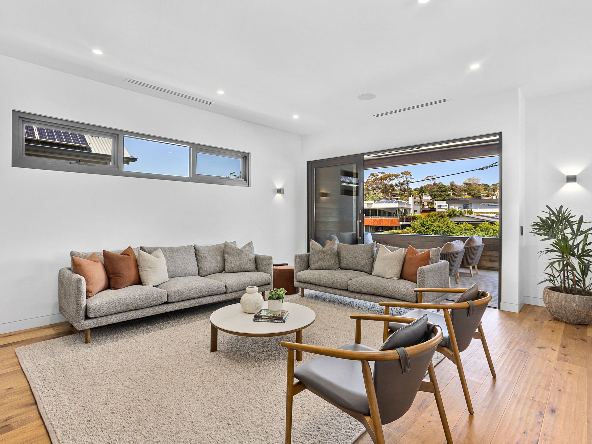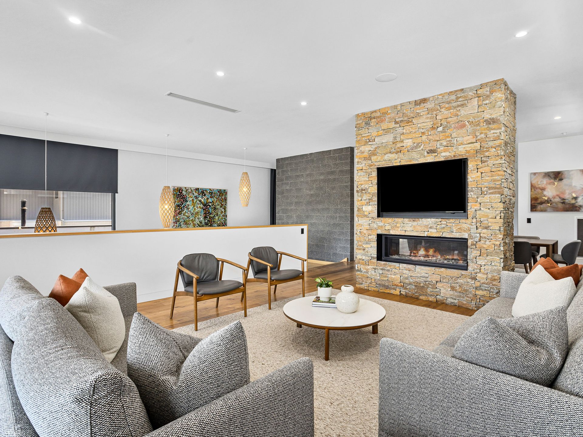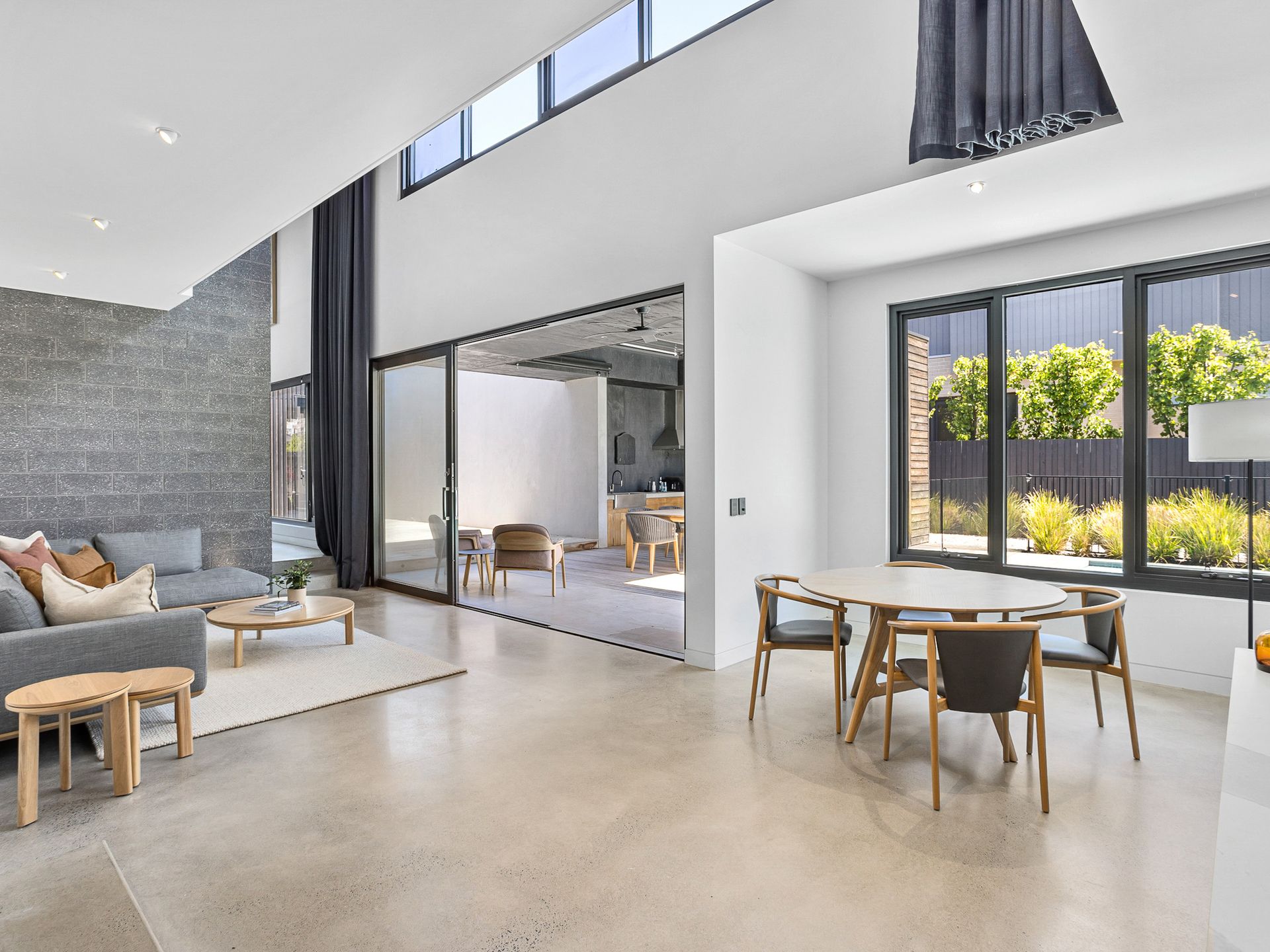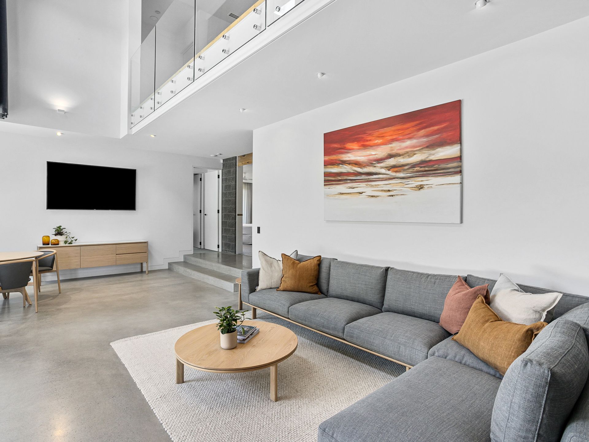 Enter on ground level onto heated polished concrete and walk through to 2nd Living area with Couches and wall mounted Smart Tv.