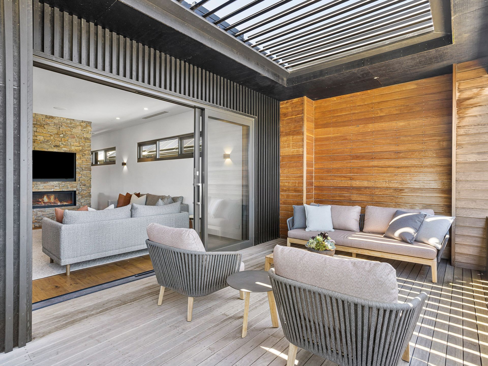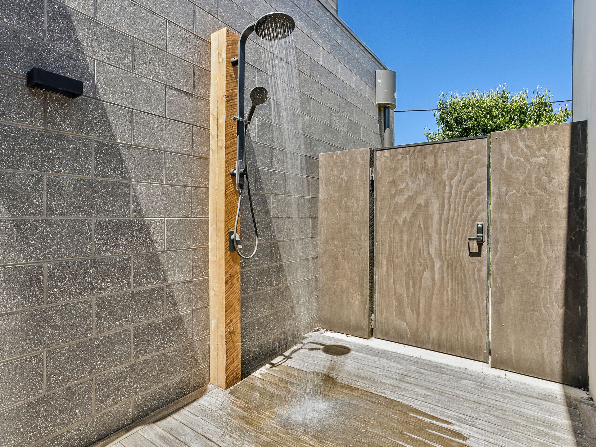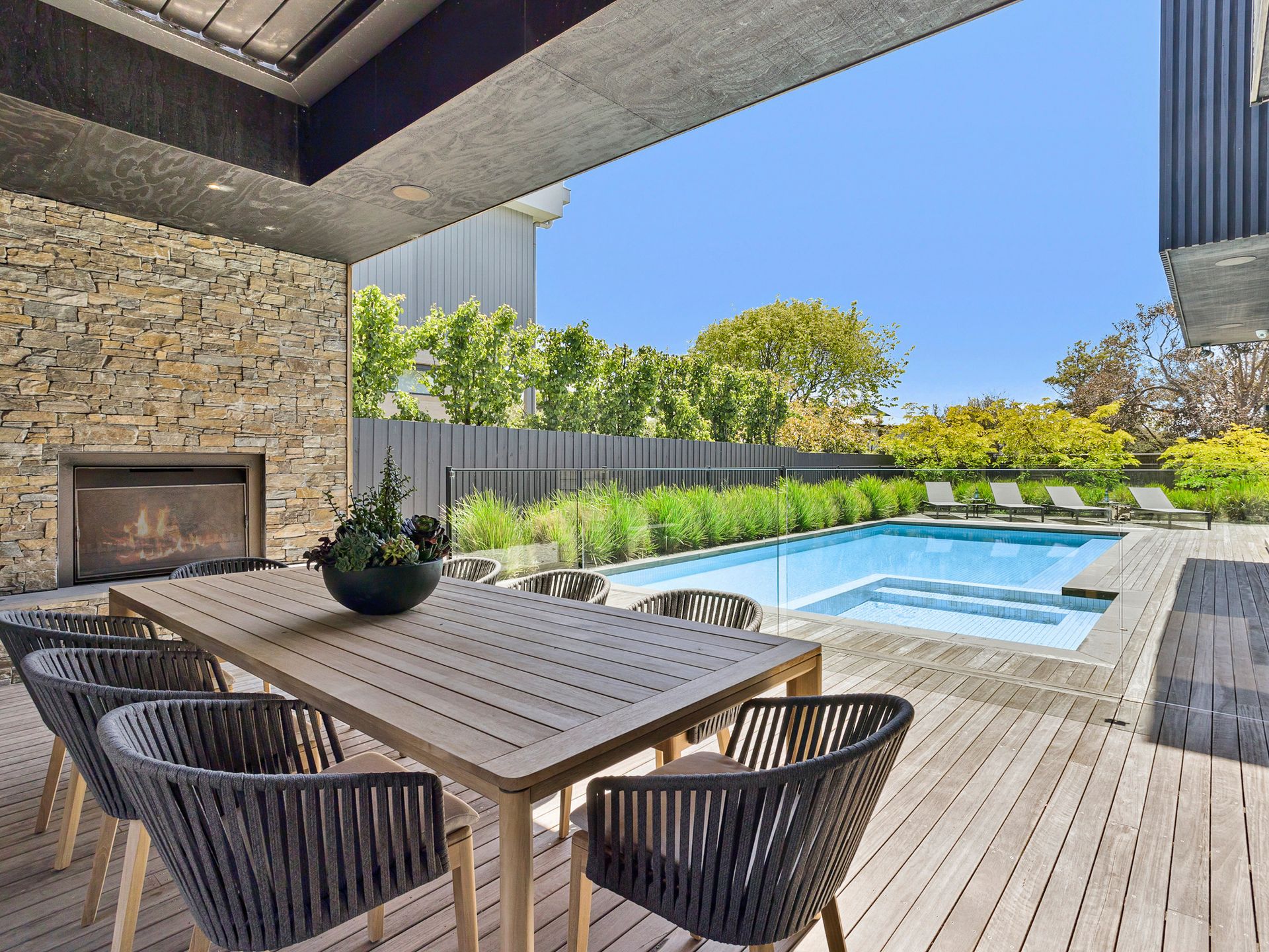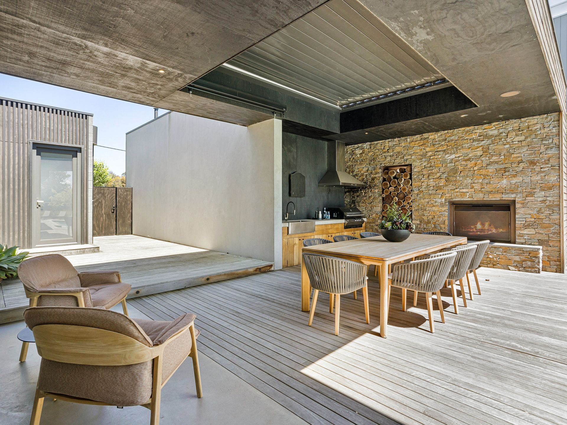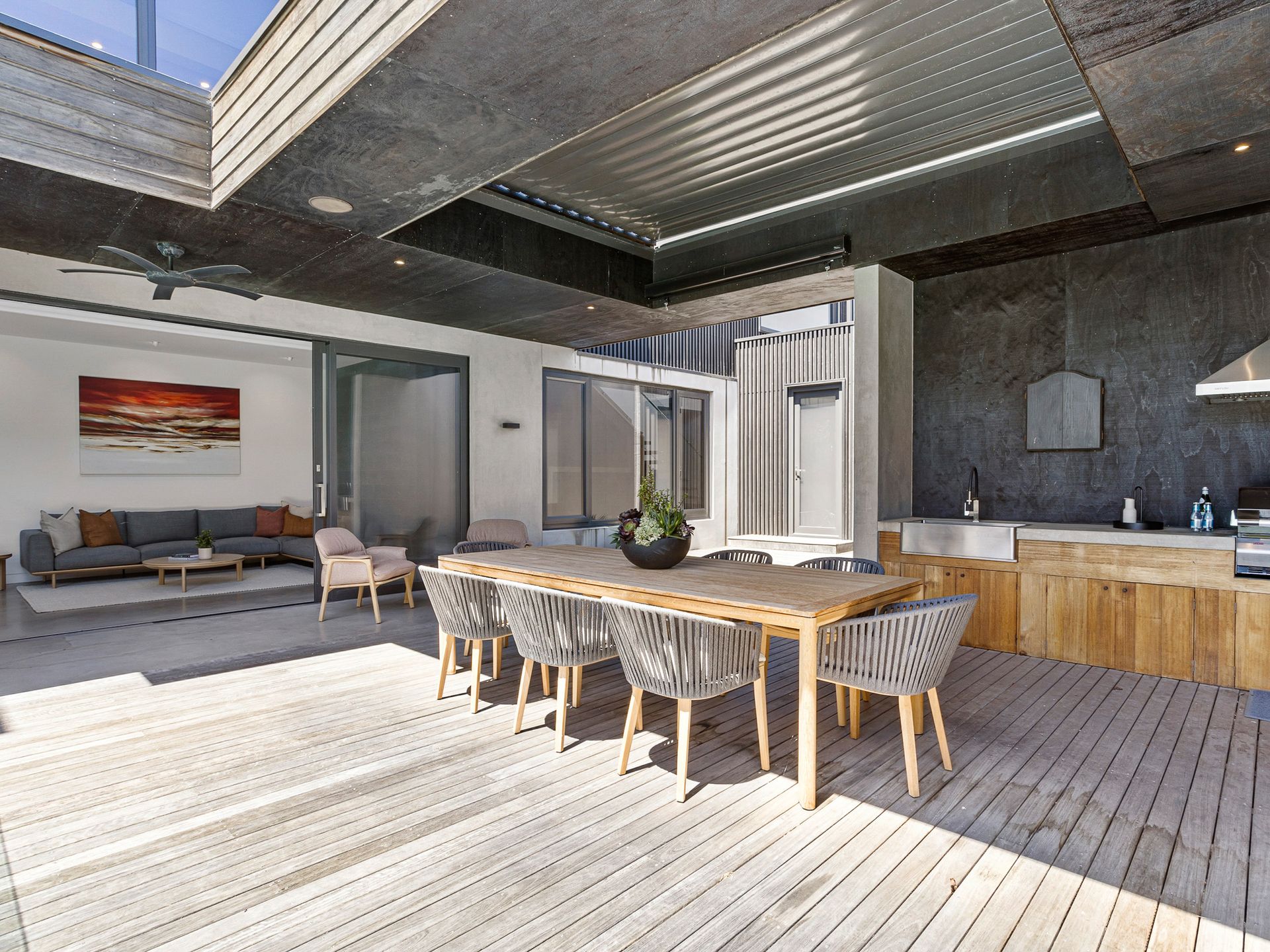 Walking out from the 2nd Living area through large sliding doors to the outdoor entertaining zone, with dining table that seats 8, large BBQ, sink and outdoor fireplace. Roof opens and closes via remote control, and there is an outdoor shower for beach return.