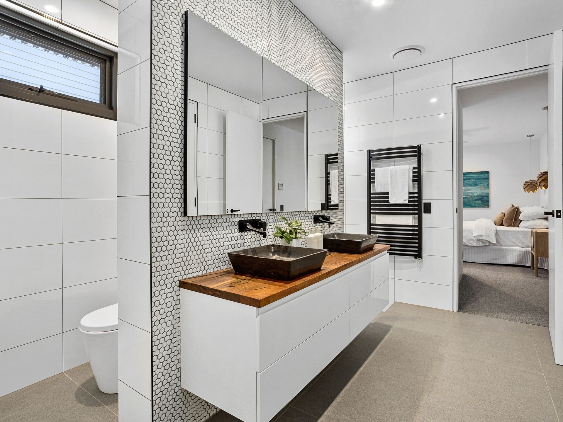 Family Bathroom (shared between Bedrooms 3 & 4) with toilet, 2 sinks, shower and heated towel rails