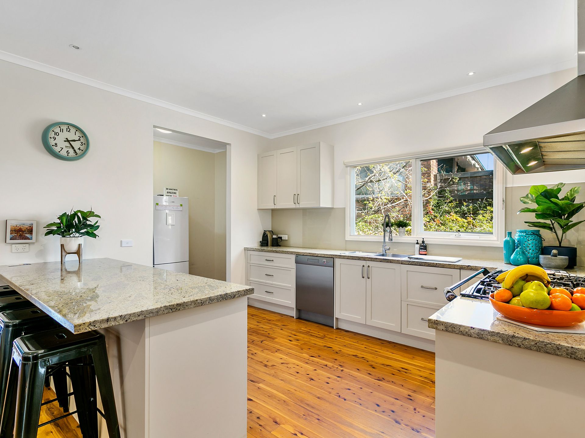 Kitchen has Island bench with 4 stools, all modern appliances including microwave and coffee machine (pods)