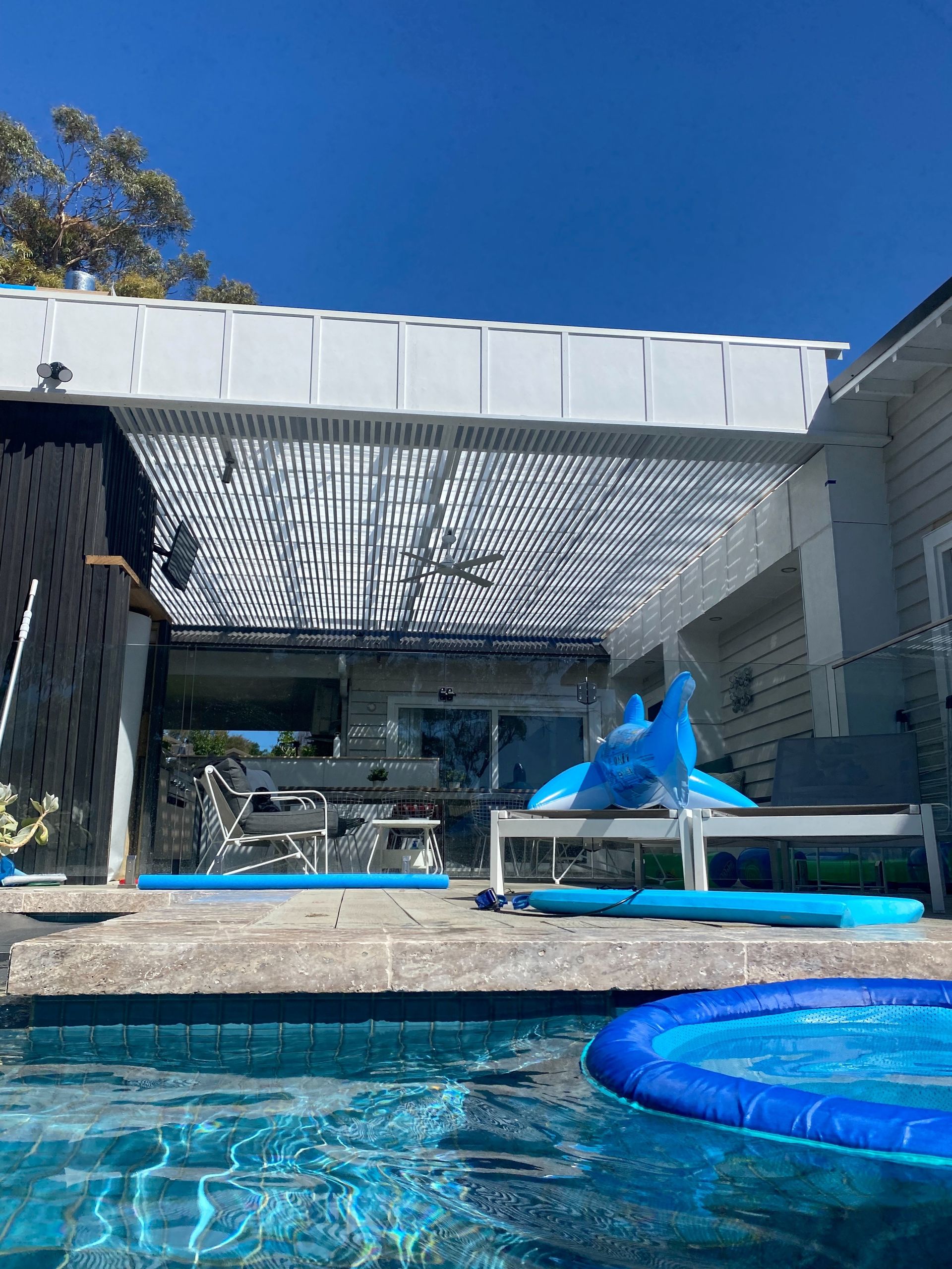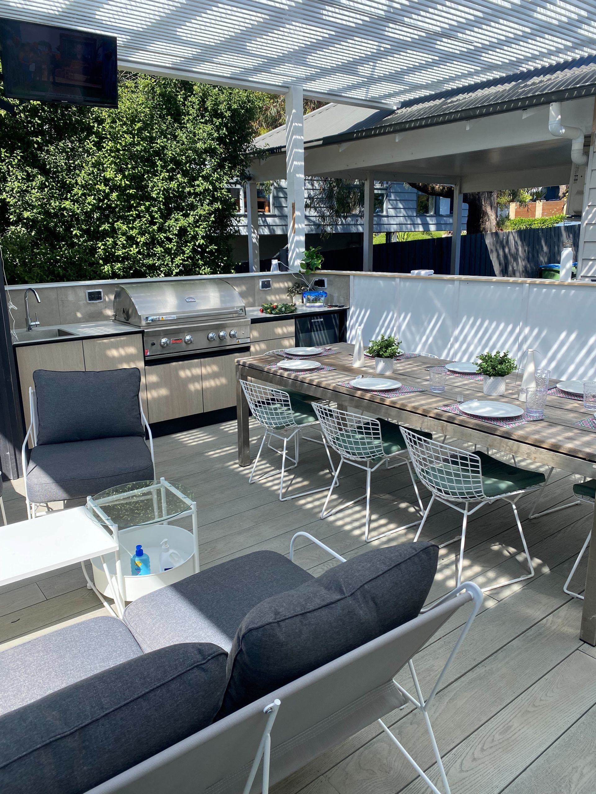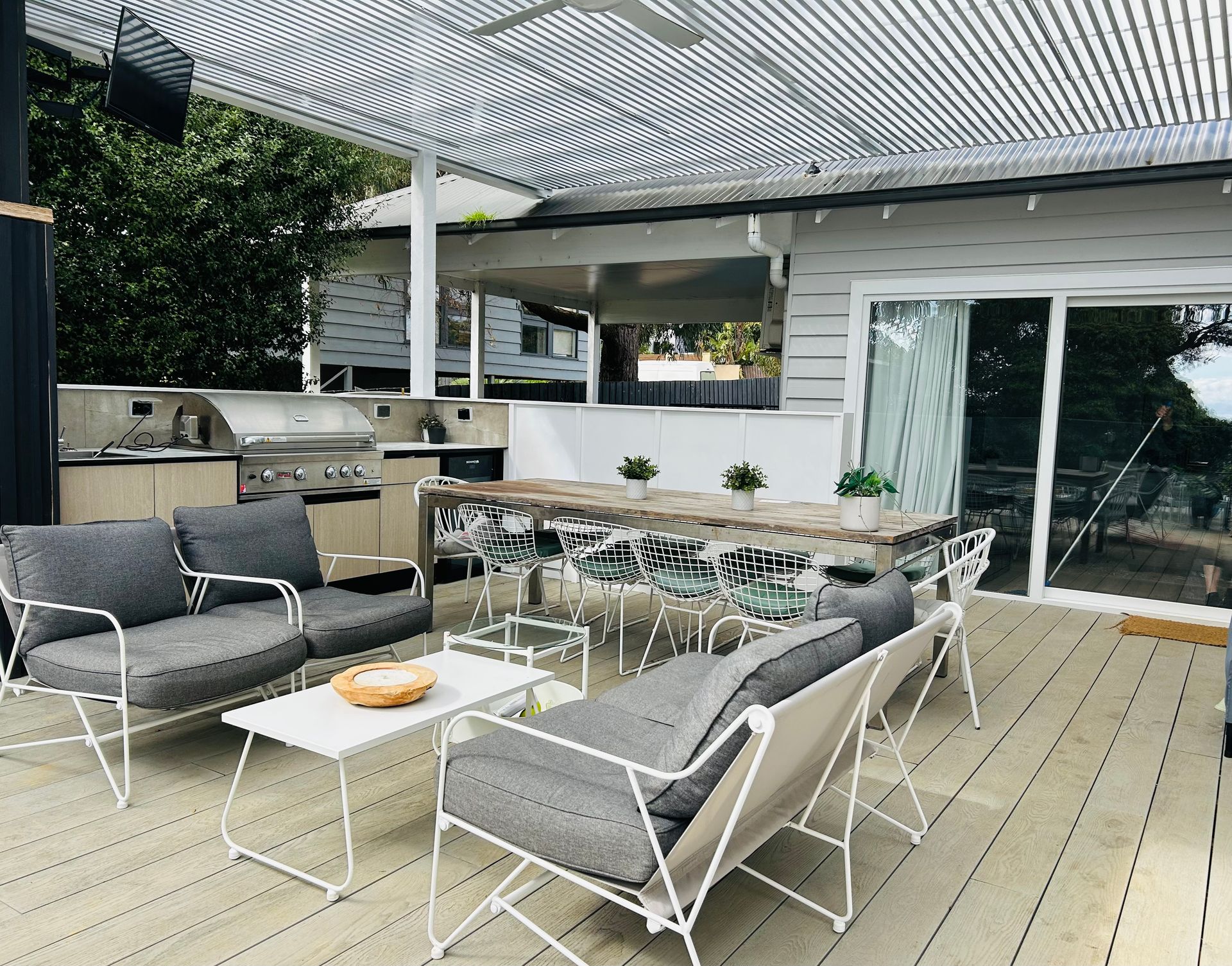 Living area opens onto large outdoor deck with undercover area with ceiling fan, outdoor dining, portable gas heater, 5 burner Bbq, lounge chairs and table and wall mounted Smart Tv
