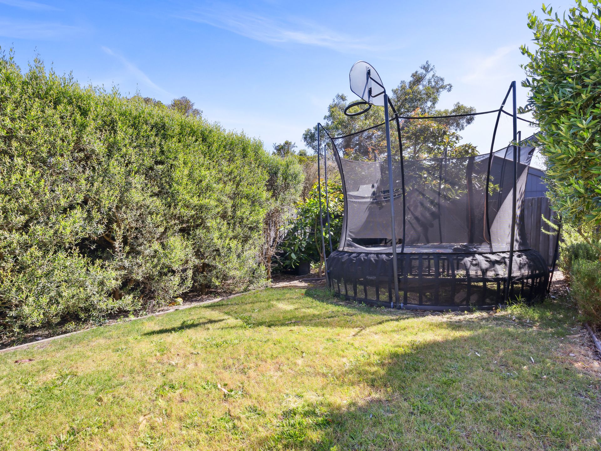 Large Lawn area for children to play includes above ground enclosed trampoline with basketball hoop.