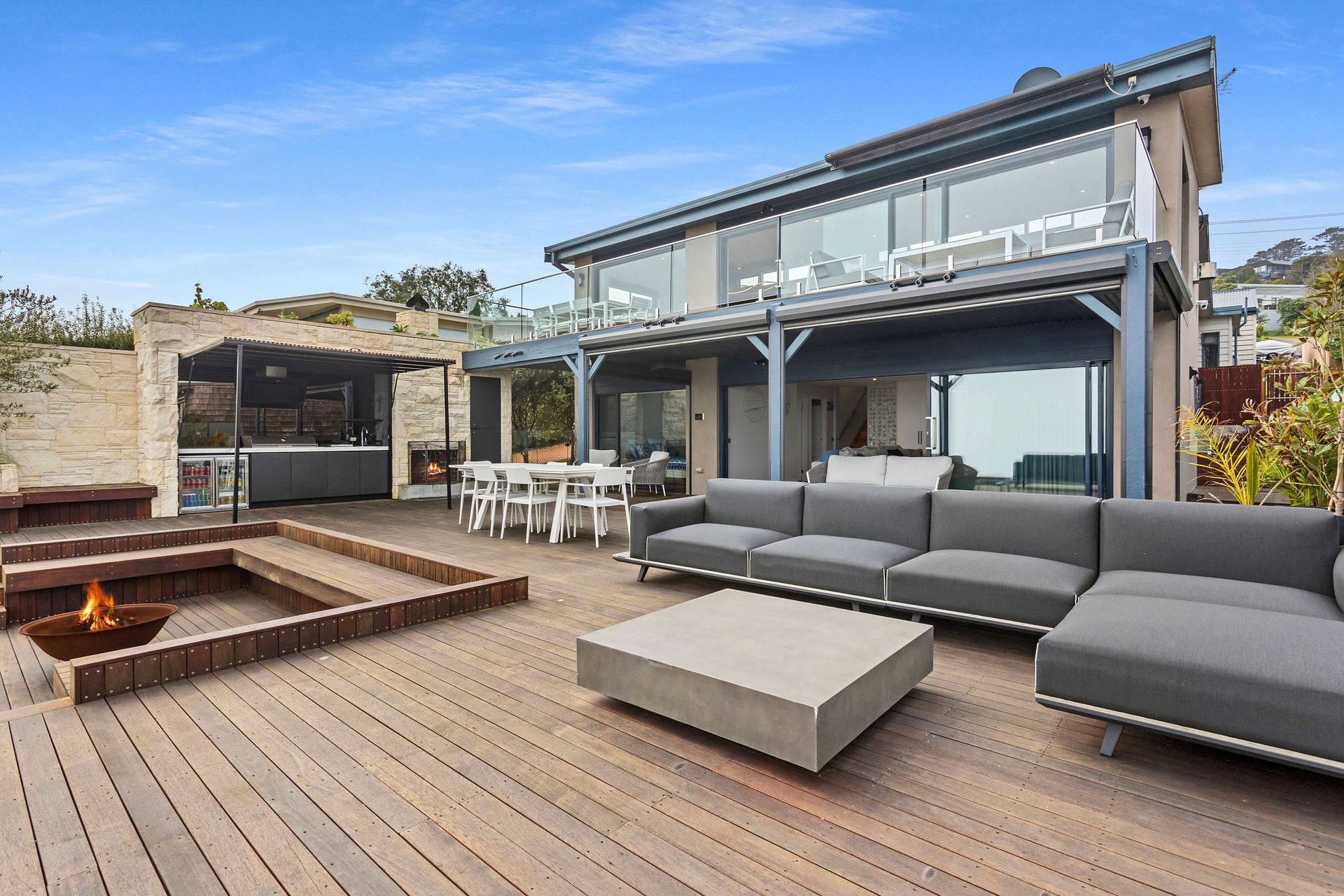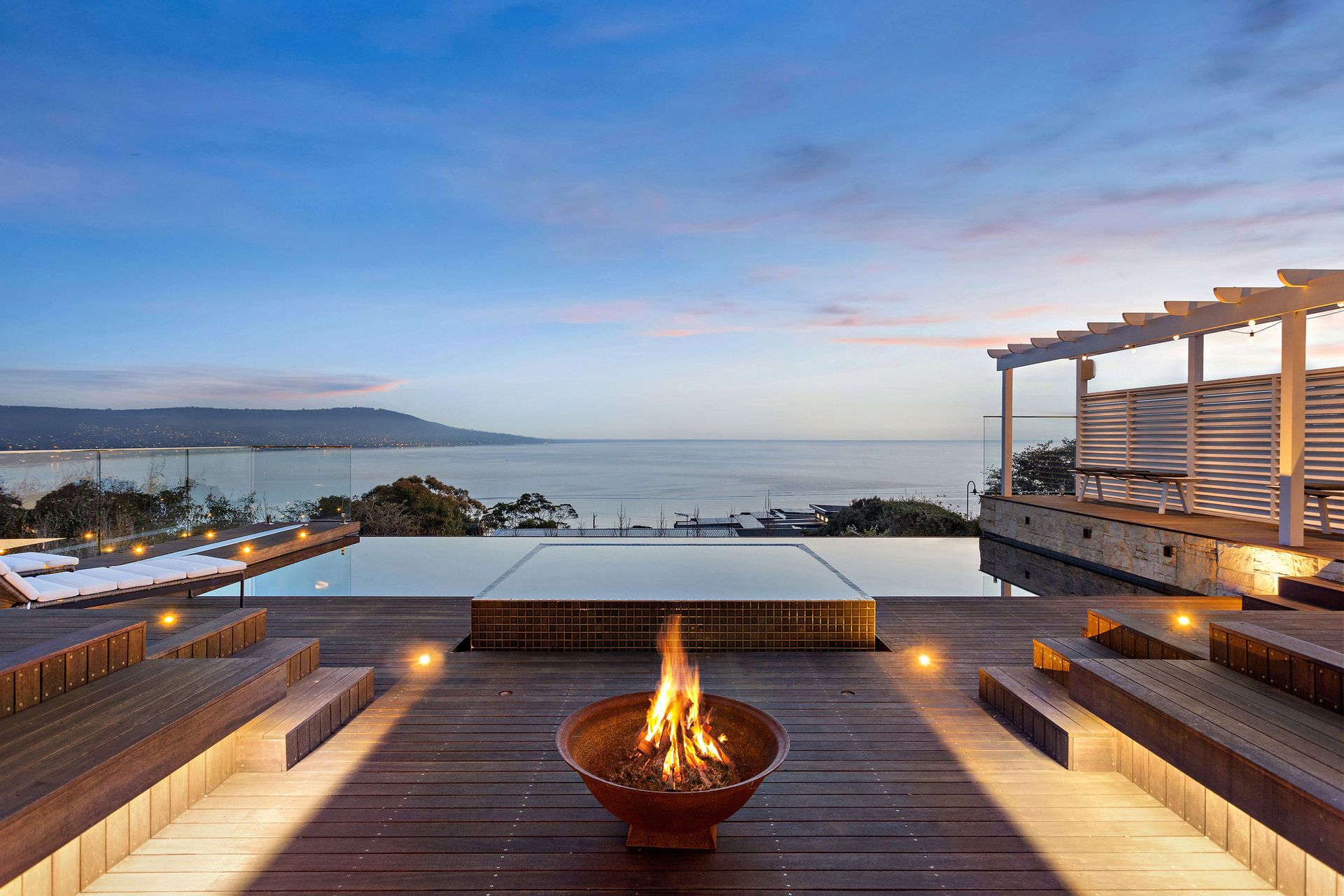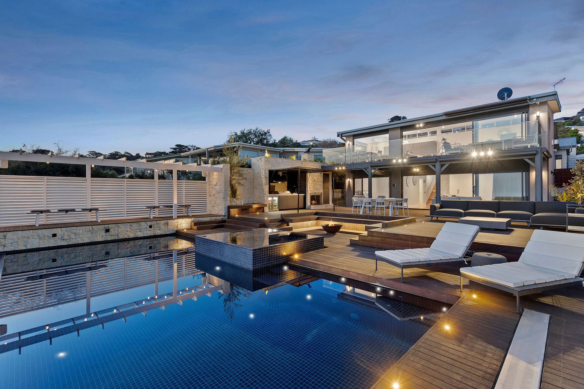 The large deck is partially undercover with couches, outdoor dining, outdoor fireplace, solar heated infinity pool, gas heated spa, lounges and chairs.