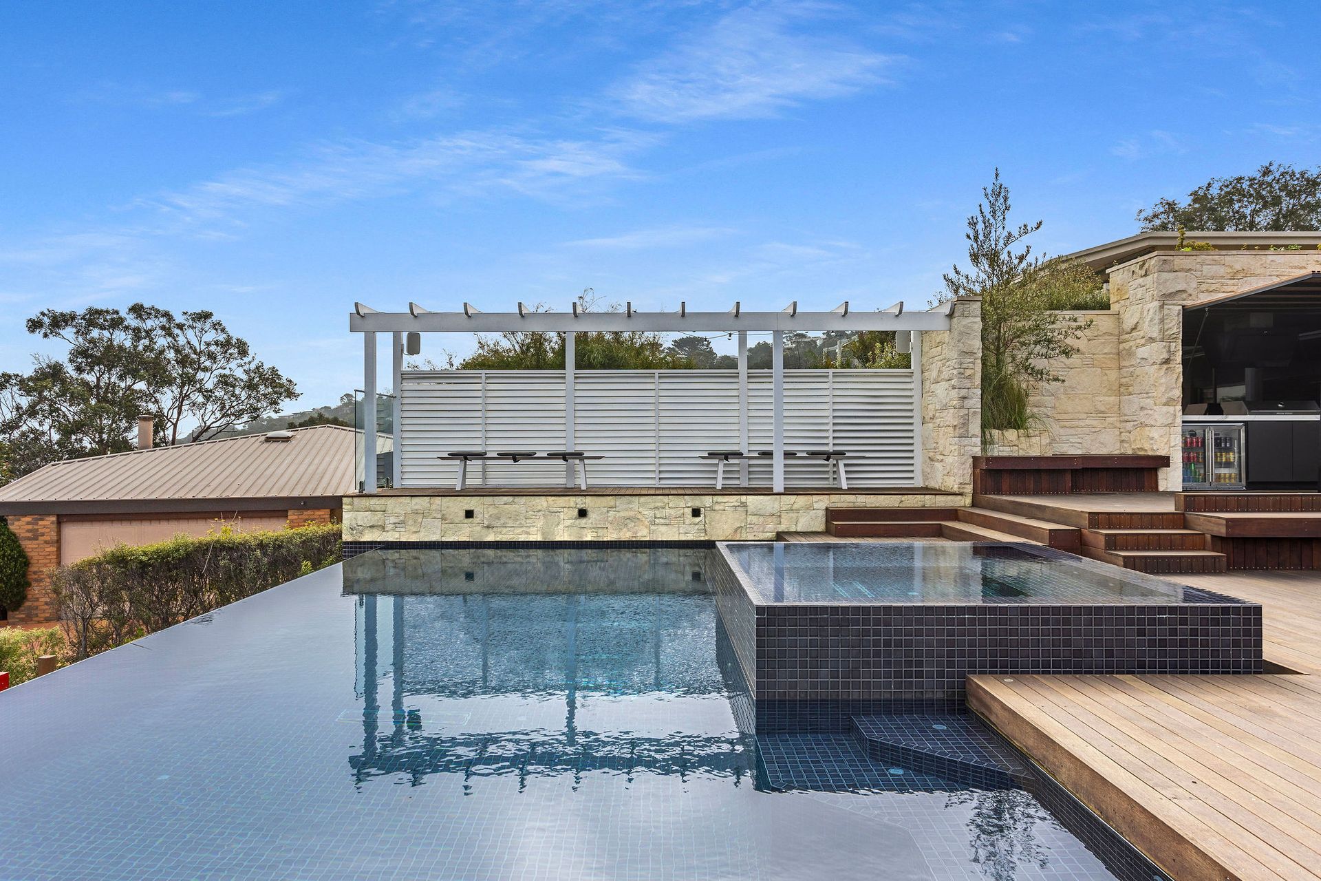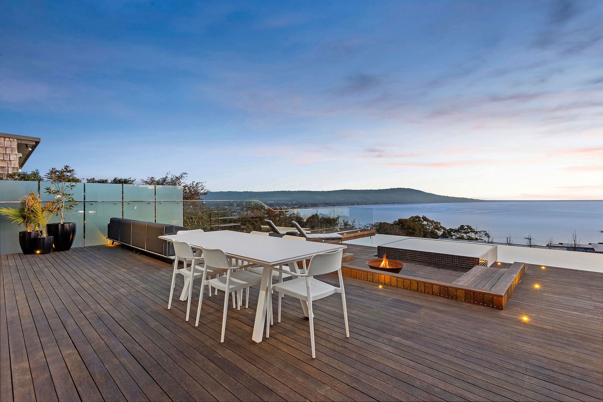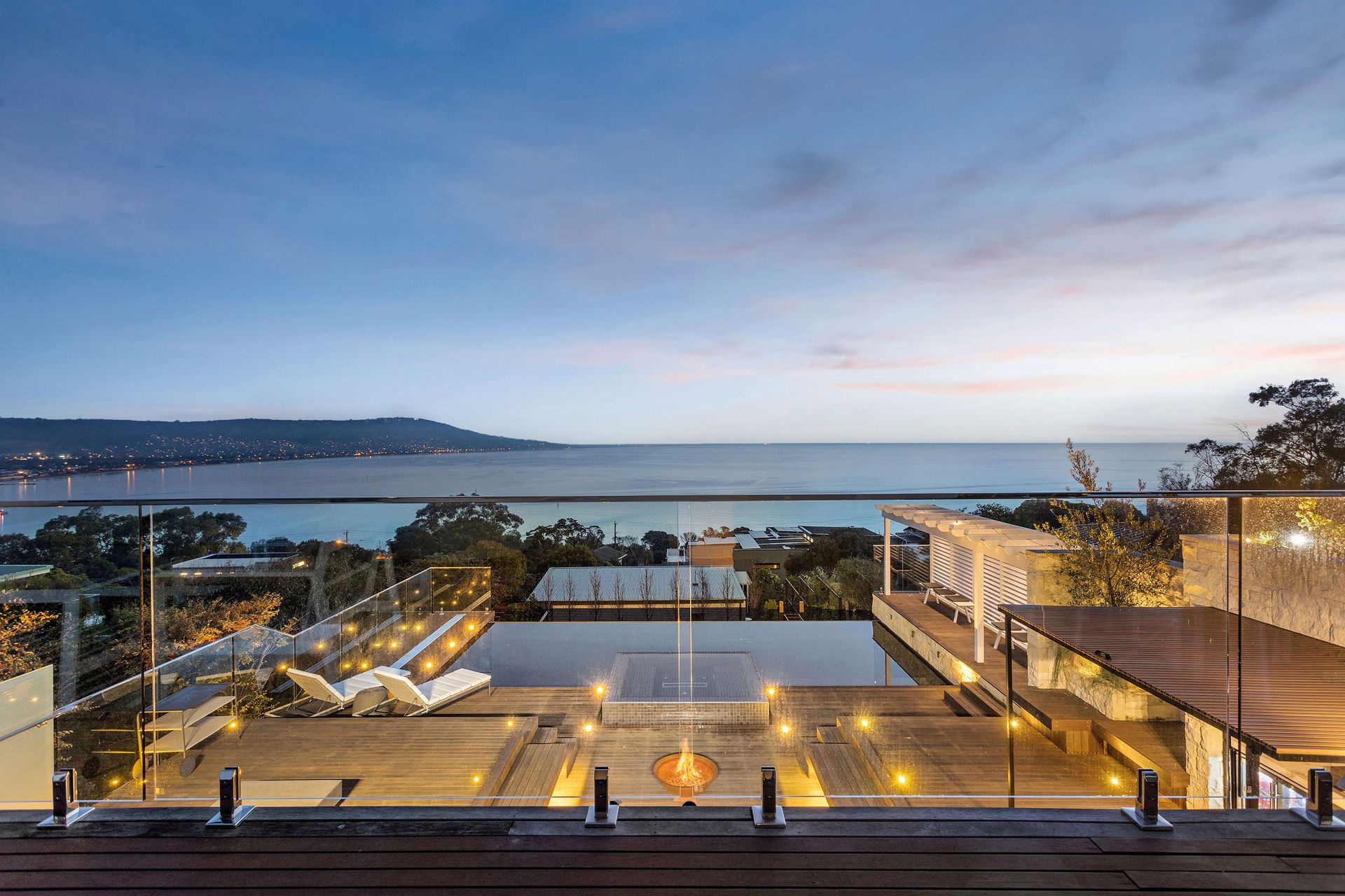 The large deck is partially undercover with couches, outdoor dining, outdoor fireplace, solar heated infinity pool, gas heated spa, lounges and chairs.