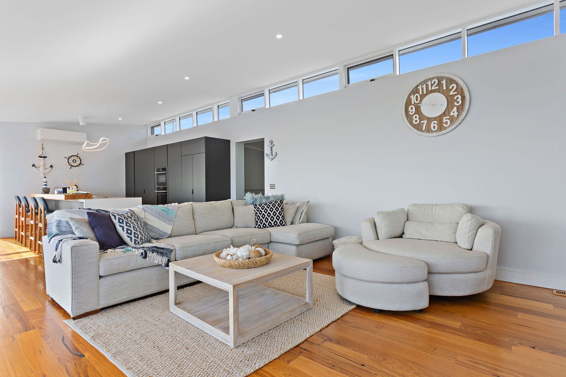 Downstairs of property has Theatre/ Lounge with large couch and wall mounted Smart Tv.