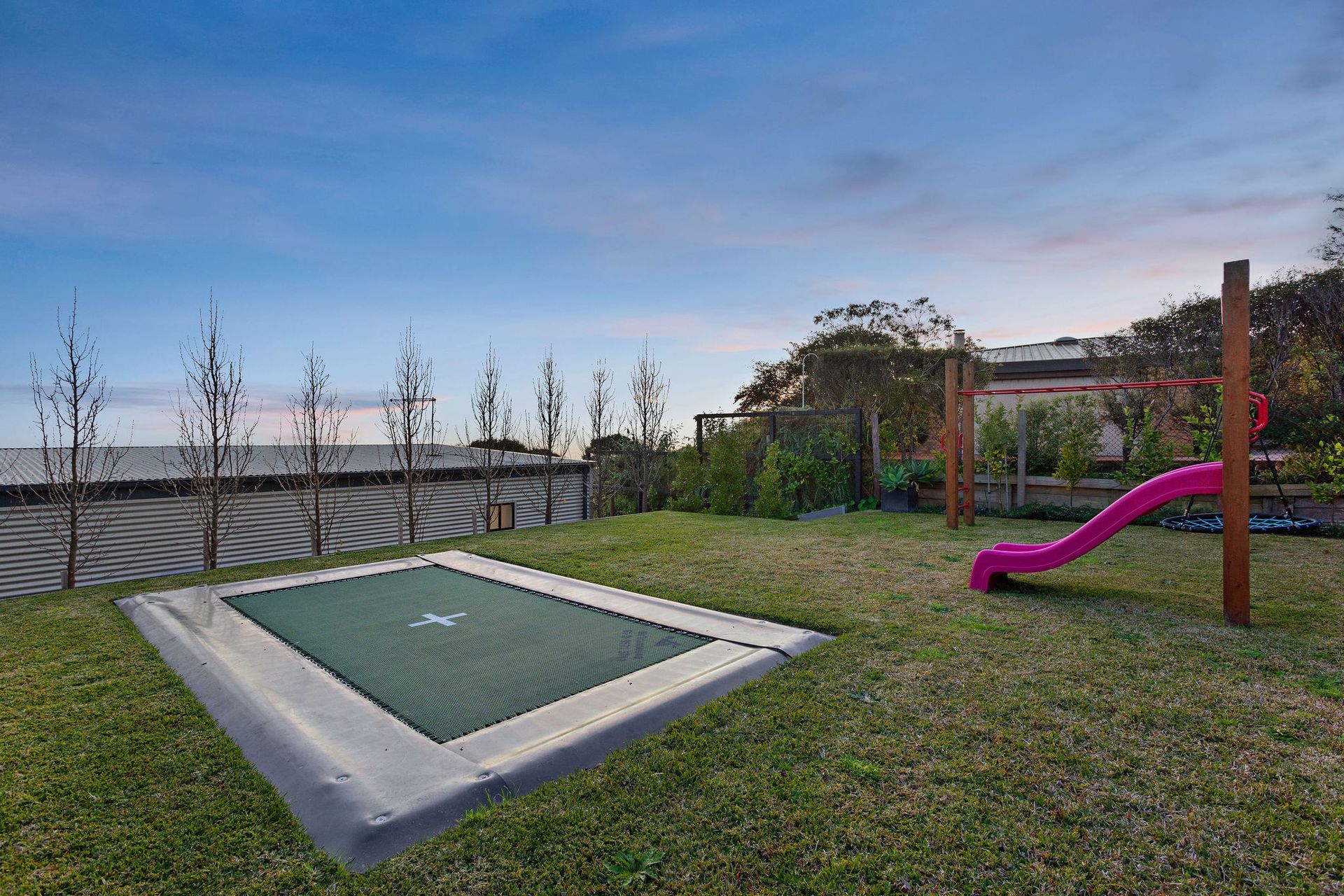 Beyond pool area is lawn with inground trampoline and childrens play equipment.