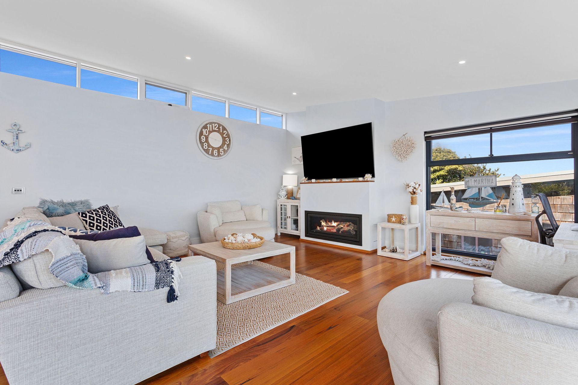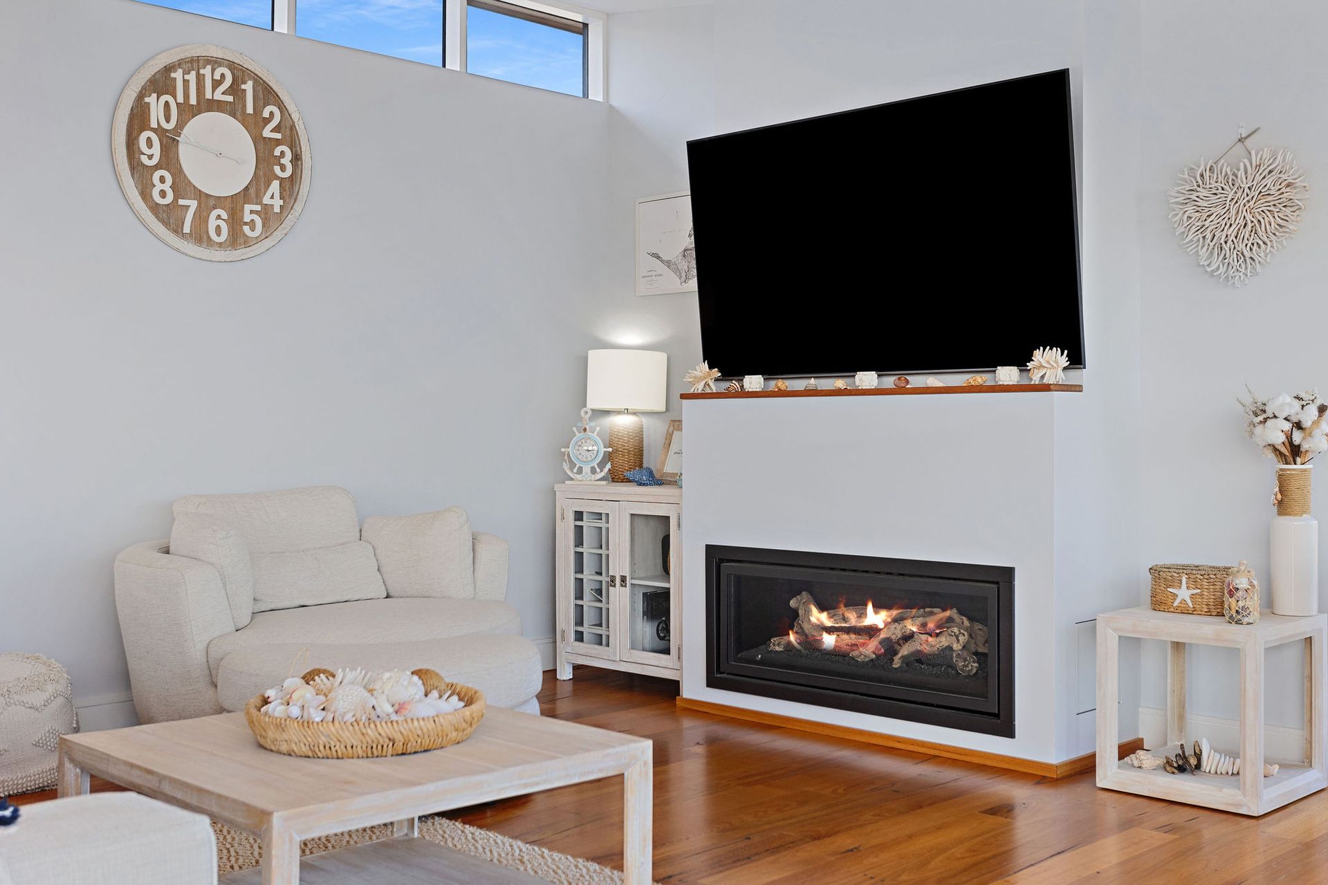Open Plan Living includes couch + chairs, wall mounted Smart Tv, gas fireplace and office table + chair.