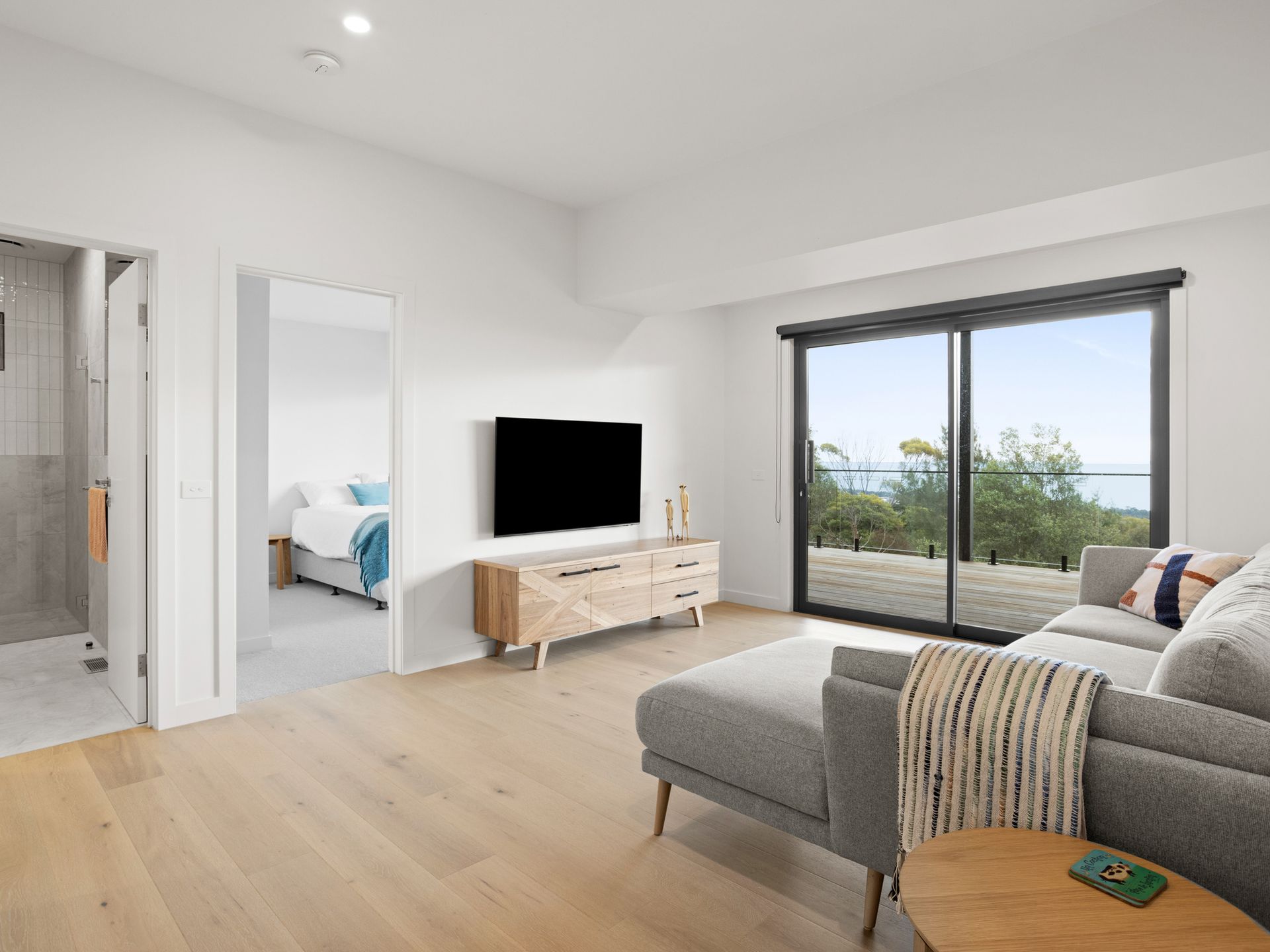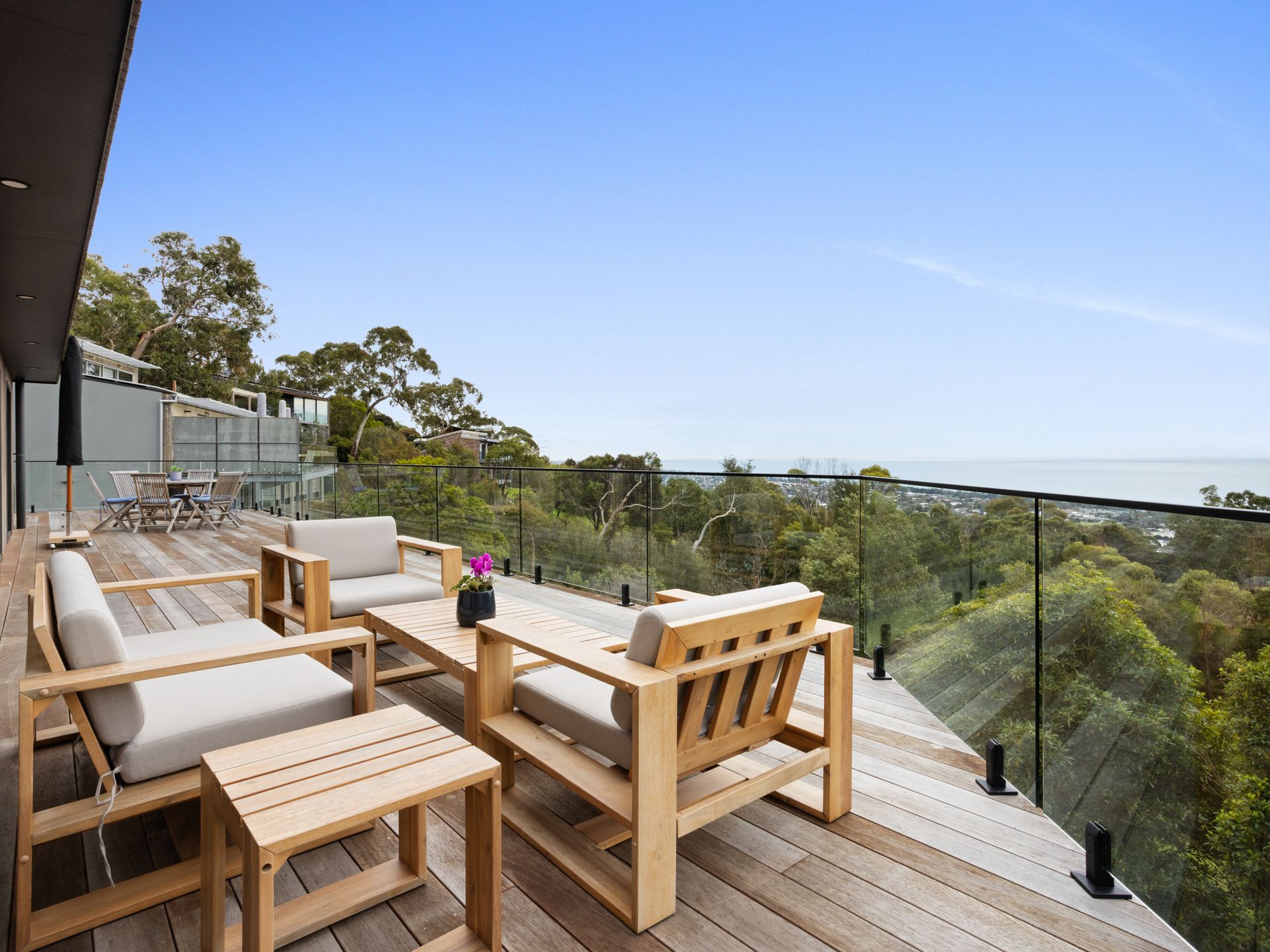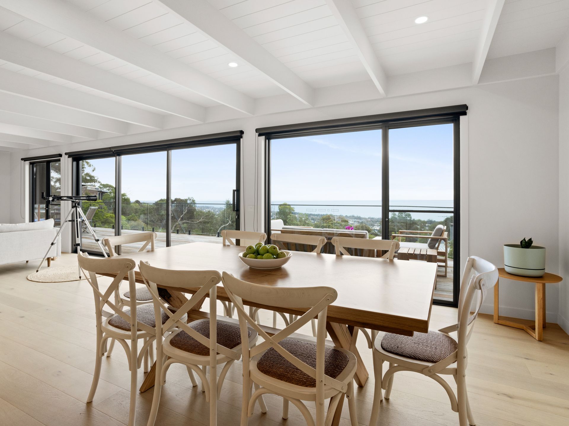 This area opens to balcony with Panoramic Bay Views, Couch + chairs, Outdoor Dining and 2 x Umbrellas.