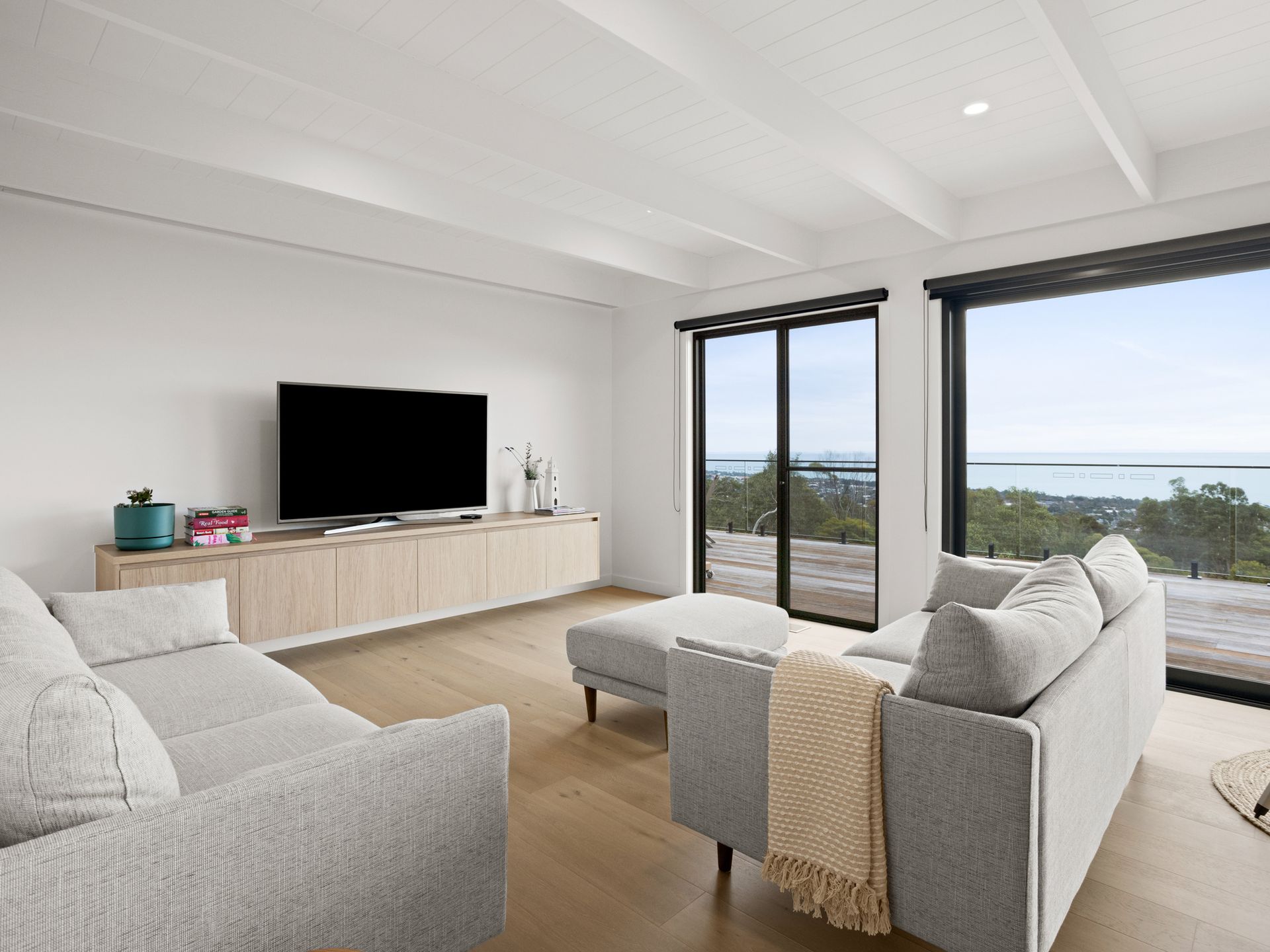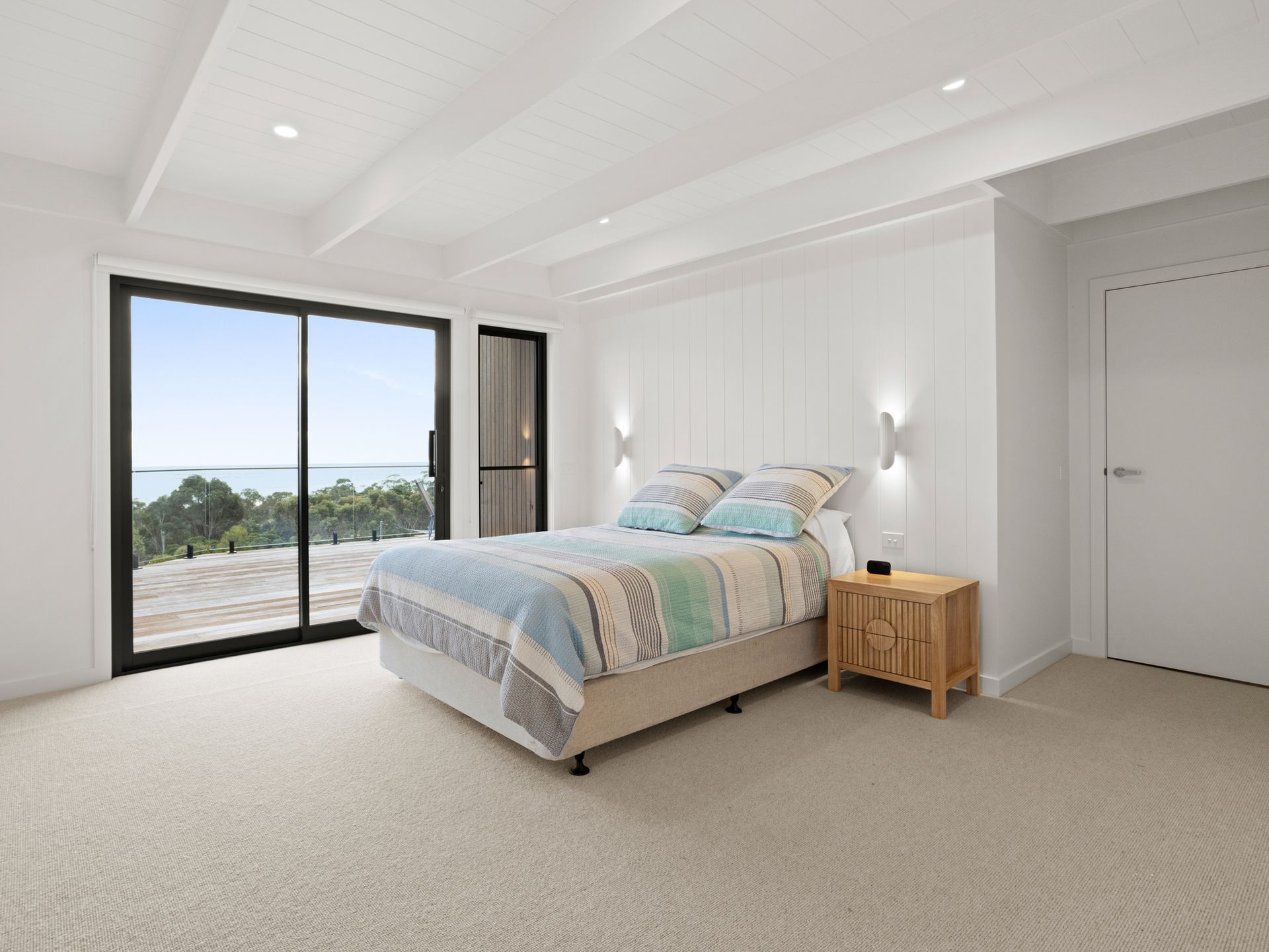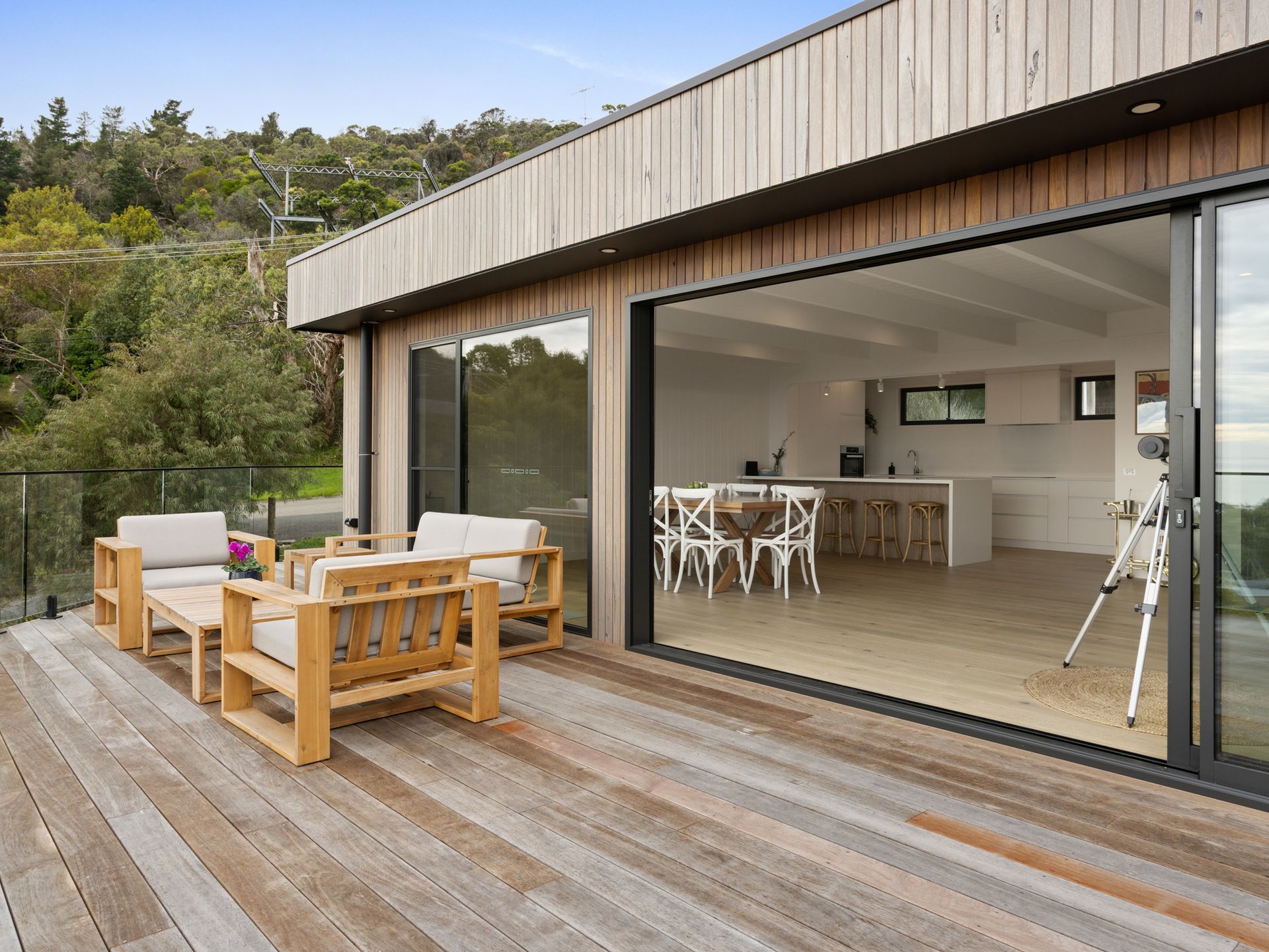 This area opens to balcony with Panoramic Bay Views, Couch + chairs, Outdoor Dining and 2 x Umbrellas.