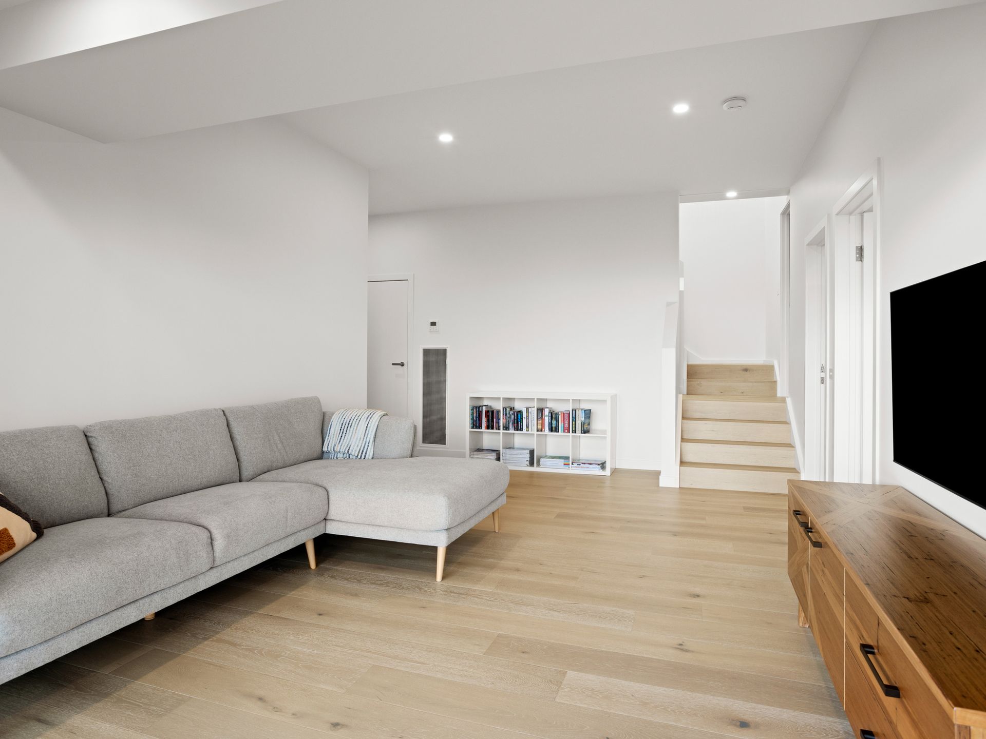 Downstairs features 2nd living area with couches, wall mounted Smart TV, kids games cupboard and opens to deck, laundry with washing