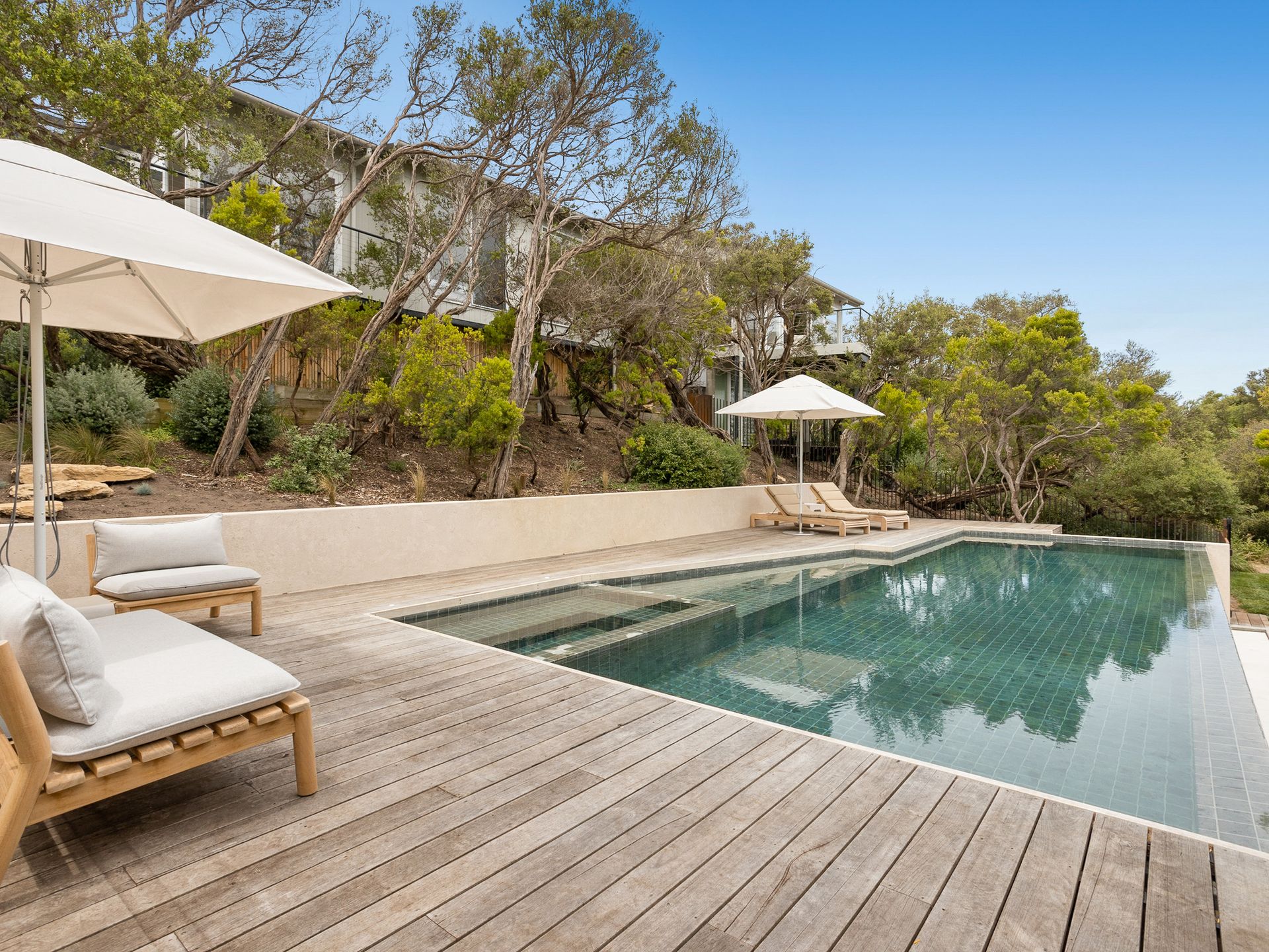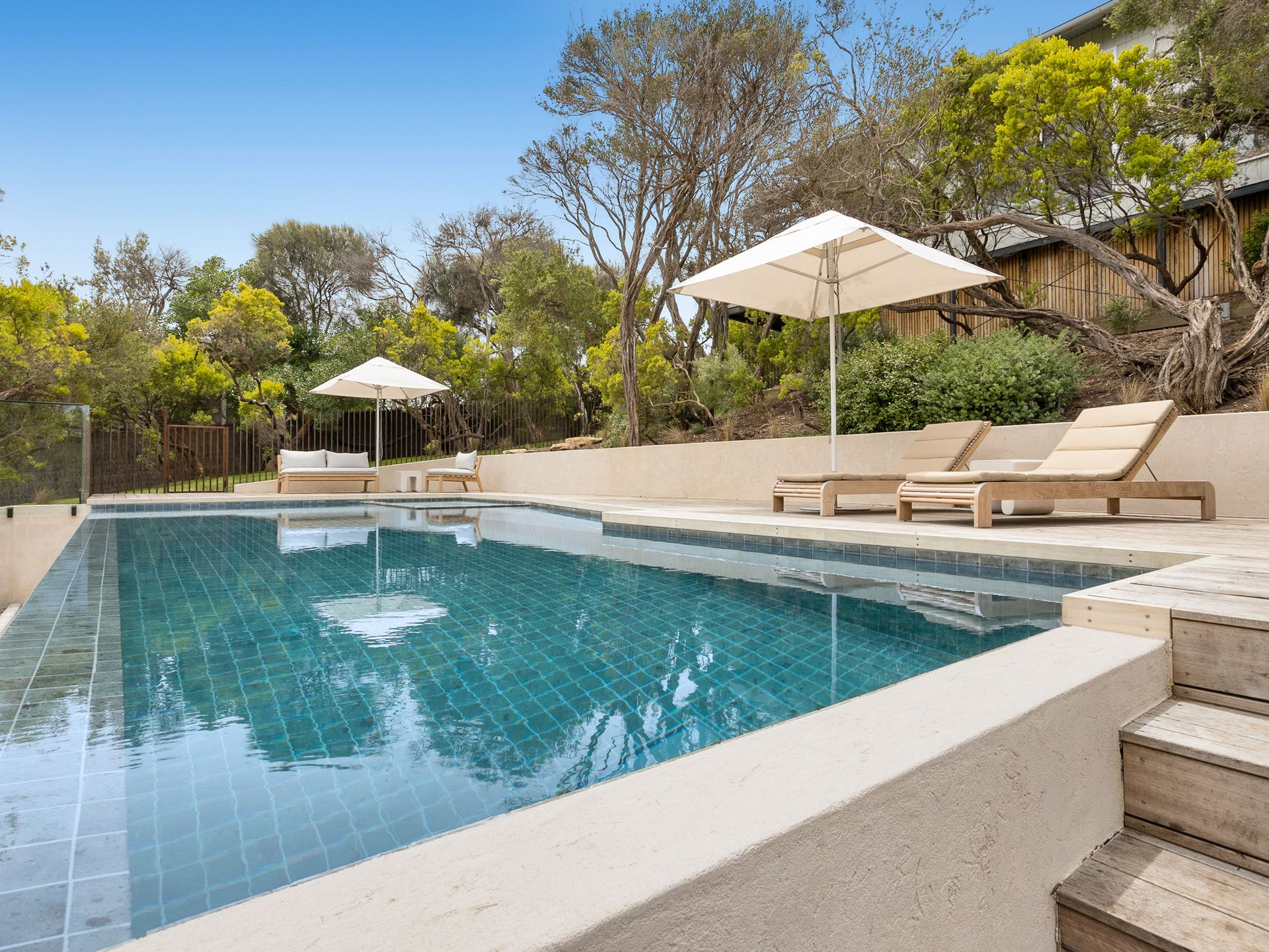 Outdoor areas include enclosed new heated swimming pool and spa with lounges and umbrellas.