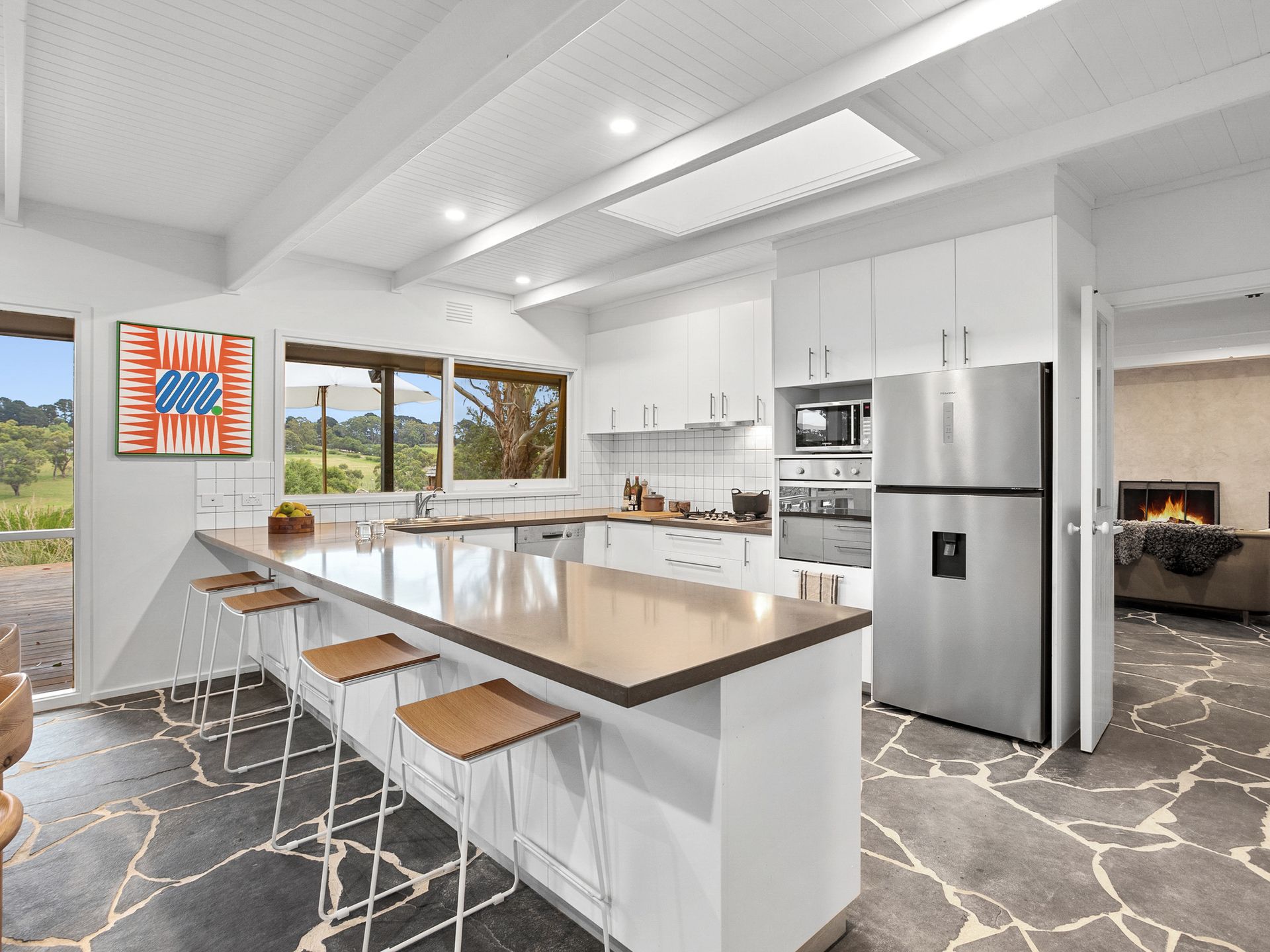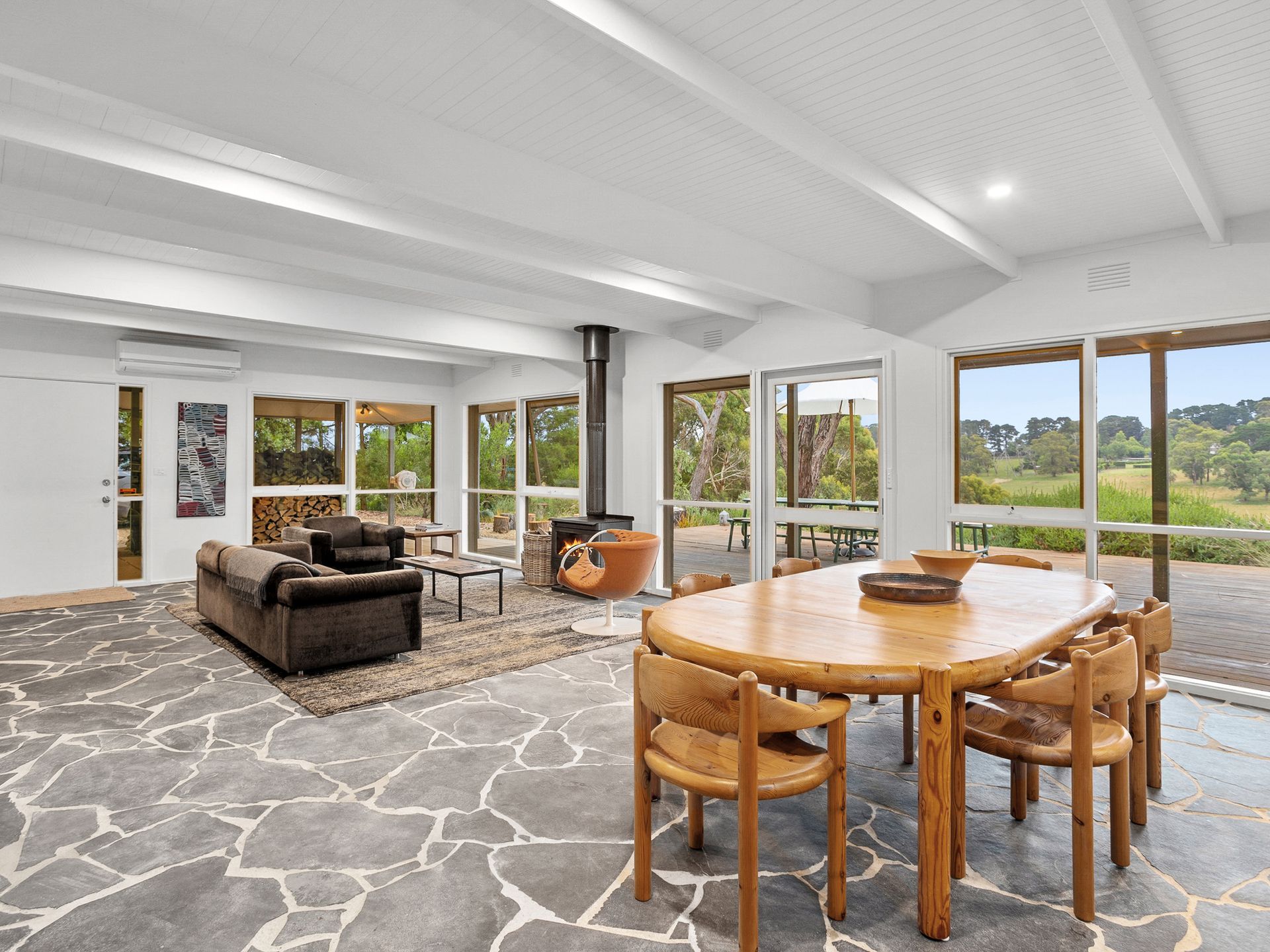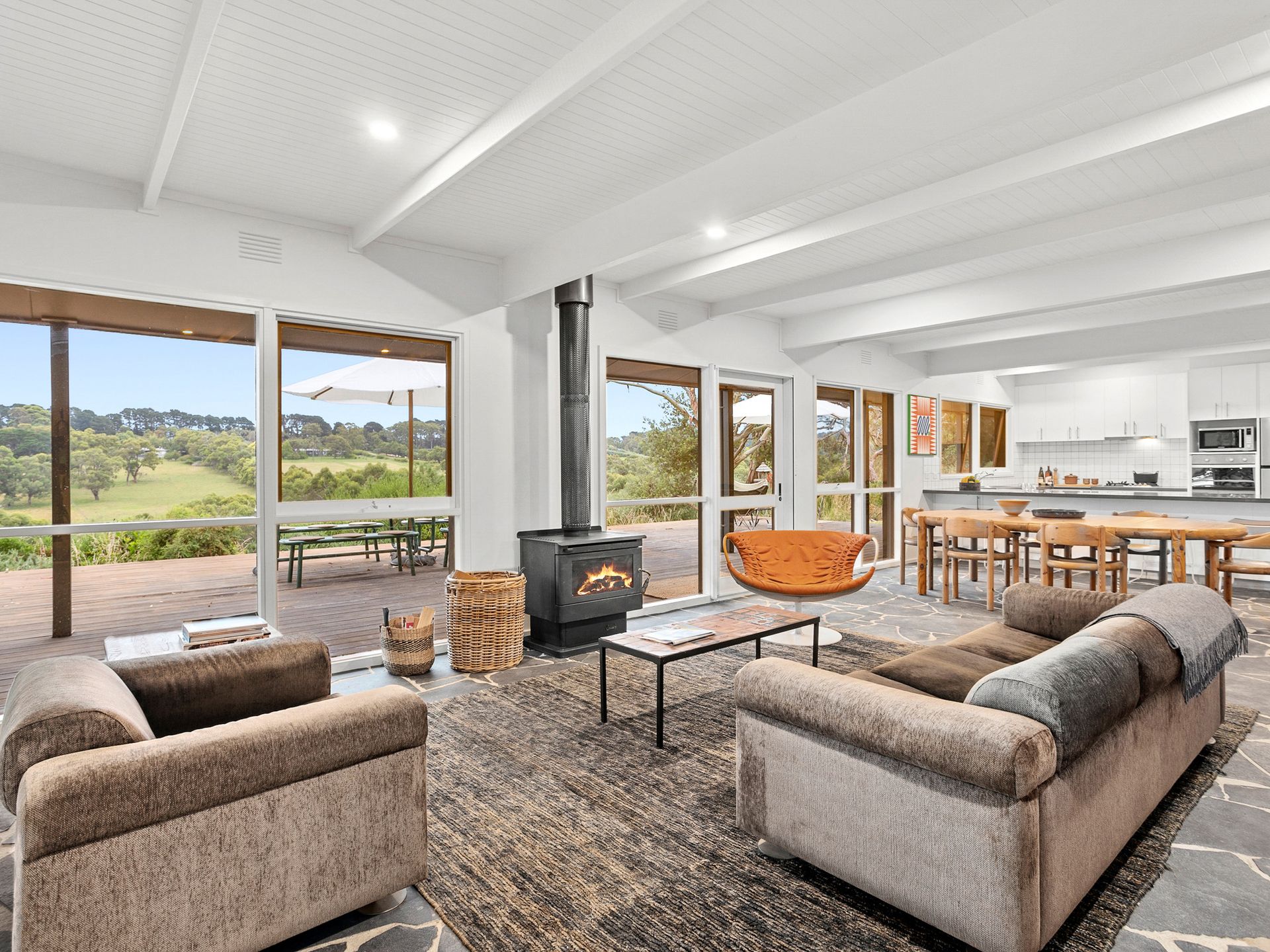 This area has split system, couches, chairs and wood fire burner. Dining that seats 8 guests and Kitchen with modern appliances including microwave and large bench with 4 stools.
