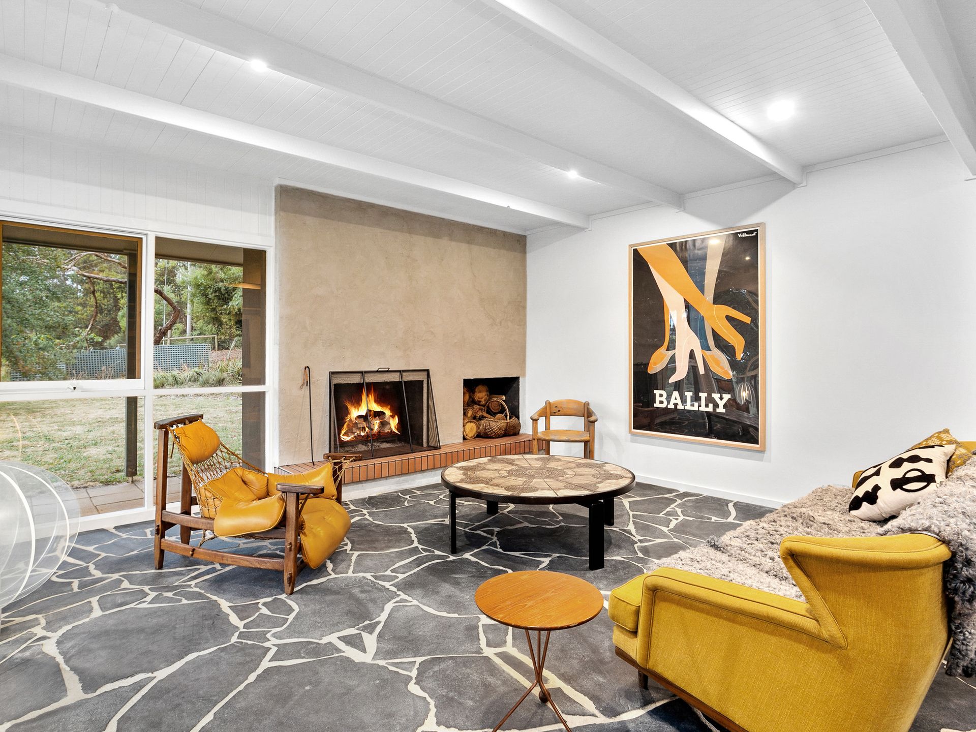The separate lounge area has couches + chairs, bookshelf, fireplace and split system.