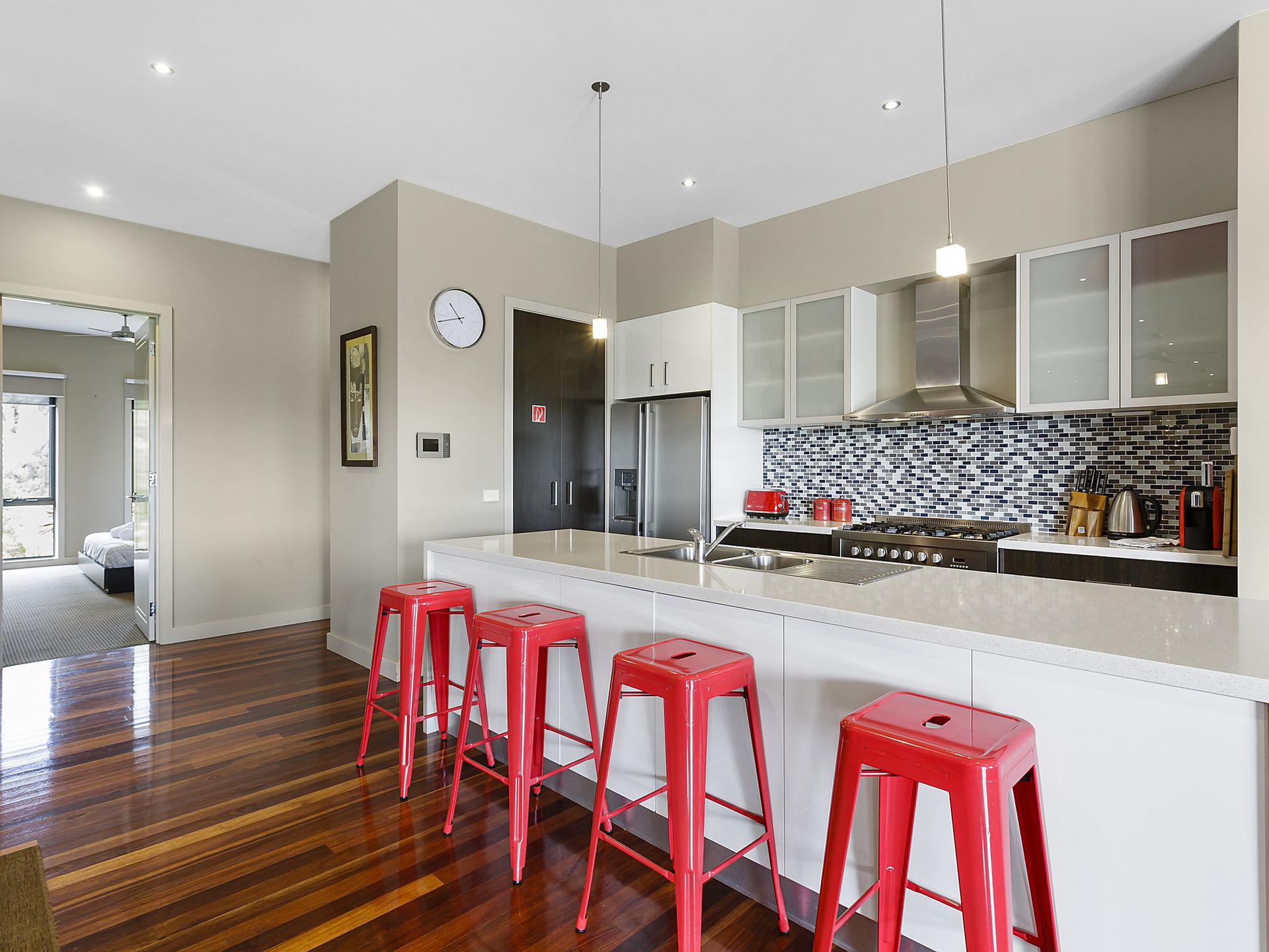 Kitchen has Island bench with 4 stools, modern appliances, coffee machine (pods) and fridge/freezer with iced water.