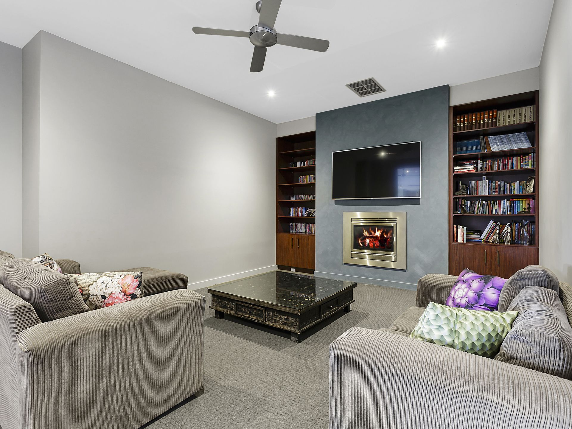 There is a living area with tv and couches looking over swimming pool, a sitting area looking onto back deck and tennis court and a specific TV room with large Apple Tv.