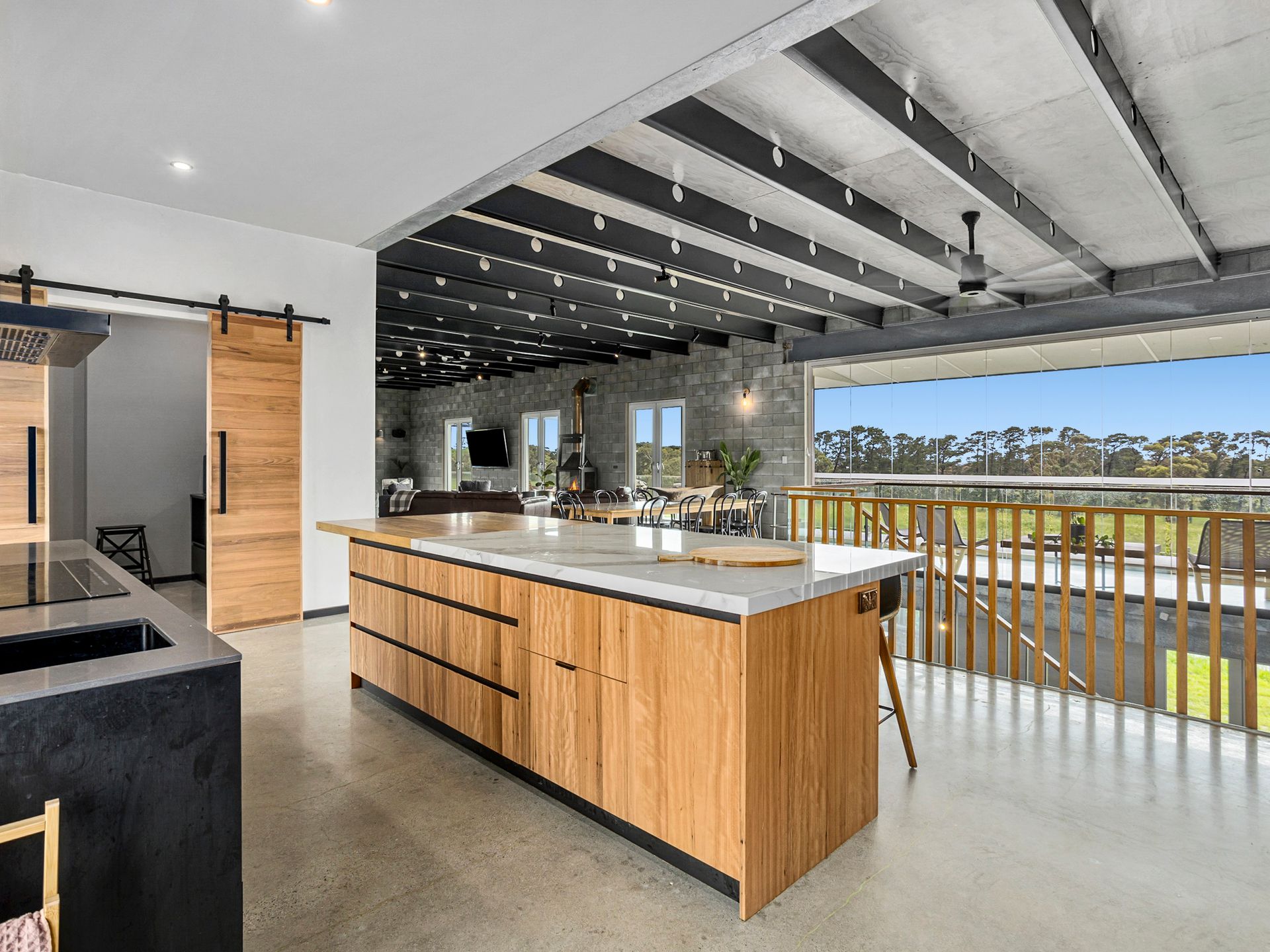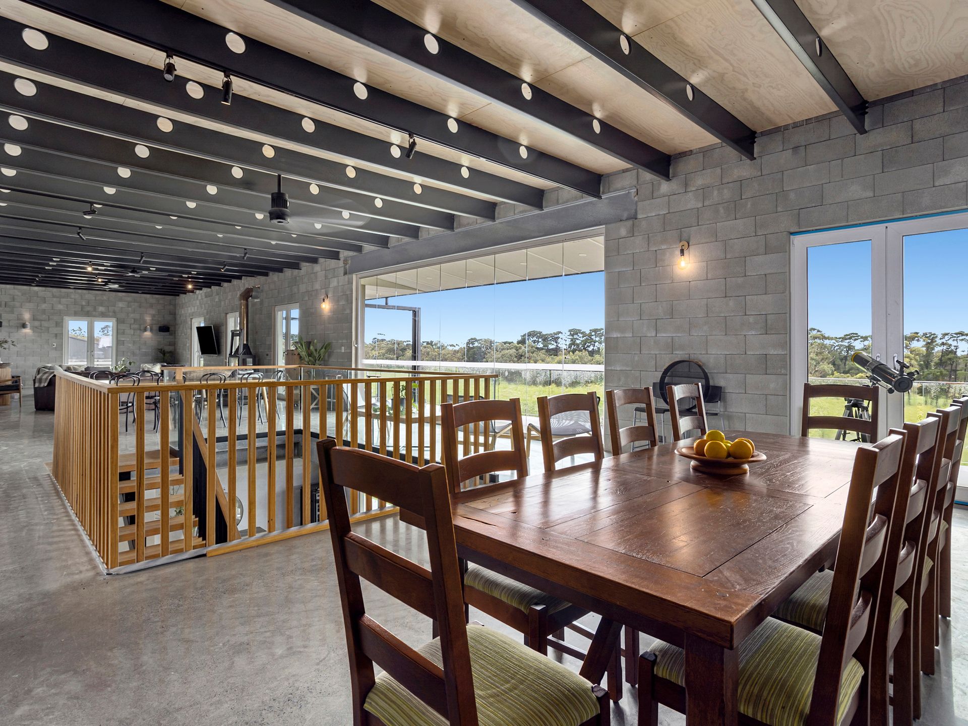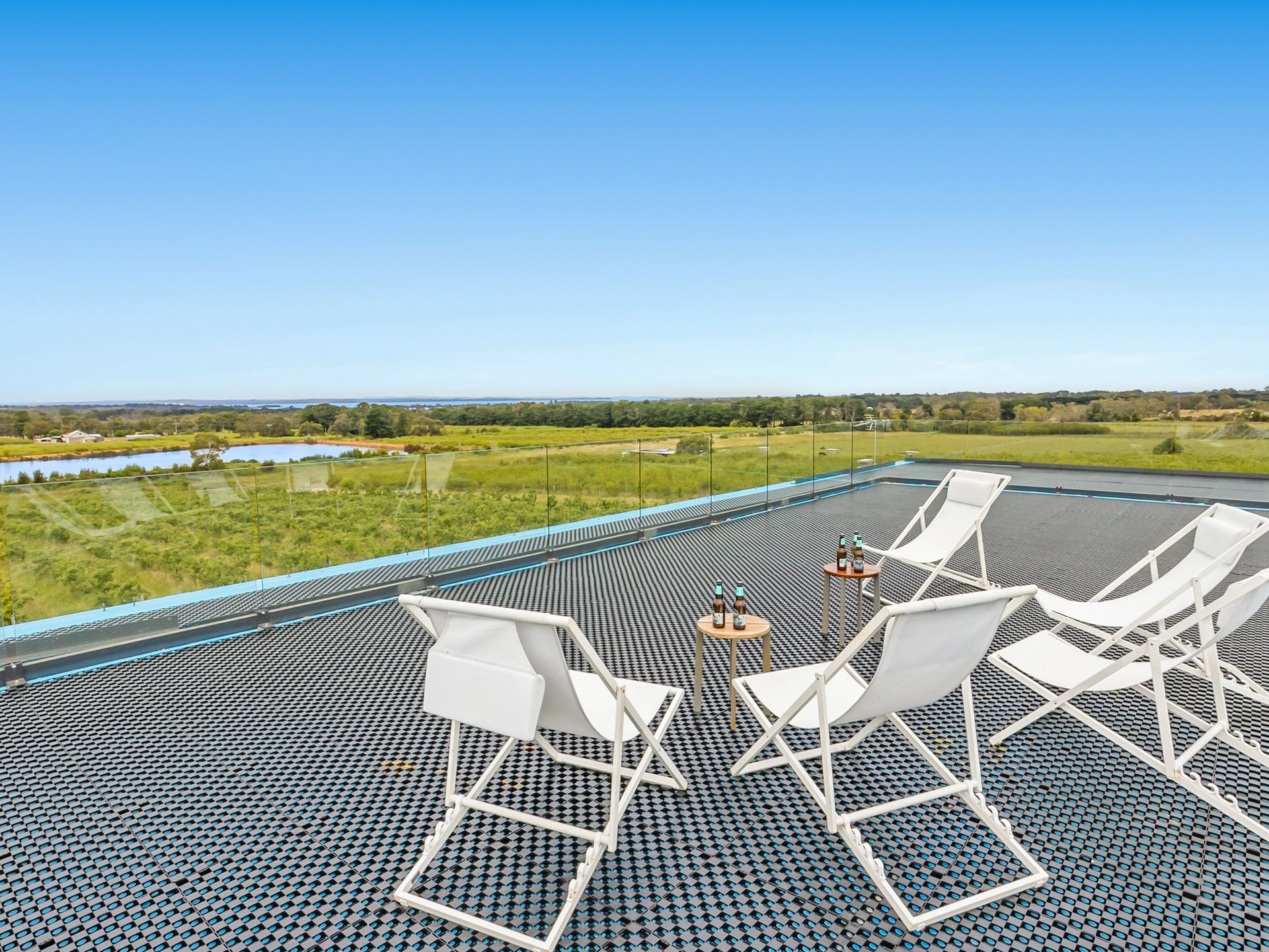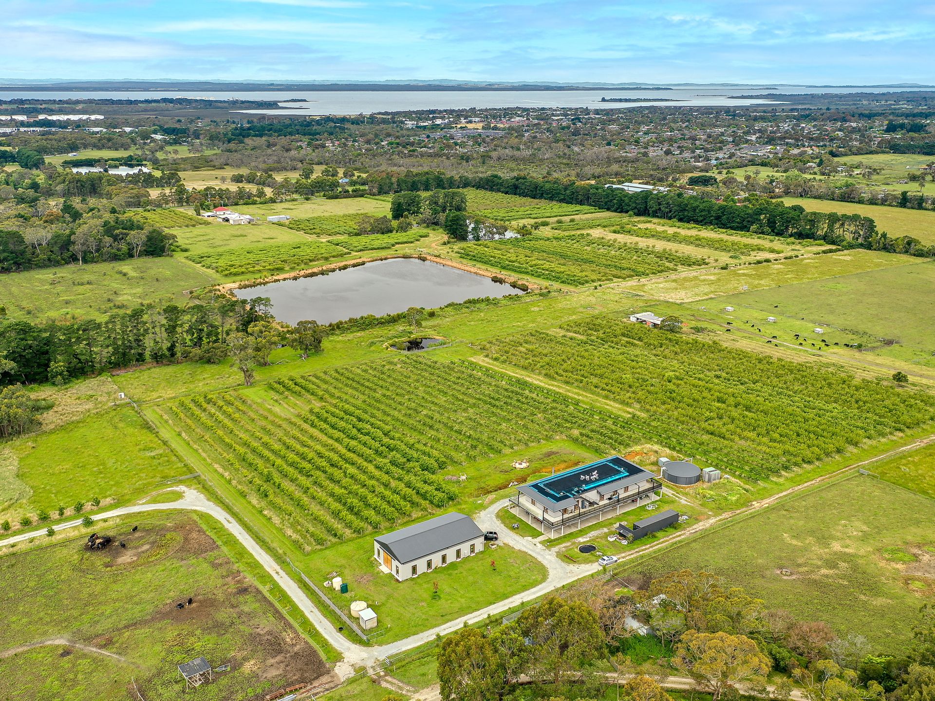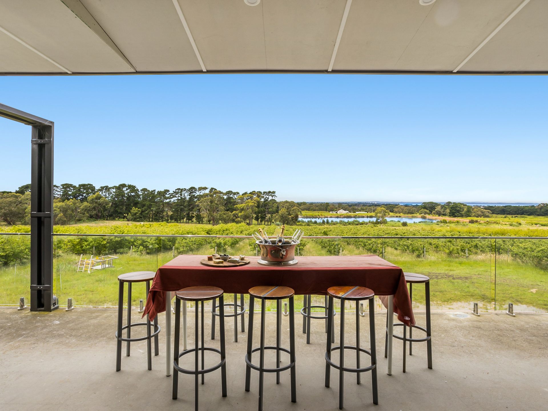 Views from the upstairs kitchen, dining and living take in the 4000 apple tree orchard, dams and paddocks. The views extend across Westernport Bay to both French and Phillip Islands. The 6-metre bi-fold glass doors open up onto the top balcony which wraps the entire house, not to mention the rooftop patio where you can get 360 degree views of farmland and coastline. The Rooftop includes an area to sunbake (electricity connected on roof), stargaze and drink cocktails on a warm night.