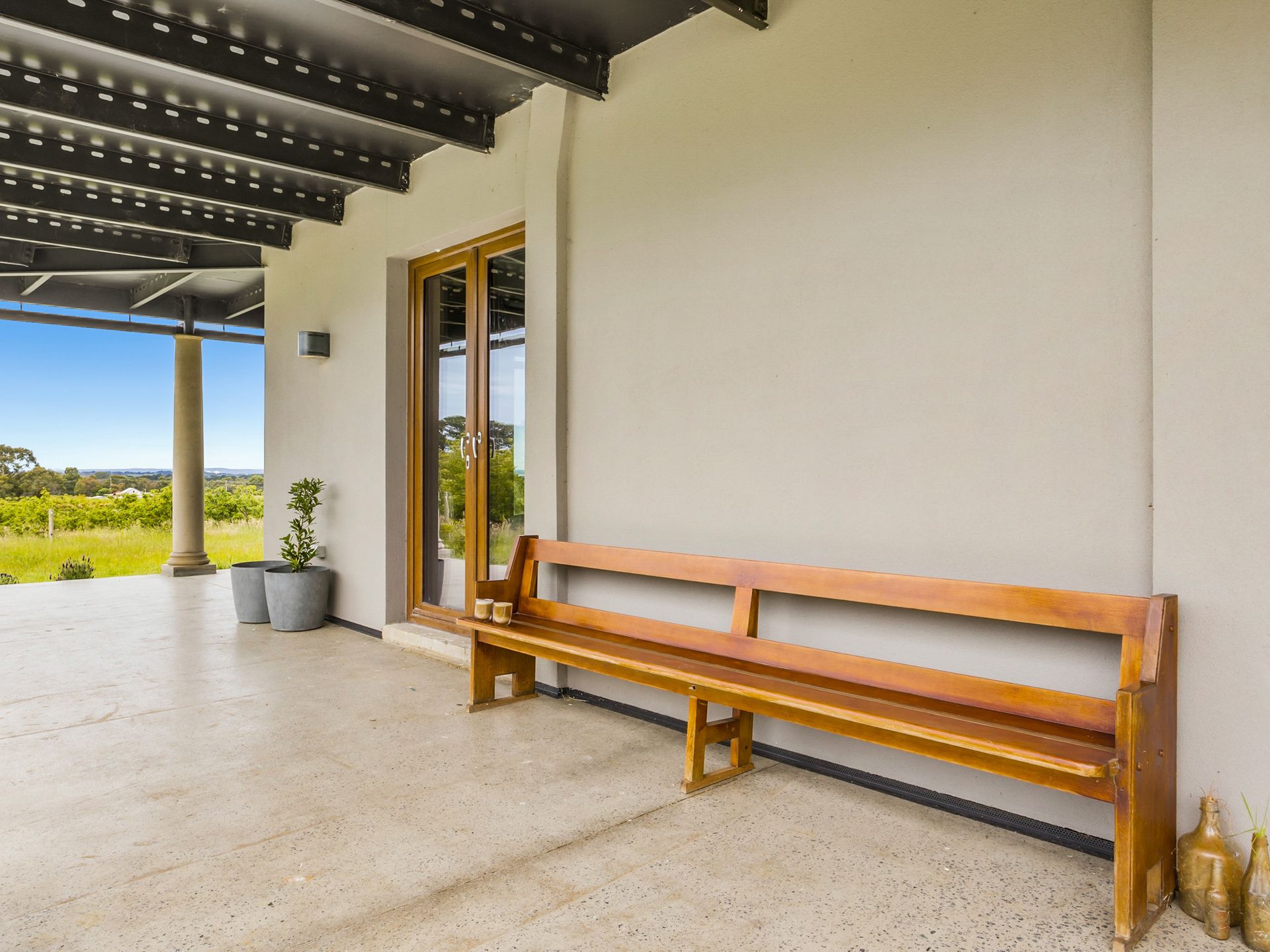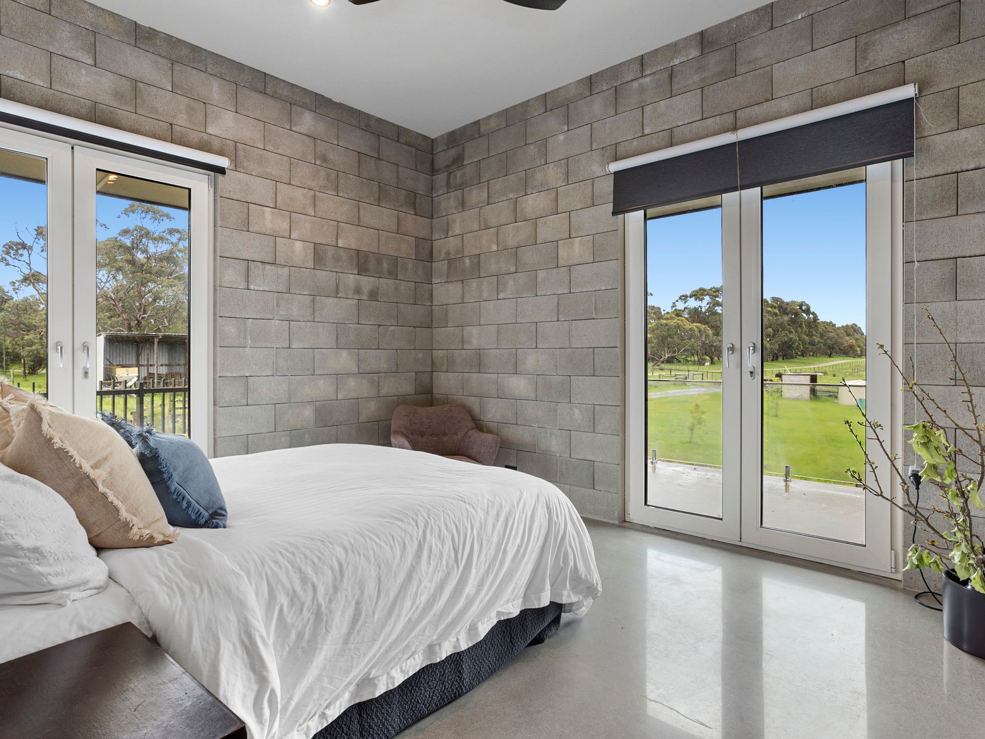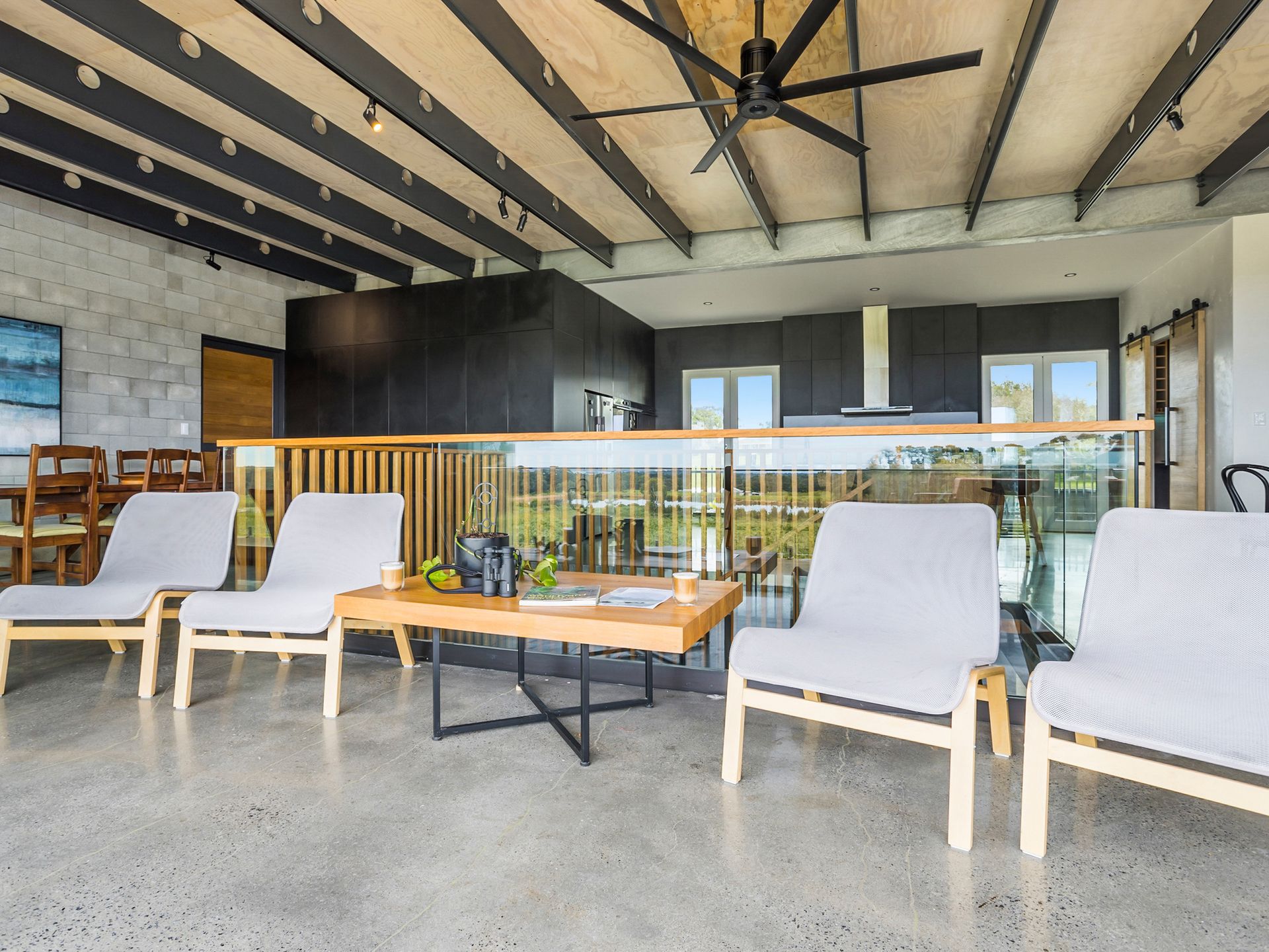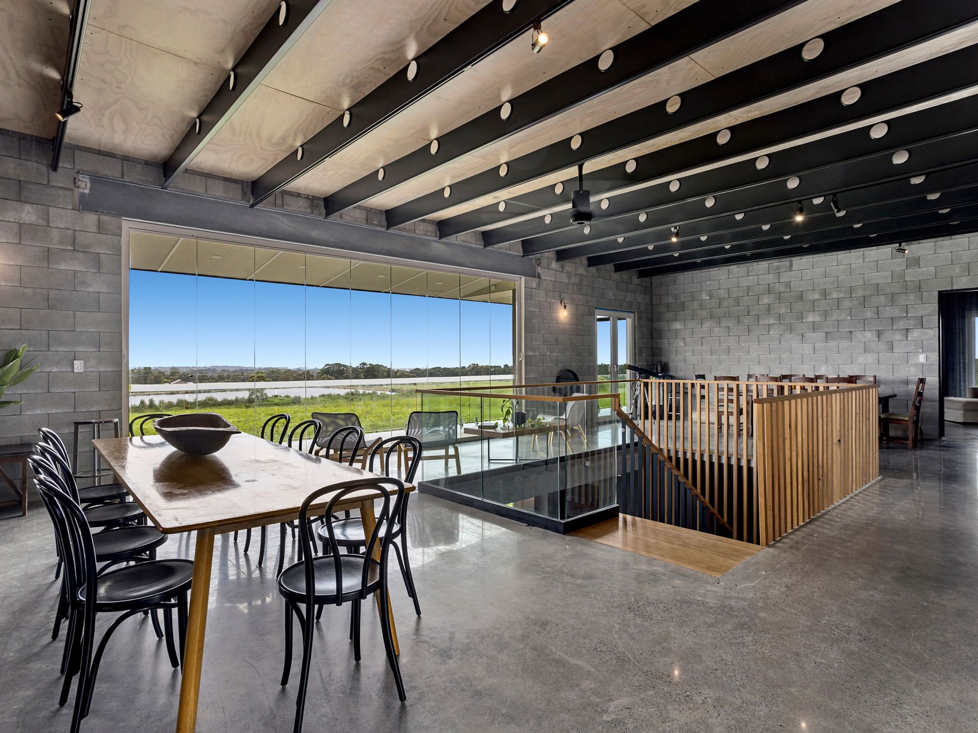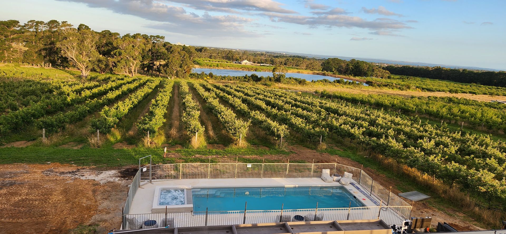 Views from the upstairs kitchen, dining and living take in the 4000 apple tree orchard, dams and paddocks. The views extend across Westernport Bay to both French and Phillip Islands. The 6-metre bi-fold glass doors open up onto the top balcony which wraps the entire house, not to mention the rooftop patio where you can get 360 degree views of farmland and coastline. The Rooftop includes an area to sunbake (electricity connected on roof), stargaze and drink cocktails on a warm night.