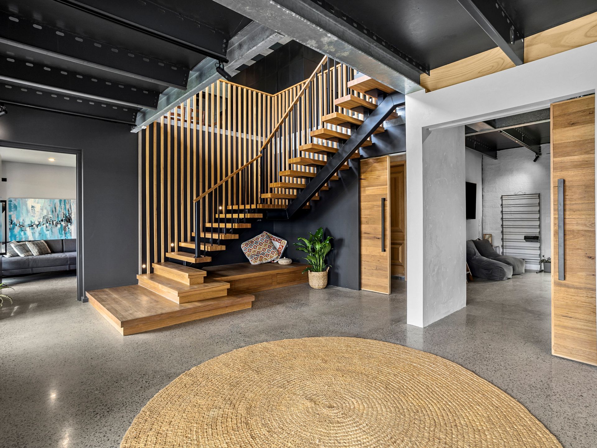 With high ceilings and polished concrete floors throughout the upstairs and downstairs, this house is solid and perfect for family gatherings or for friends and families to share. The sleeping arrangements allow for up to 27 guests, and don't worry, there are 5 large bathrooms and a powder room!