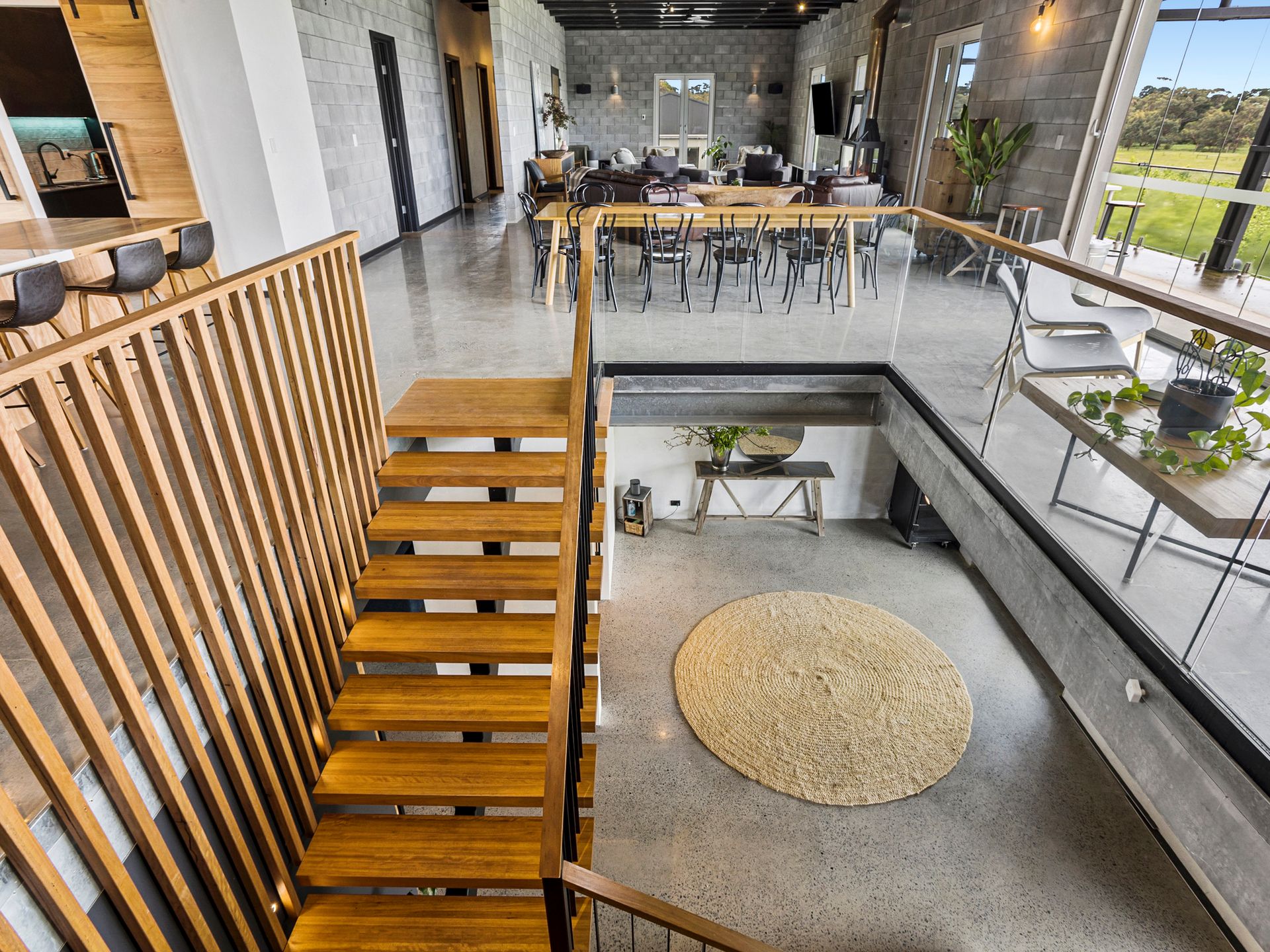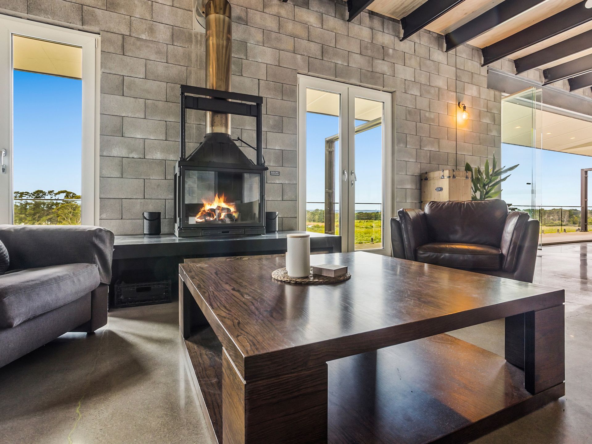 The enormous living area upstairs consists of 2 separate seating areas, an 80 inch Smart Tv and glass fronted wood burner fire as well as a reverse cycle air conditioner. There are a variety of board games and card games to enjoy in front of the fire.