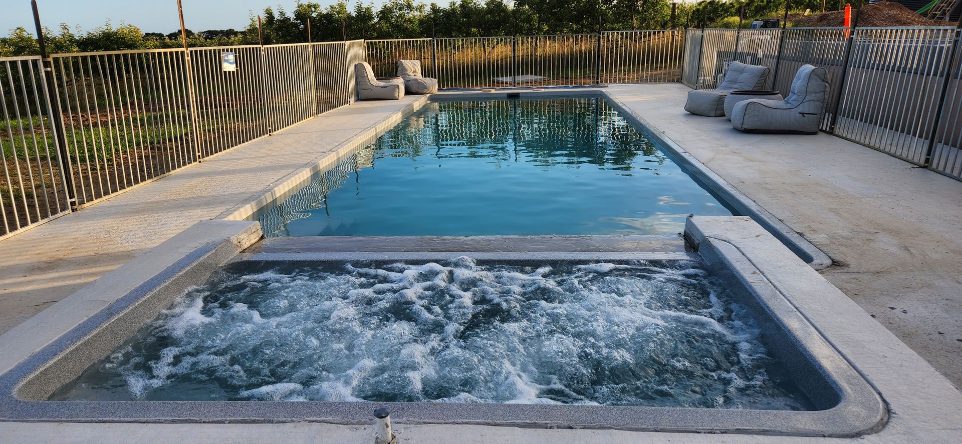 New 12 metre Swimming Pool with large Spa (Electric heating). Surrounded by relaxed poolside lounges and grassed areas.
