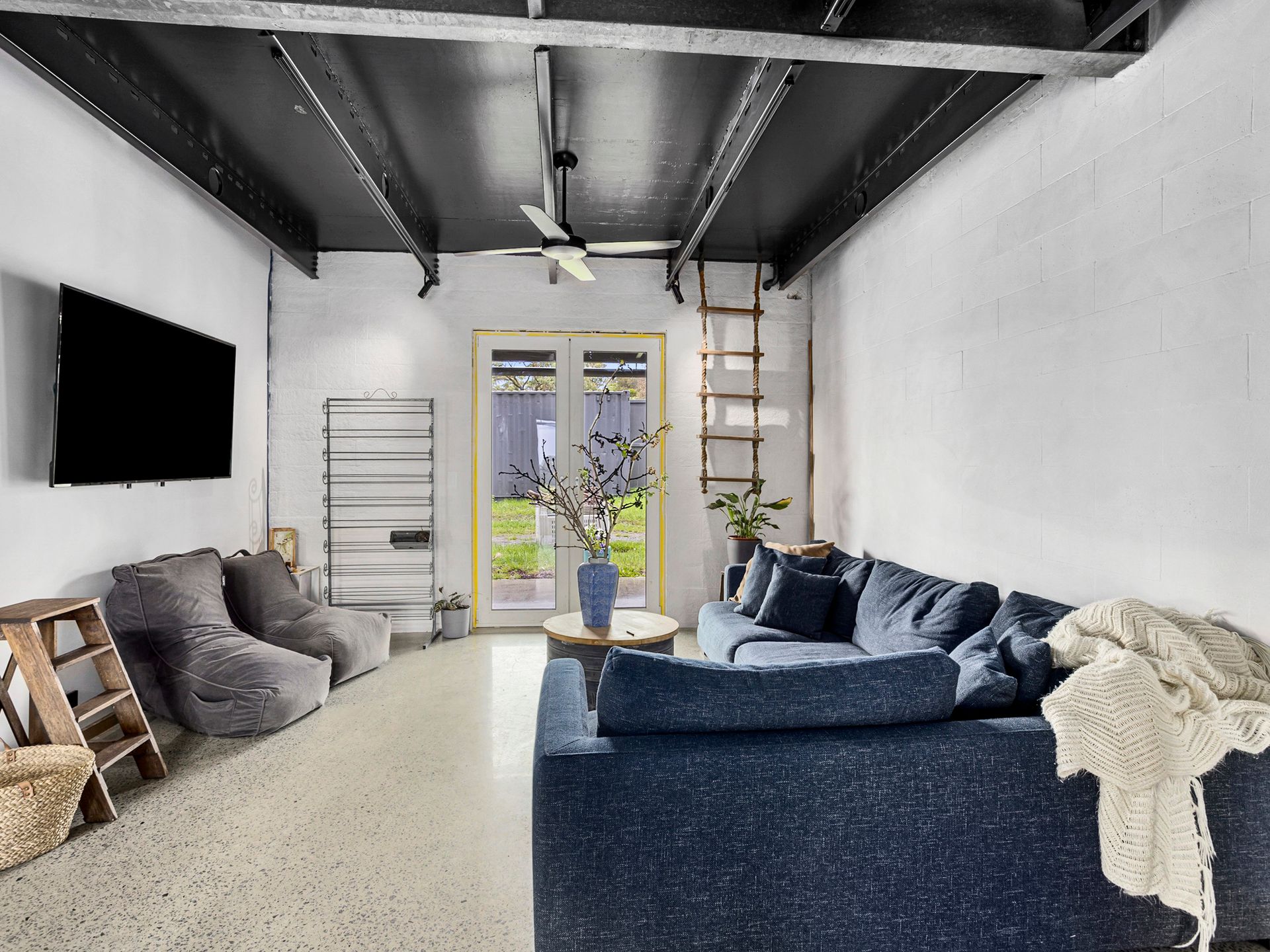 There is a Sonos move speaker with Bluetooth connectivity, a HDMI connection on TV, and a large flexible space for meeting conferences.