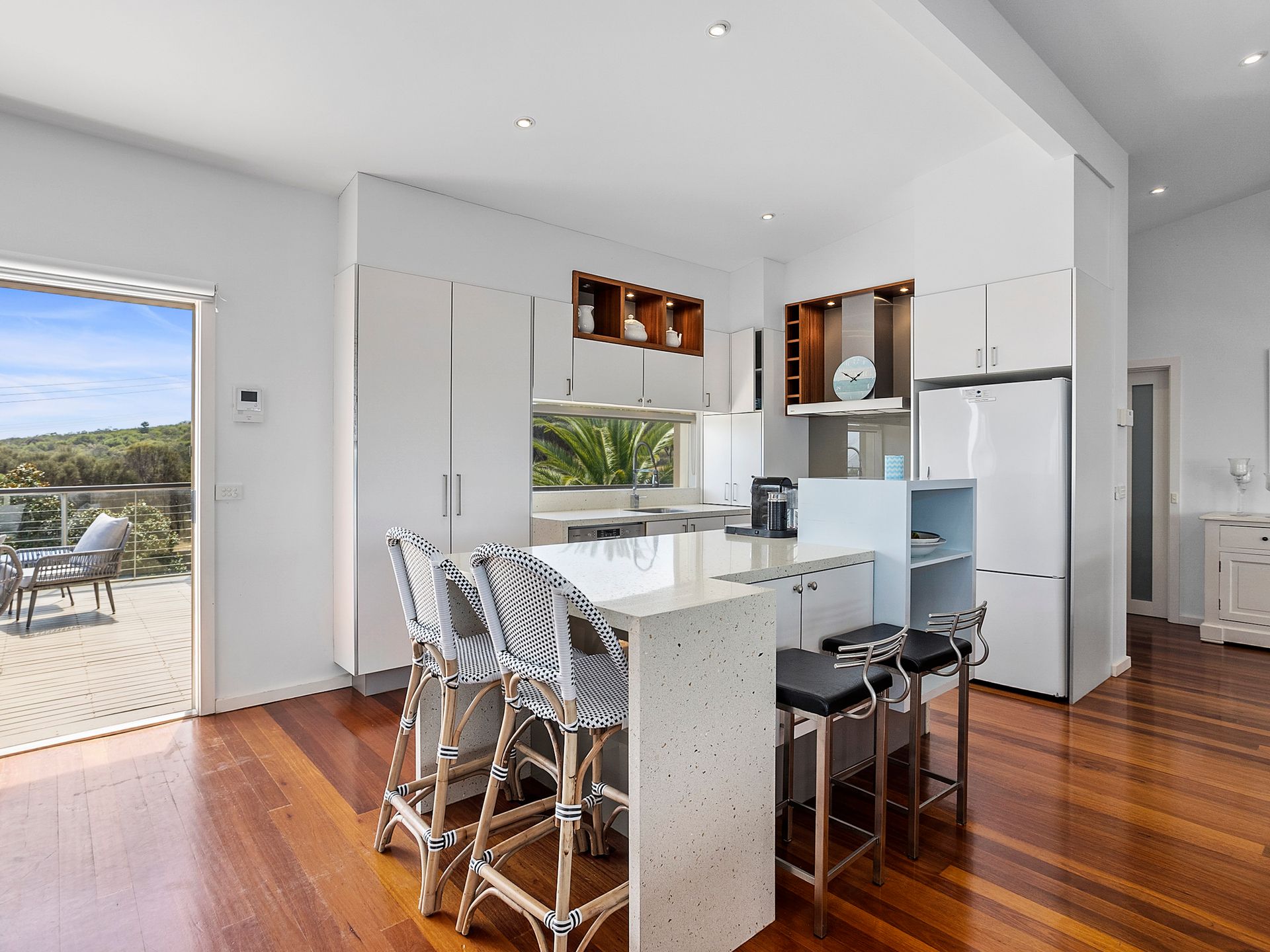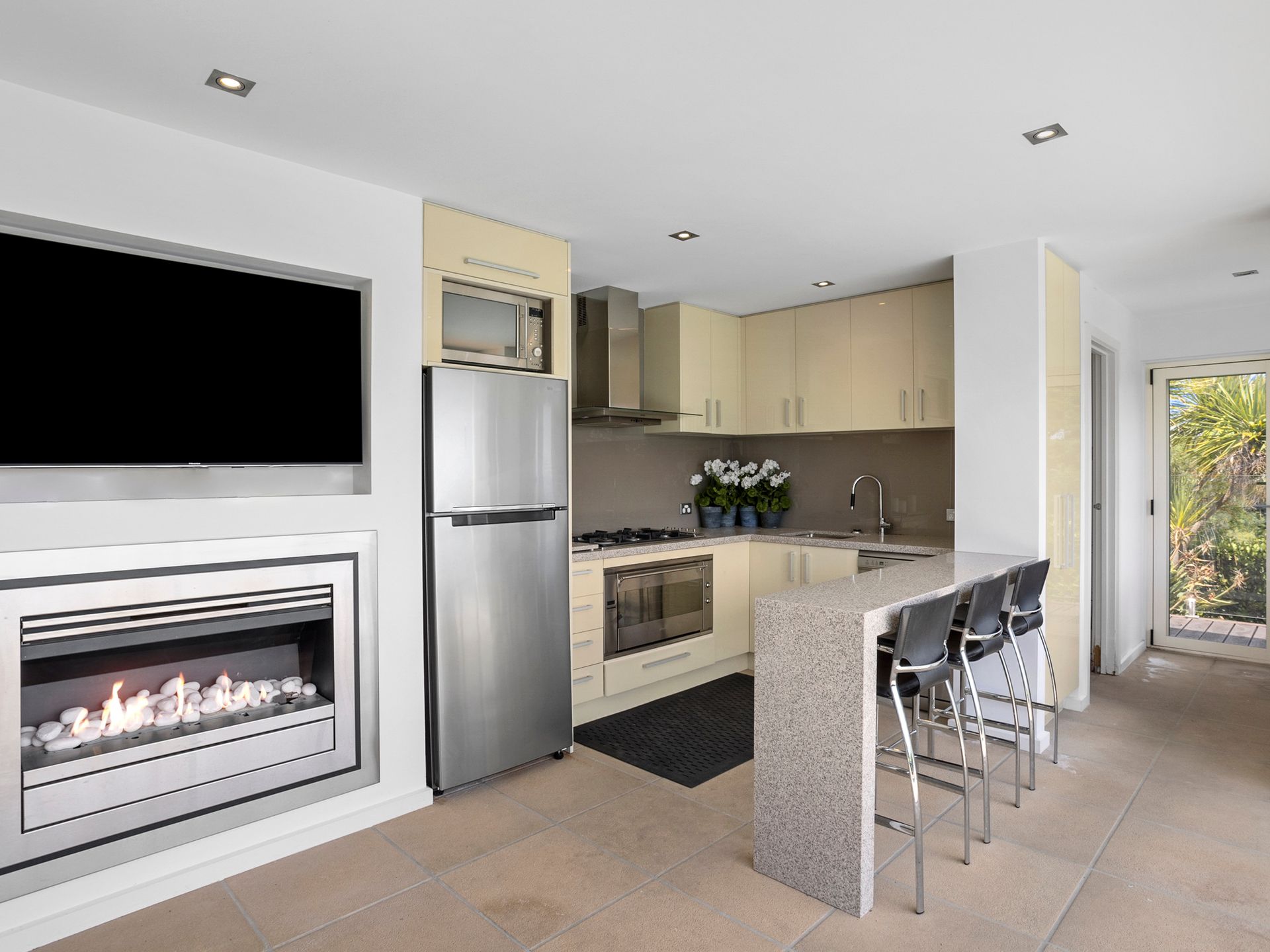 The kitchen has Island bench with 2 stools, all modern appliances including Coffee Machine (Delonghi Pod) and microwave.