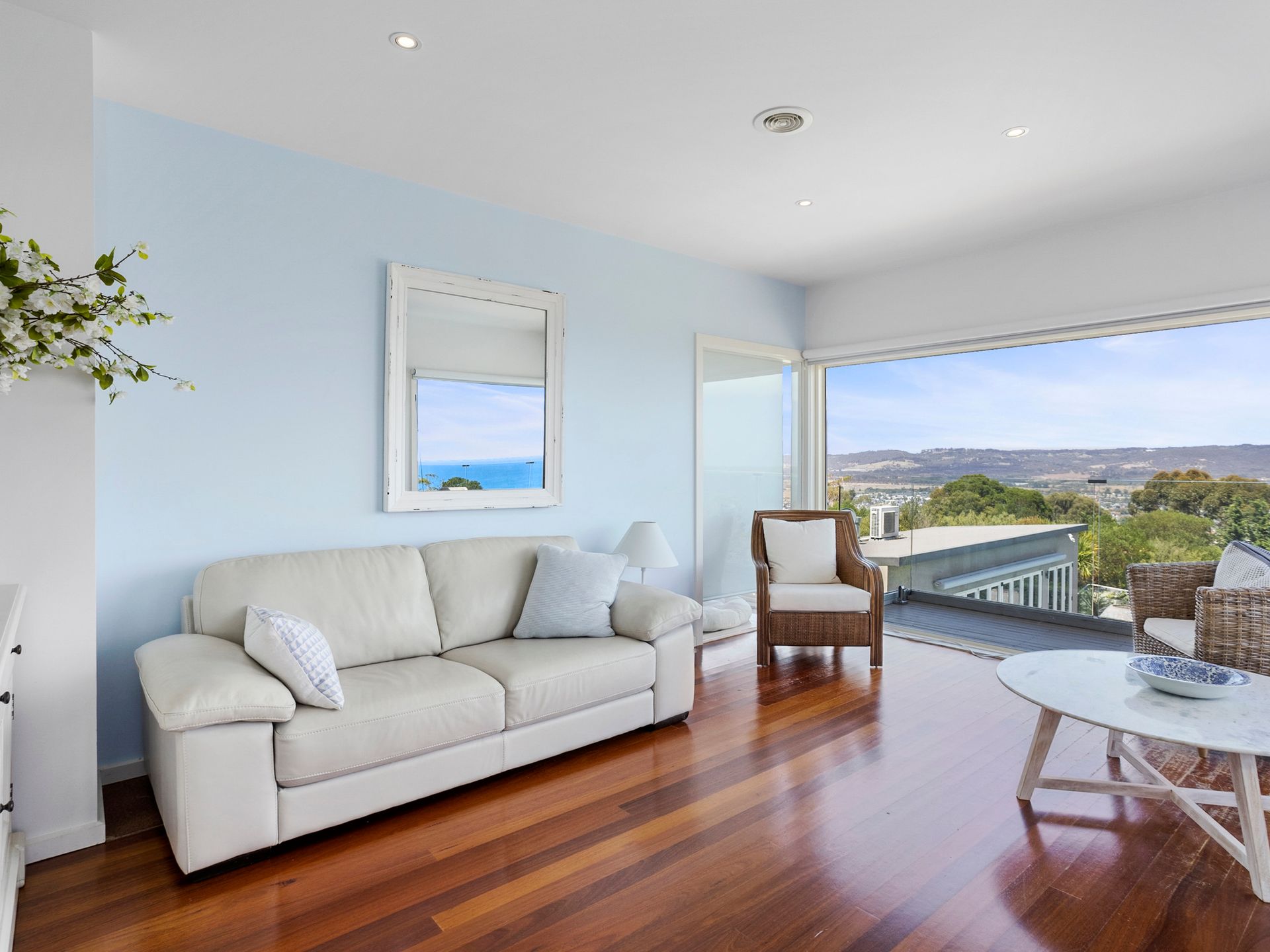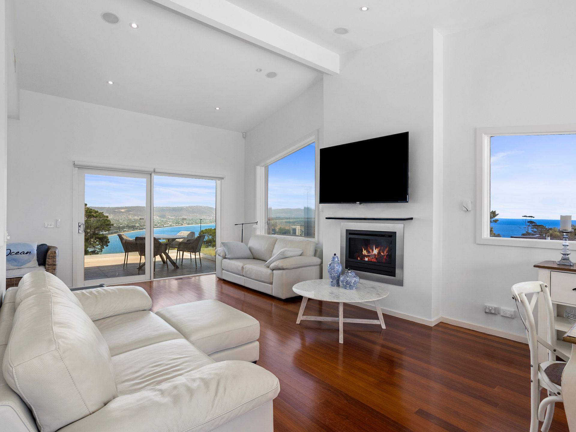 Living area has couches and chairs, large wall mounted Smart Tv, gas fireplace and opens to rear balcony with table and chairs and panoramic views of the bay and the pool, spa and back lawn.