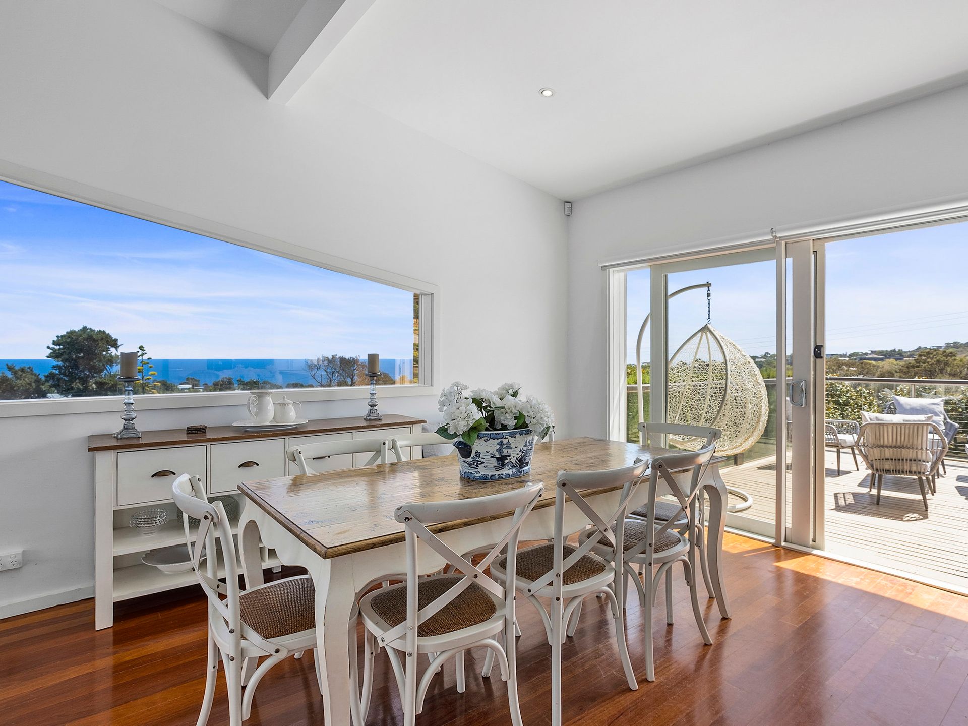 Dining seats 8 - 10 guests and opens to front balcony with chairs and table.