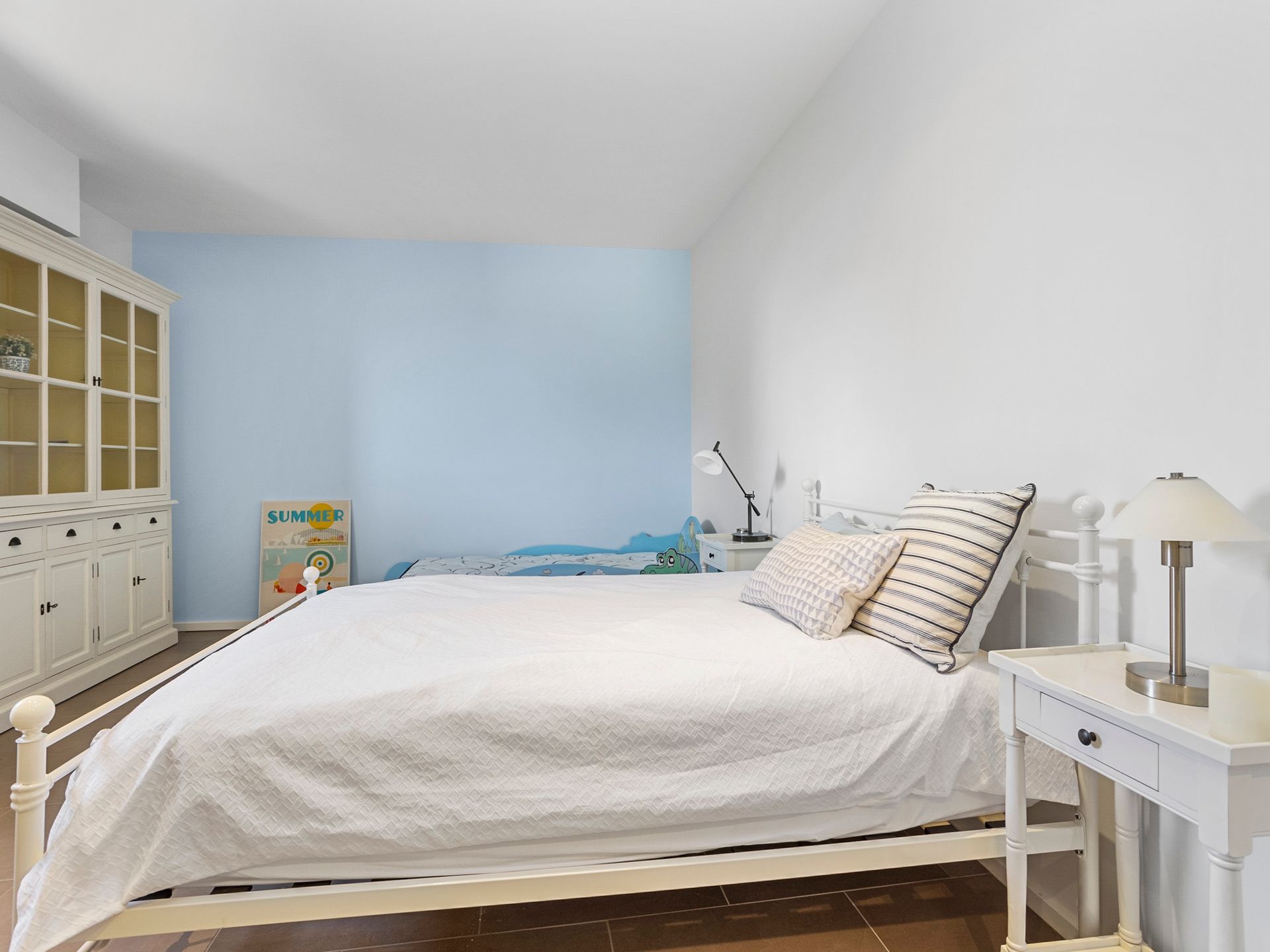 Bedroom 2 - Queen Bed + Single Bed - split system with view of pool deck