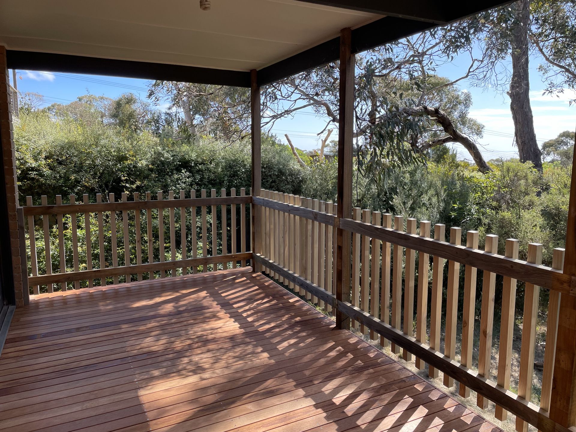 Outdoor undercover deck / balcony has Bay glimpses with large Dining Table , outdoor couches and 5 burner Bbq.