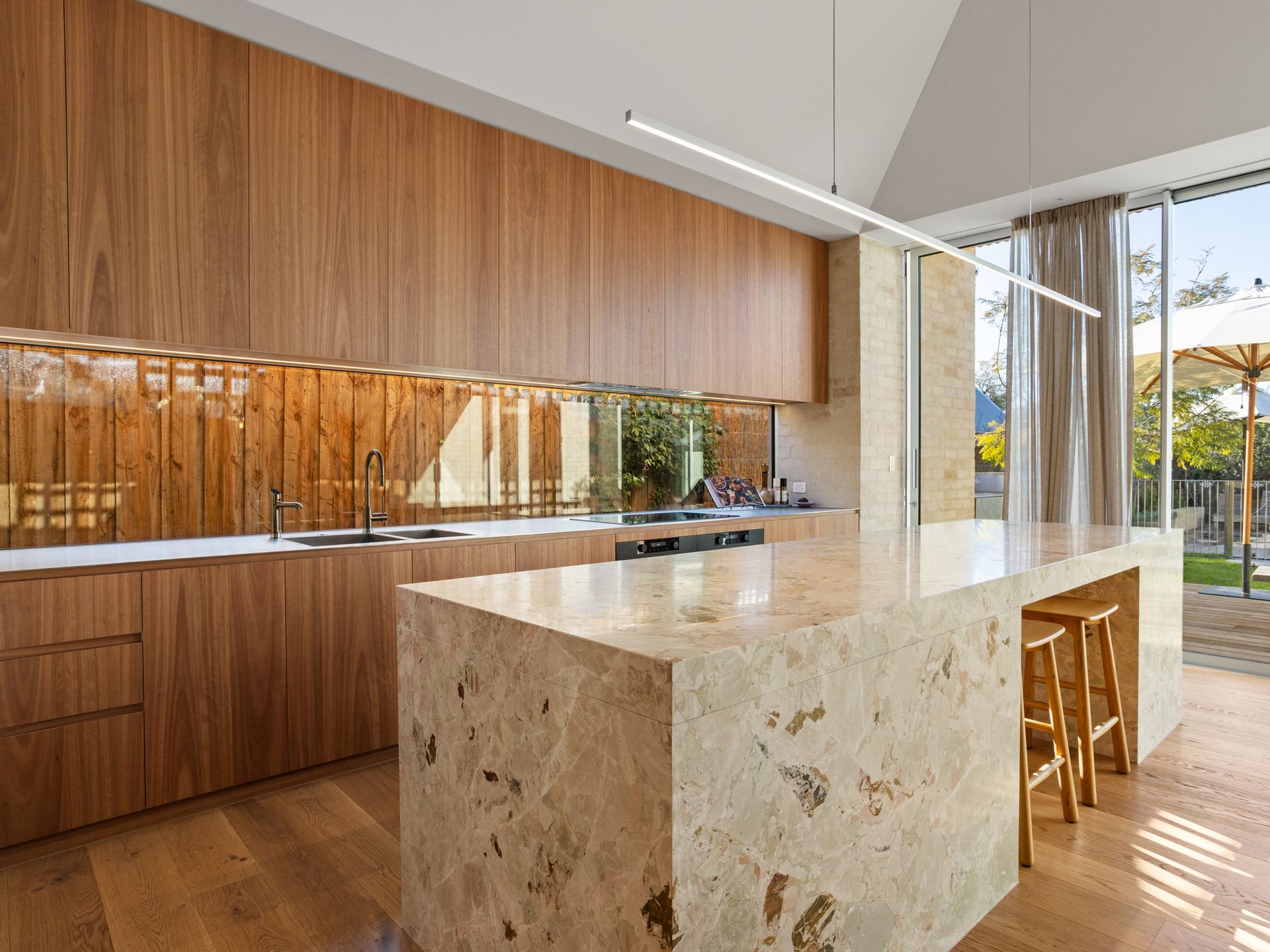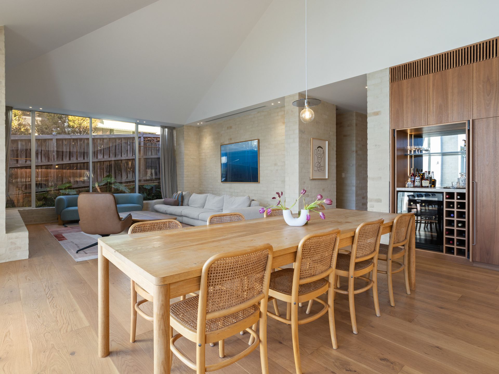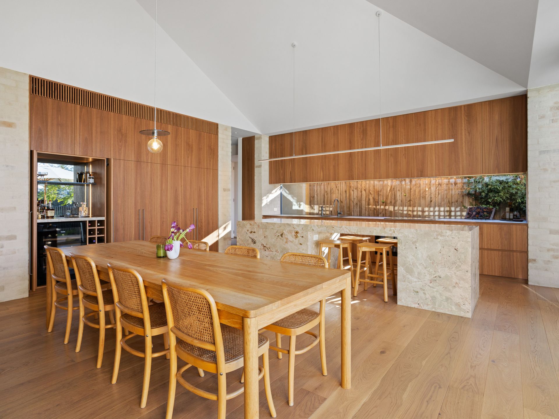 The designer kitchen is equipped with custom timber cabinetry, a striking natural stone island bench with 4 stools, premium appliances, and a fully appointed butler’s pantry. Flowing seamlessly into the dining and lounge area, the space is filled with natural light, soaring ceilings, warm timber floors, and features a built-in bar, wine fridge and Breville Coffee Machine — perfect for entertaining.
