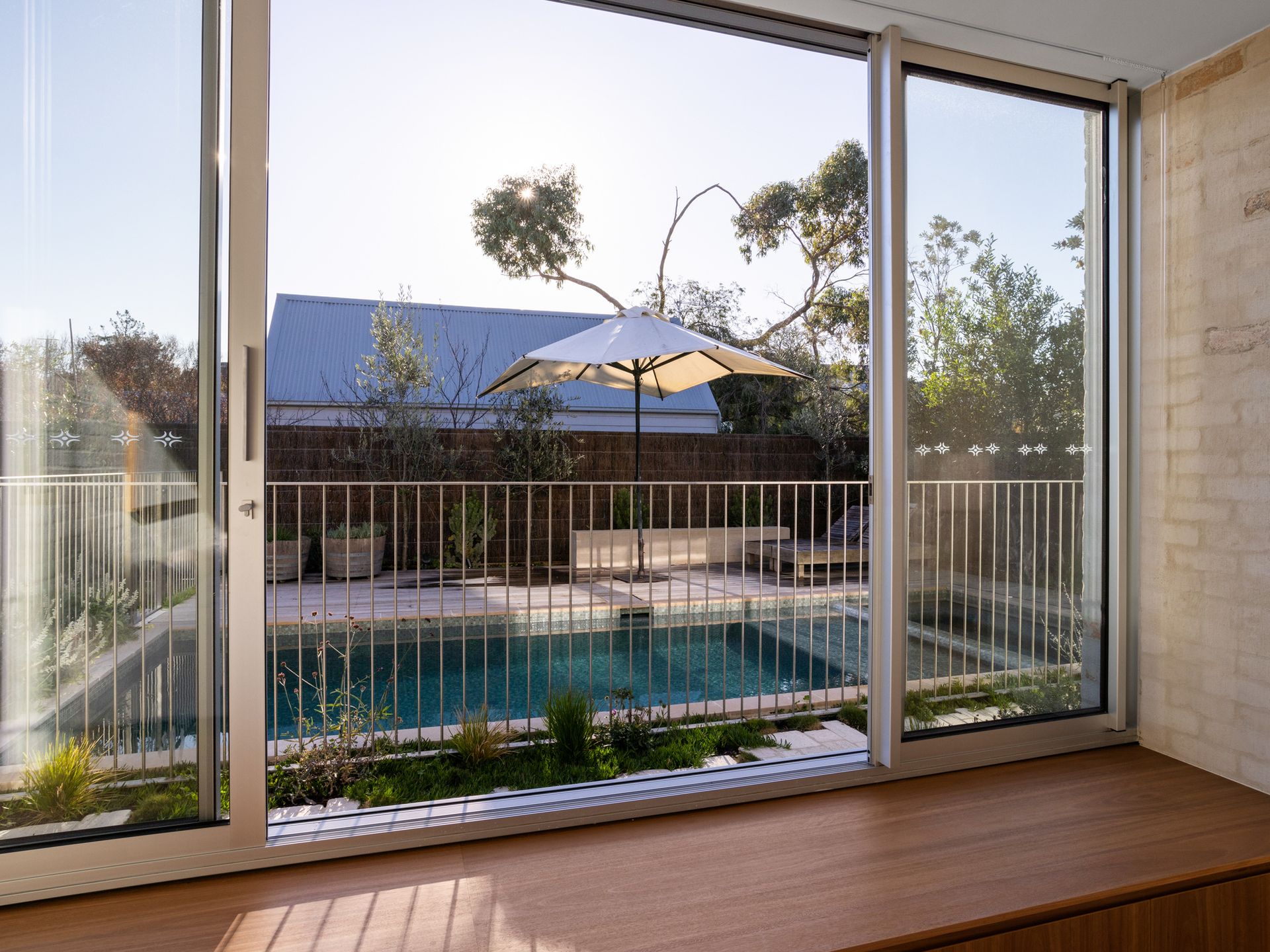 The private, enclosed garden features a solar-heated swimming pool and a gas-heated spa, complemented by a large deck with a four-burner Bbq, outdoor table and bench seating, poolside lounges, lawn, and sun umbrellas.