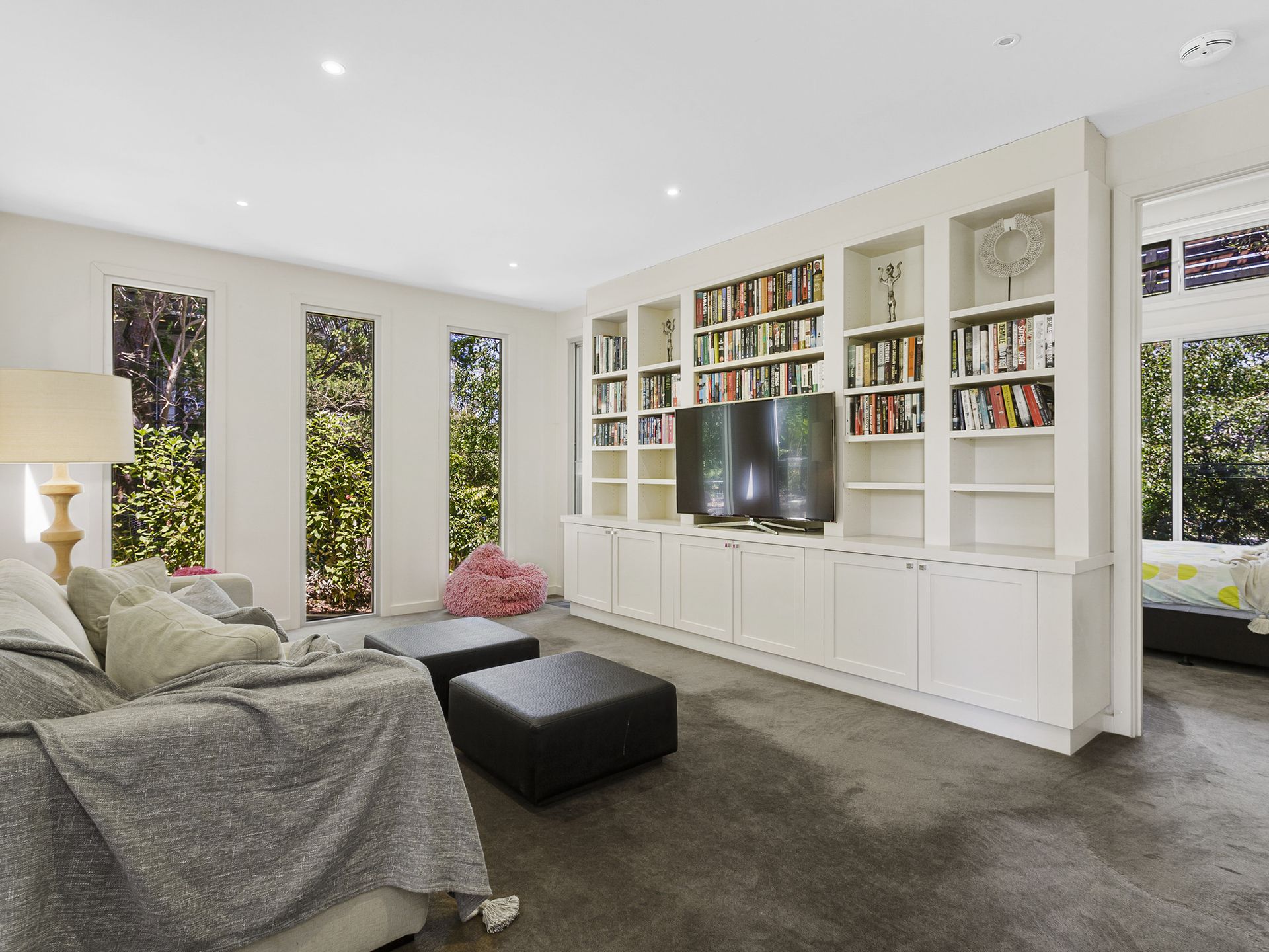 Upon entering the front door an exquisite grand piano introduces you to the modest large light filled open plan dining area and galley style kitchen with a long low window showcasing the lush manicured back garden.