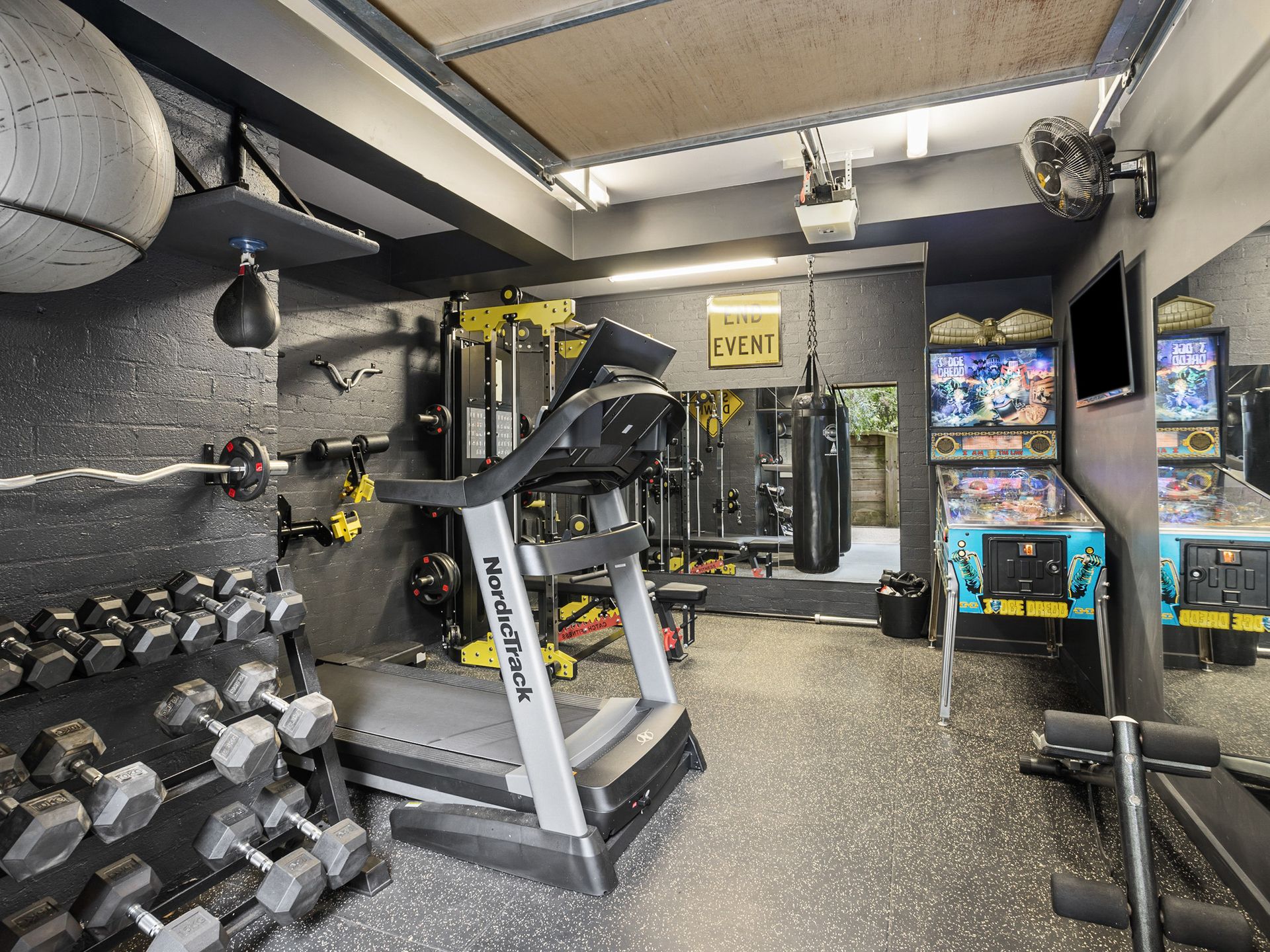 House has a private gymnasium with all new equipment, tv + pinball machine