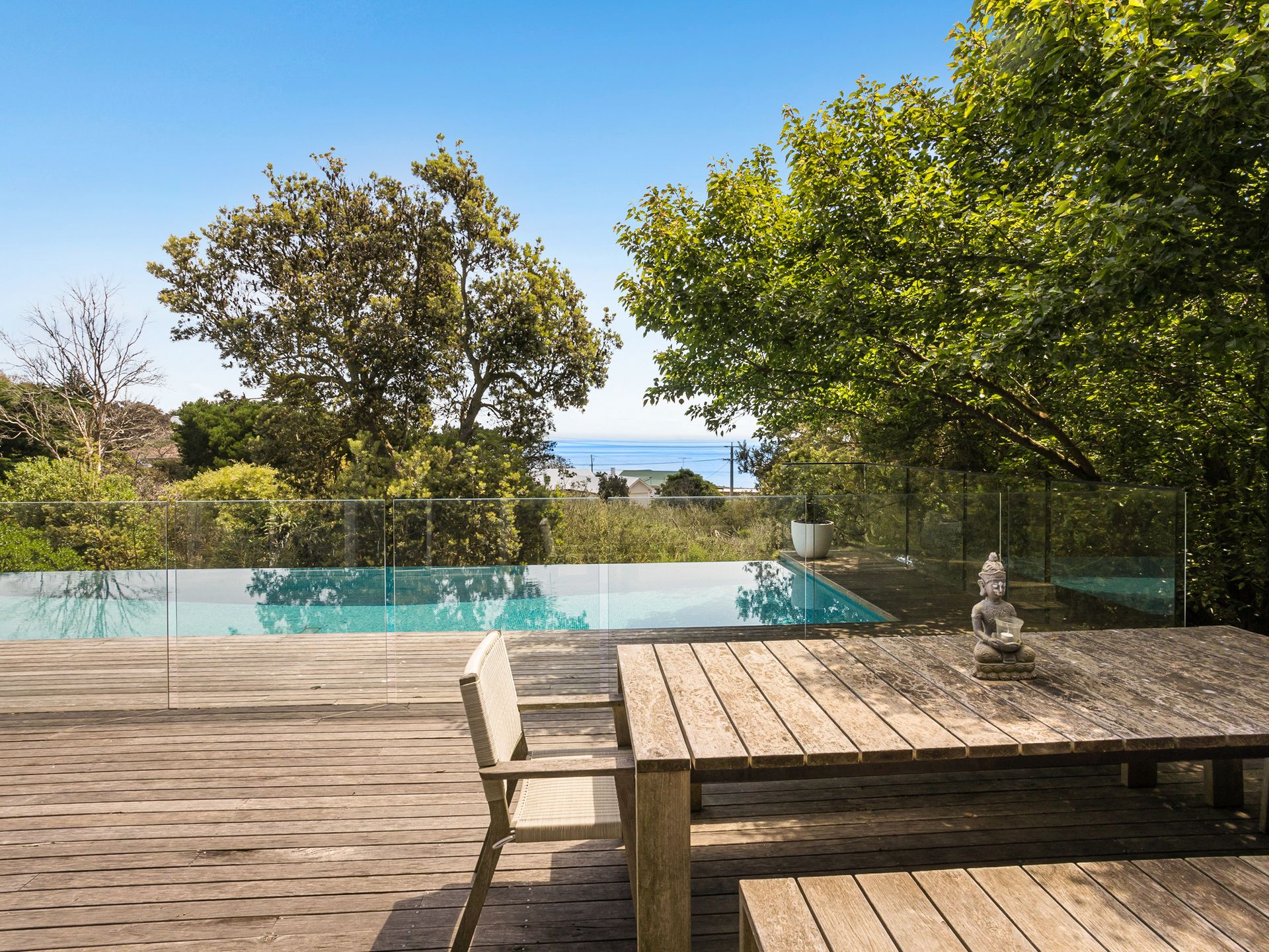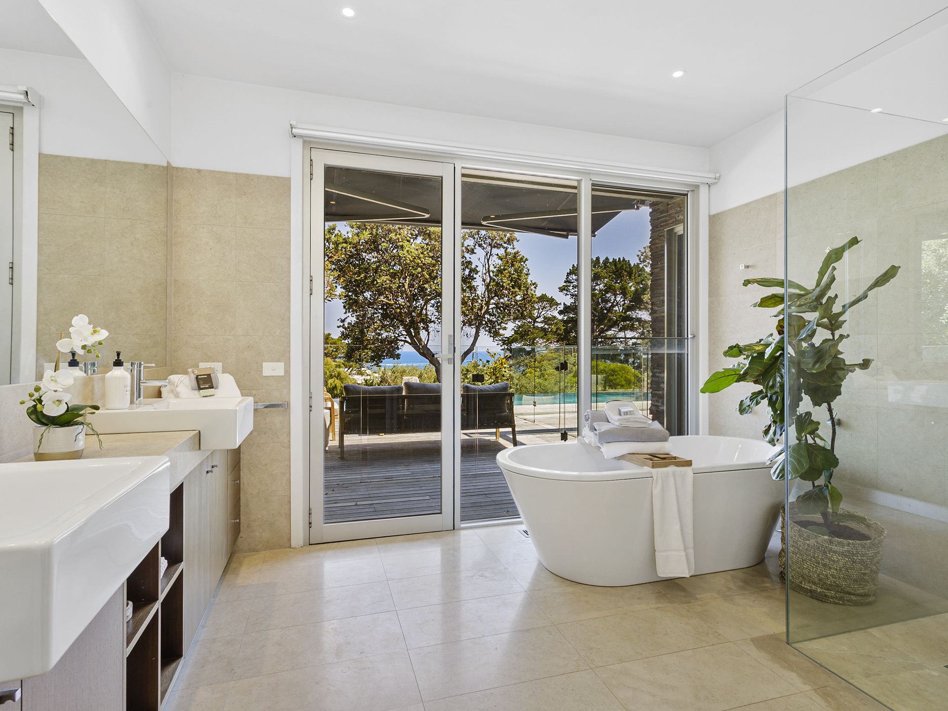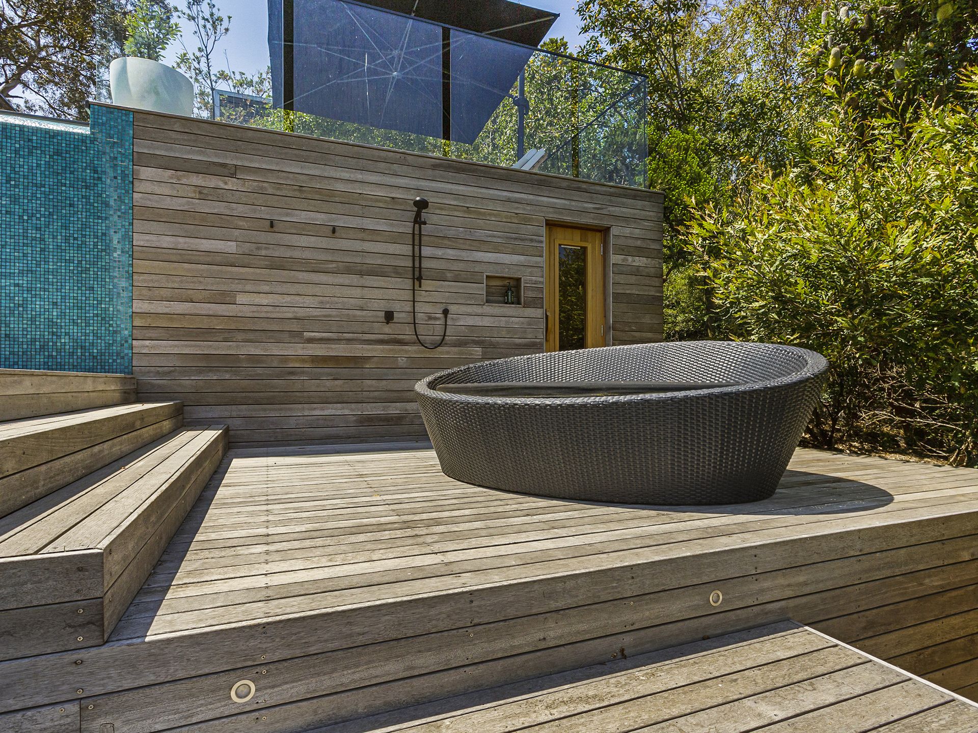 Entry to the house is via a long tree lined driveway which has parking for 4 cars. Up a flight of stairs, you are immediately greeted with a large infinity mineral pool and spa overlooking the front garden which also features bay views. Lower deck of pool has a Sauna, outdoor shower and BBQ with bar fridge and sink.