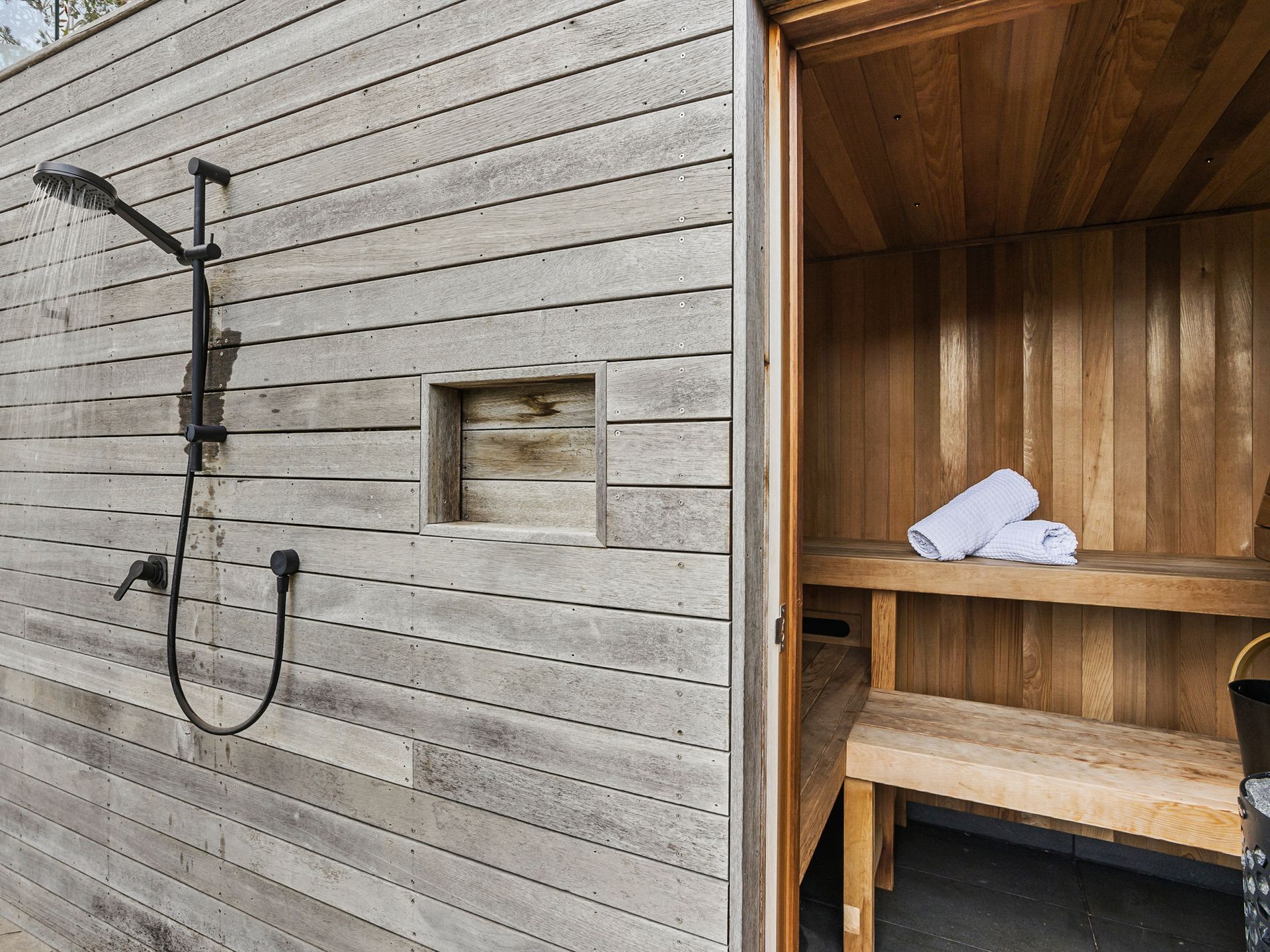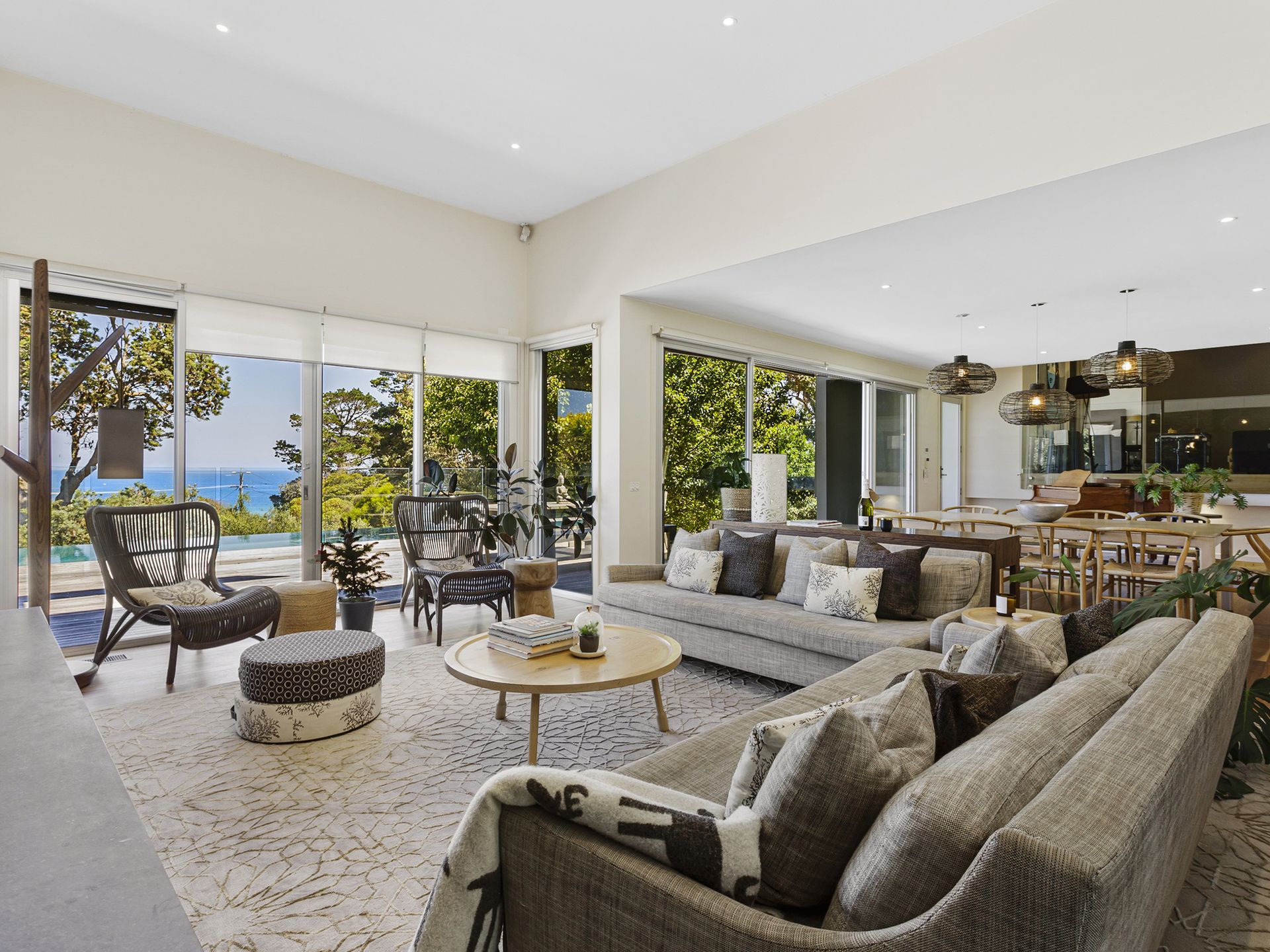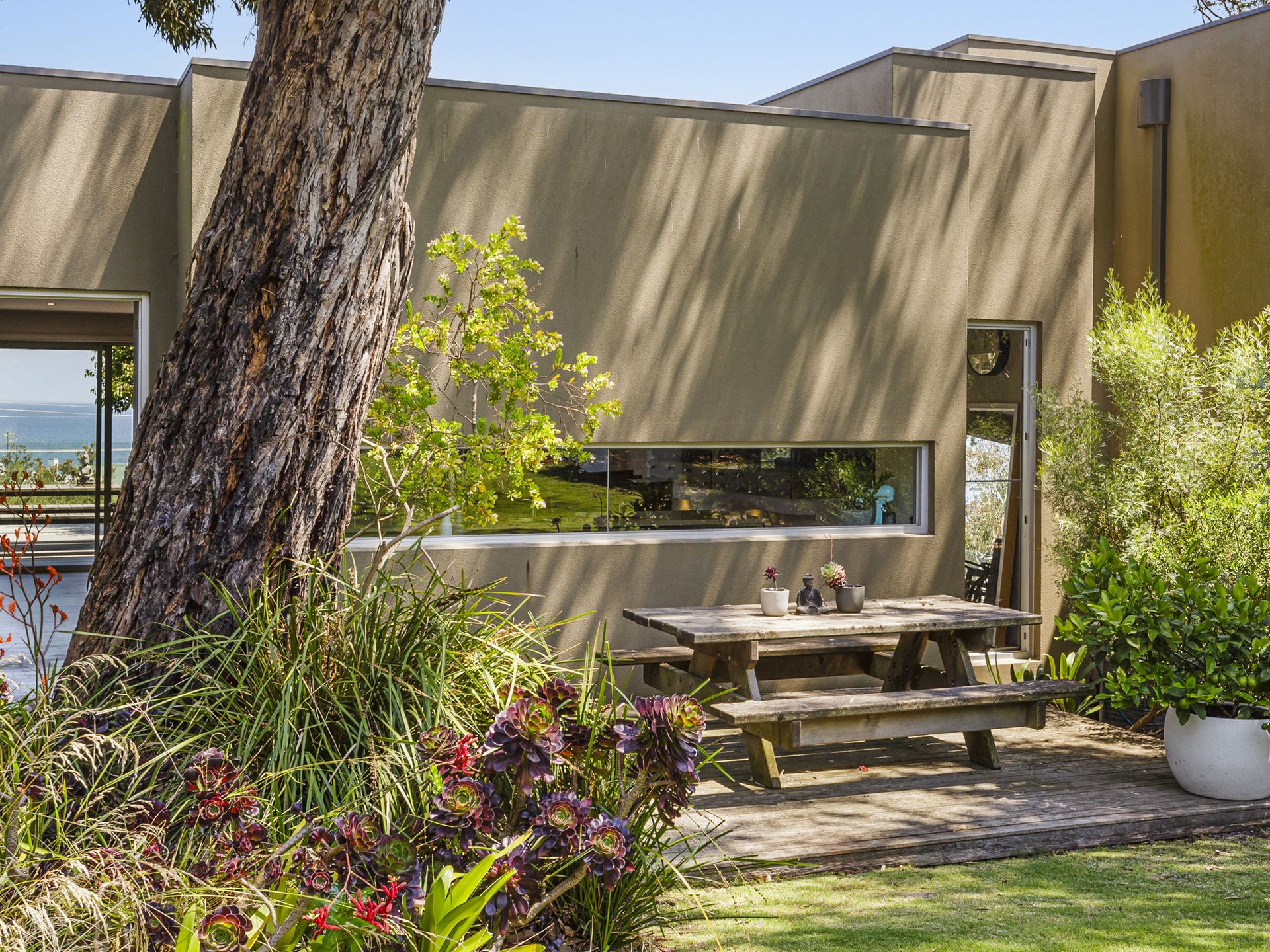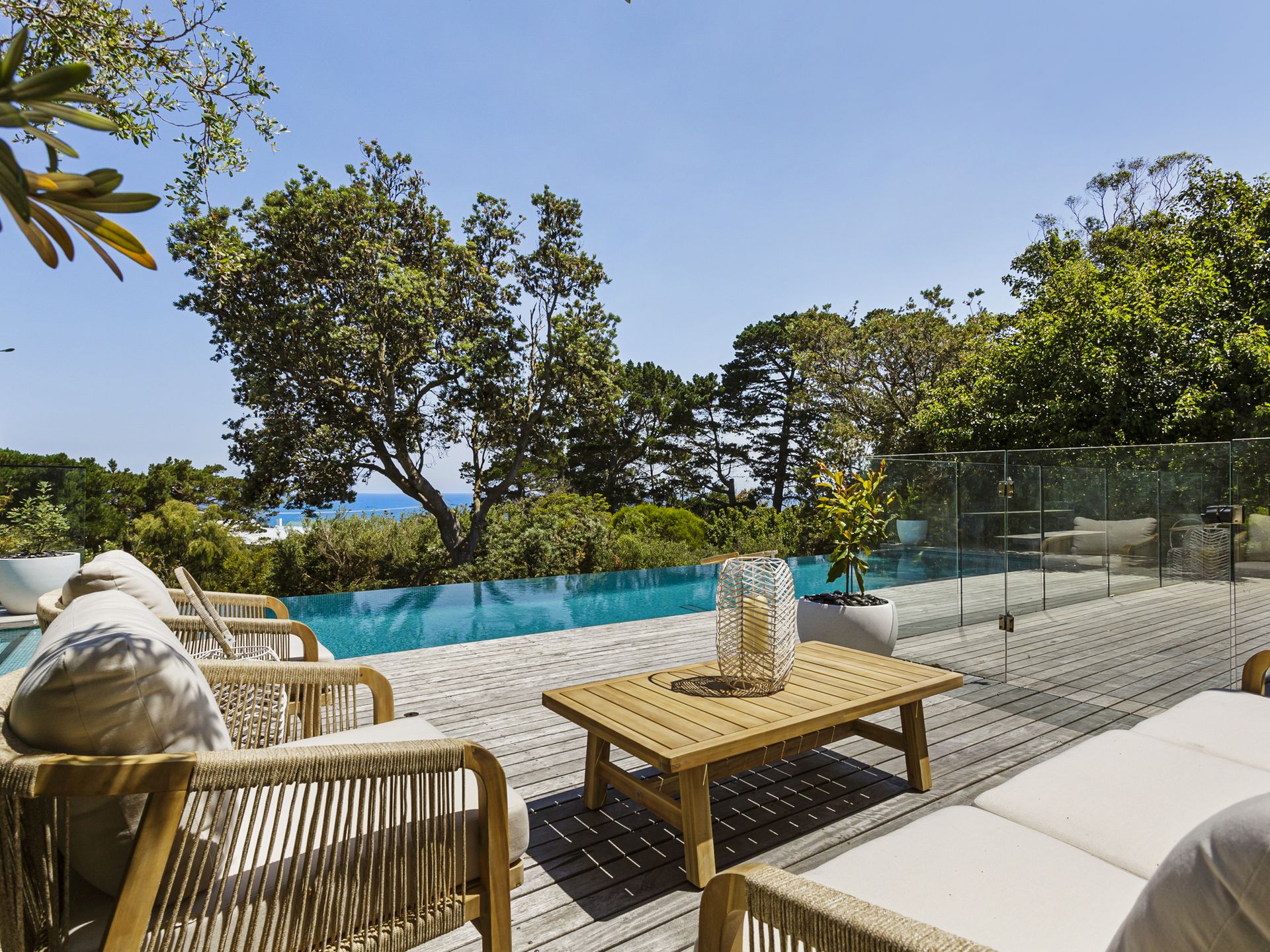 Entry to the house is via a long tree lined driveway which has parking for 4 cars. Up a flight of stairs, you are immediately greeted with a large infinity mineral pool and spa overlooking the front garden which also features bay views. Lower deck of pool has a Sauna, outdoor shower and BBQ with bar fridge and sink.