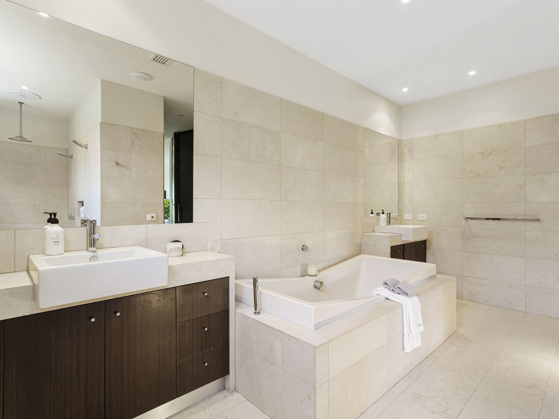 Down the hallway there is a large family bathroom with heated floor overlooking (and access to) the pool deck, with shower, double vanity basins and large free standing bath and a separate toilet.