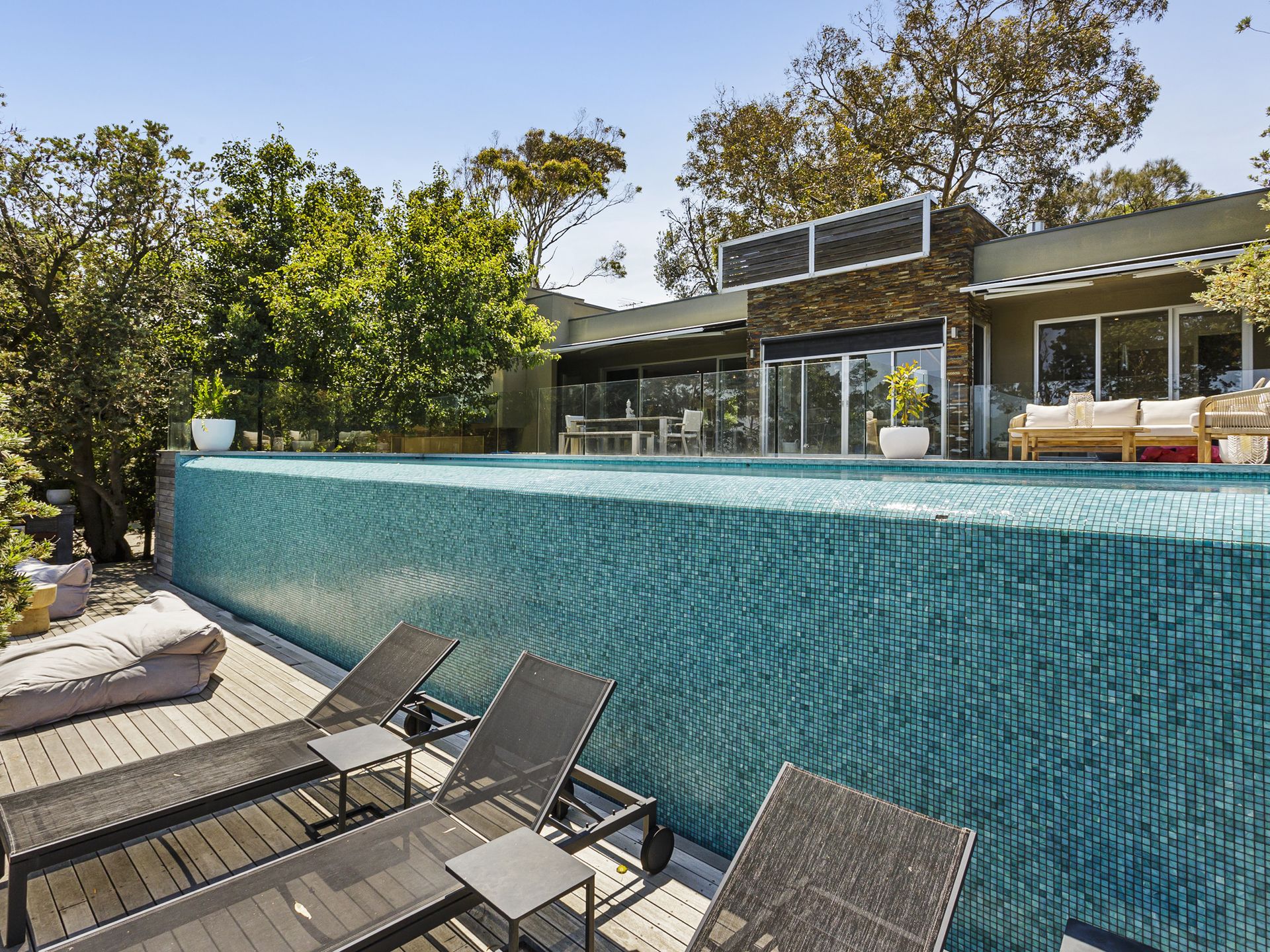 Modern single level 5 bedroom house with infinity pool, spa, sauna and in ground trampoline situated only 300mts to popular South Beach in Mt Martha.
